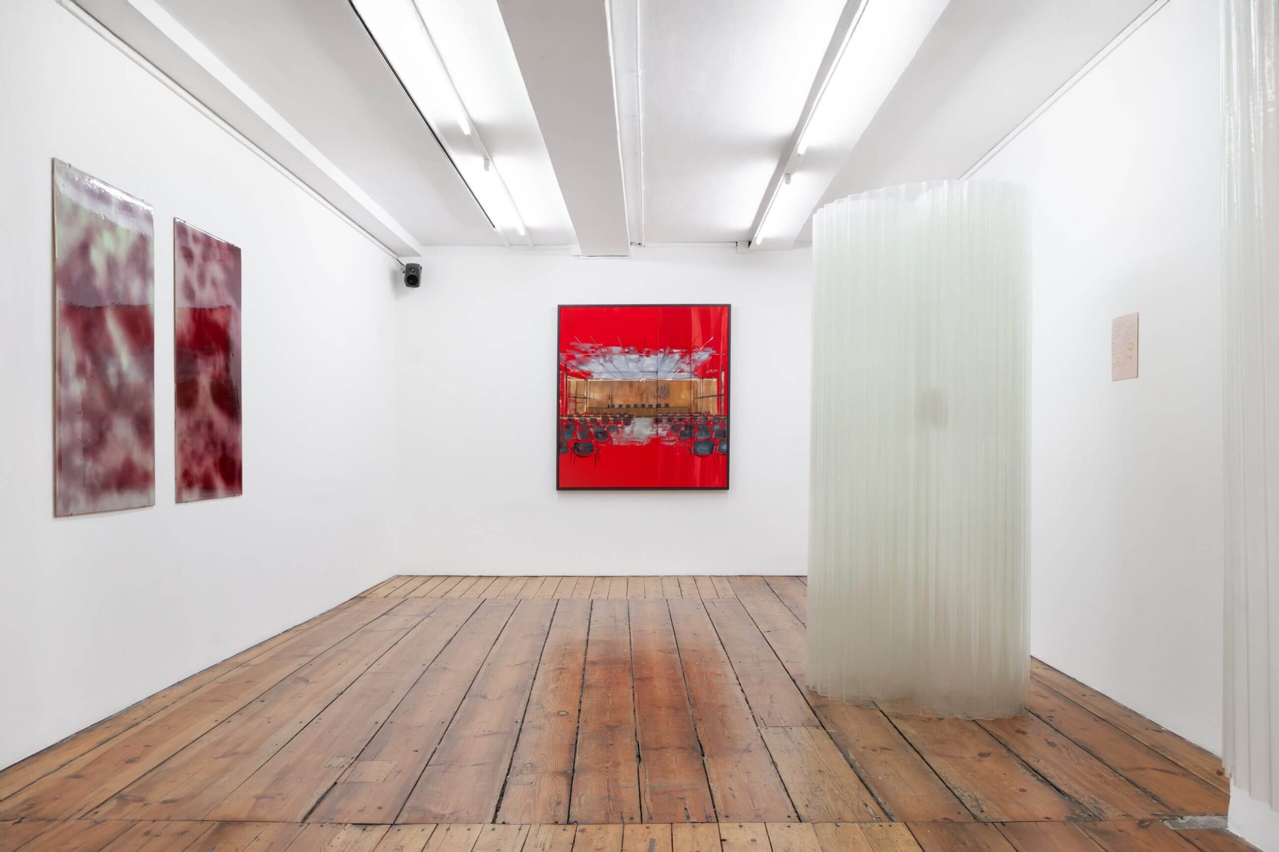 The gallery doesn’t offer a single entrance into meaning, it unfolds like a weave, threads slipping in and out of coherence. Some works gather close; others keep their distance, quietly refusing resolution. We felt drawn not to a focal point, but to the relationships between the pieces. Each work seems to glance sideways at another, murmuring agreements, or perhaps disagreements. There is no didactic path here, only a rhythm of approach and withdrawal.