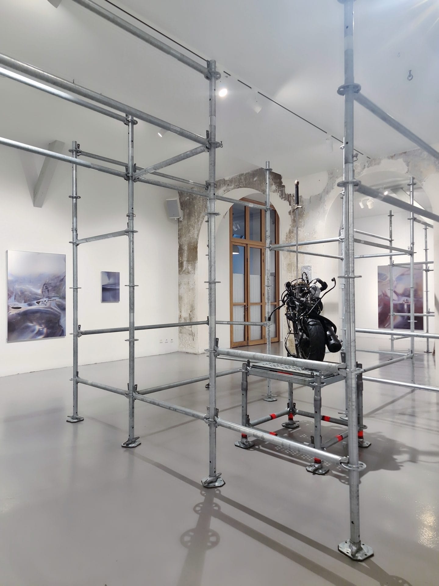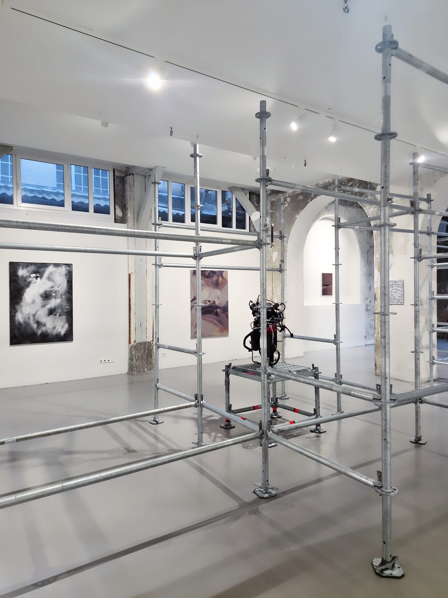 From the very entrance, a sensation of immersion takes hold. The gaze sharpens, footsteps slow, ab- sorbed by a plastic dispositif that functions as a coherent whole: every element vibrates, resonates, and engages the entire body. The two-headed installation intrigues, unsettles, and defies categorization, an immersive construction that resists immediate naming. Alexandre Bavard and Arthur Hoffmann lead us on a meandering journey through reconstructed lands- capes and reinterpreted urban zones. They sketch a fragmentary map of the city—its interstices, voids, wastelands, empty spaces, suspended construction sites, and buildings consigned to oblivion. Between ruins and margins, they advance like tireless surveyors, urban navigators exploring cities as shifting ar- chipelagos or as fields of experimentation and play. In V.O.I.D., the two artists delve into the concept of the non-place, dear to Michel de Certeau and Marc Augé—transitional, neutral spaces without social or historical anchoring. These places of waiting, erasure, and in-betweenness are revealed here as thresholds, thresholds of experience and sensitive reactivation. Upon entering the gallery space, one is confronted with a monumental scaffold, a true tubular mesh. A latticed grid, almost evanescent, through which the gaze both passes and is contained. Here, flee- tingness is questioned, as well as imbalance and the constant tension between stability and precarity between balance, fragility, and the ephemeral. These scaffolds become playful modules, to traverse, approach, and momentarily inhabit. They or- chestrate random paths, prompting the viewer’s movement, transforming them into a spatial actor. The space is manipulated like a drawing stretched into three dimensions between surface and volume, plane and sculpture, center and periphery. Evoking Sol LeWitt, the grids become matrices, the surfaces sup- ports for memory : graffiti, scars, incisions, urban imprints and traces. The dialogue between the two artists invites us to traverse overlooked zones, to rediscover spaces filled with memory or forgetfulness, where intimacy and historical traces intertwine. They collect found objects, raw materials, everyday fragments, or digital artifacts, in a quasi-archaeological, obsessive approach. In this sensory experience, their works interweave materials that are sometimes rough, sometimes sub- tle, echoing these “non-places” full of hidden potential. The exhibition space becomes a laboratory, a threshold of transformation. Hoffmann and Bavard orchestrate a delicate choreography fusing presence and disappearance, accelerations and slow motion. At the intersection of the living and the mechanical, they capture the friction of the world, the subtle metamorphoses of the real.