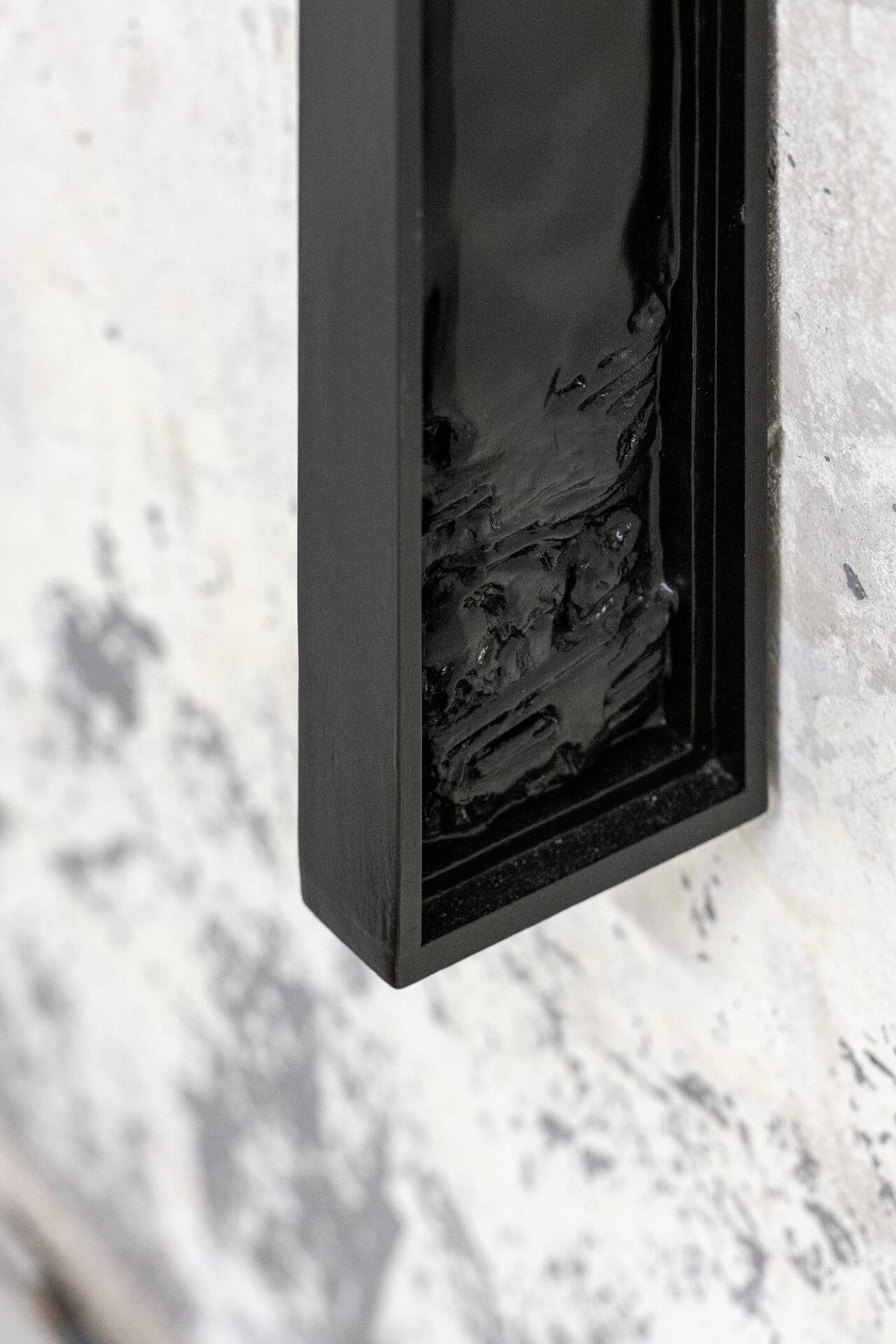 The setup is quiet, but not calm. Flickering lights reflect on rough surfaces, casting shadows that seem more solid than the works themselves. The mood is part shrine, part laboratory. Every piece, a fragment, a bone, a reflection, feels placed not to show itself but to hint at something missing. This isn’t a show to walk through quickly, it asks to be studied, watched slowly, almost listened to. The works aren’t arranged to tell a story but to infect the space. The viewer becomes a quiet witness, drawn into something already underway. The artworks don’t speak to each other directly, they reflect, distort, and sometimes cancel one another out.