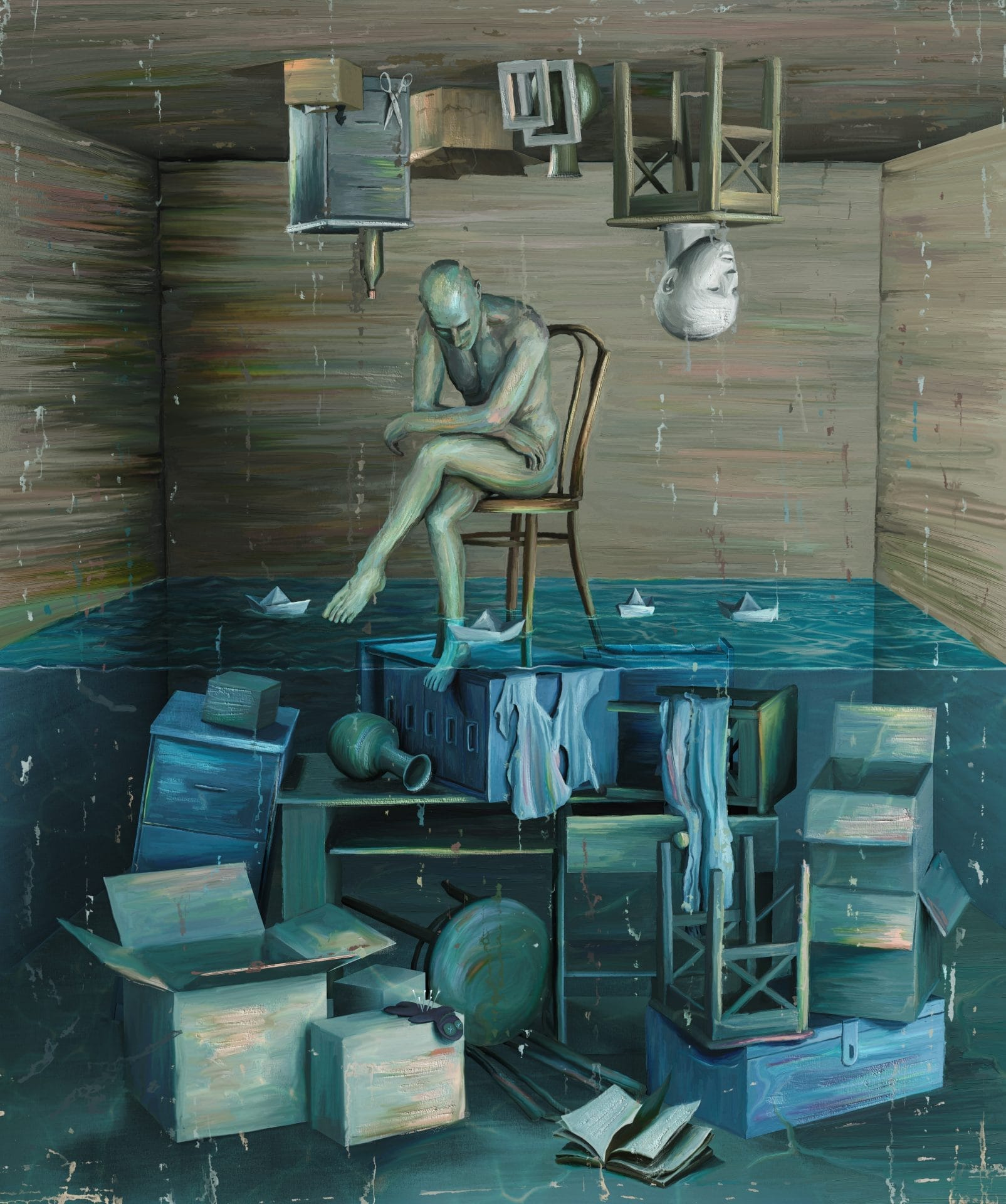 The subject, seated amidst a flooded room, is surrounded by objects that suggest a life both submerged and suspended by the disorder. The water in a way symbolizes the overwhelming and uncontrollable nature of OCD, while the scattered and floating objects—a mask, a chair, books, and even the architectural disarray—reflect the fragmented and chaotic mind affected by this condition.
