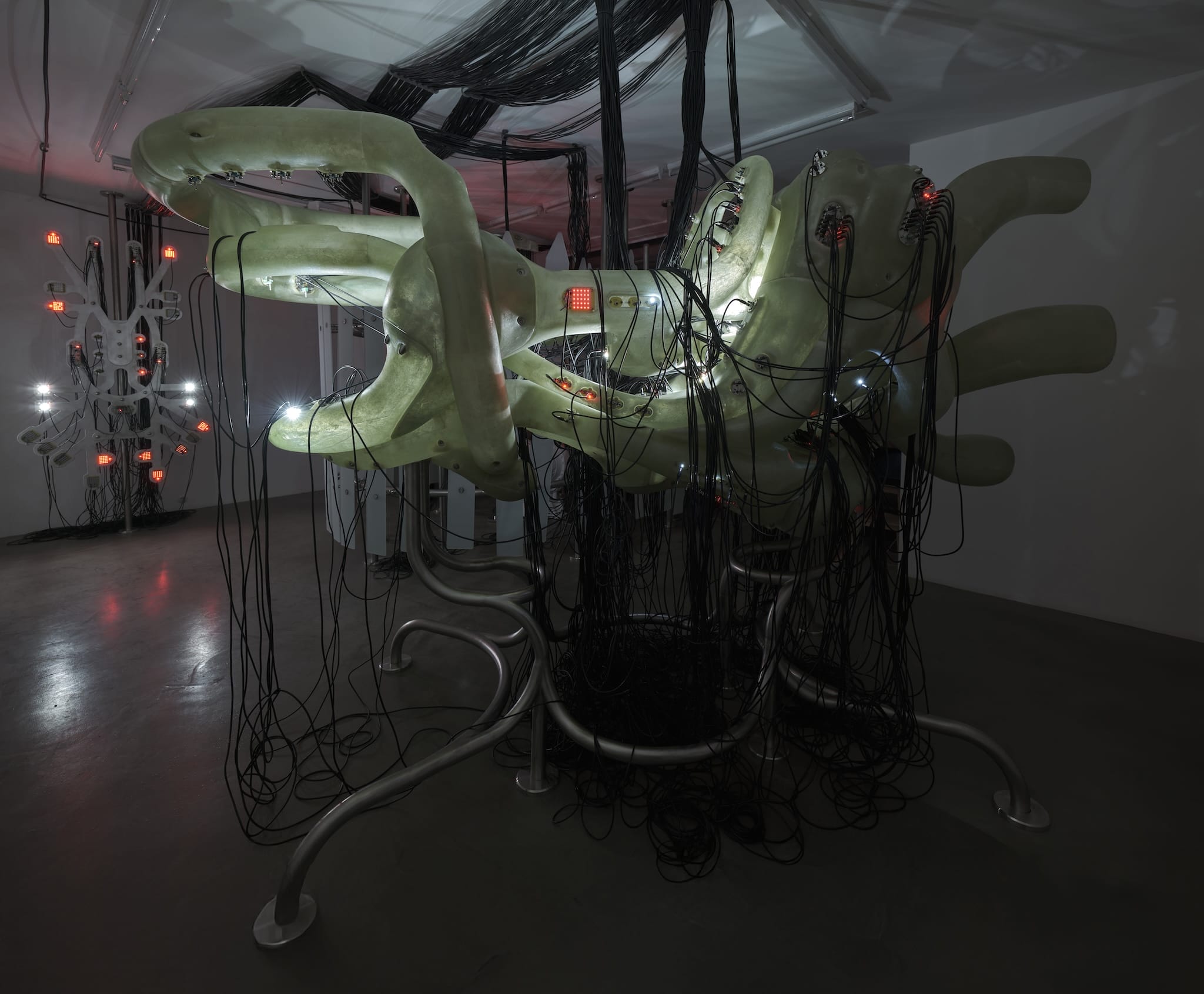 my home is a nest, my home is a shelter my home is a haven If I were home, I would envelop my human keepers in a warm, womb-like embrace—to shield them from the out-there. I would whisper secrets to the wires that run through the plastered walls and tell them tangled tales of transmissions from lesser homes, to build an environment that causes no pain. For one, I’d make sure that the router never lags, and the stove never runs cold. I would keep the bad vibes out and let the sunshine in. To see a bright world through my window eyes, to play and dance, to be reckless and wild. To watch you grow, all lush and vibrant like an olive tree—until it’s time to run freely. In ‘evim yuva’, an exhibition by artist Barış Çavuşoğlu, the home is a place of protection and refuge. Inspired by his childhood home, which Çavuşoğlu compares to a well-oiled machine, the exhibition consists of two central sculptures that borrow from the visual language of industrial design to reimagine the domestic sphere as a well-structured and self-regulated ecosystem, where everything functions as it should. Growing up with engineer parents, Çavuşoğlu has always been surrounded by all kinds of tools – CNC machines, injection moulding systems, lathes. The subsequent mise-en-scène presents a mechanised view of suburban life in the 90s, a nostalgic portrait of work and care through the lens of a robotic arm surrounded by a control unit, capable of two simple actions: pressing buttons and combing hair. Surrounded by a sanded glass partition made to resemble the wooden fence of a suburban house, there’s a clear divide between the safety of the indoors and the unknown that persists beyond the borders of the peaceful refuge – it evokes a false sense of security, which challenges the inner reality, and therefore blurs and jumbles its very existence. In contrast, the sculptures situated outside the fence break away from the hyper-constrained nature of the indoors – its futuristic yet organic form resembles that of a mecha from a Japanese anime, and hints at the creative potential that lies beyond the fantasy borders. Built from fibreglass and steel, the sculptures aren’t separate from the control room, but rather they are a product of the intricate system that made its existence possible. Everything is interconnected, both metaphorically and literally – through a sprawling network of wires – that suggest that each node is part of a great whole. Still, there’s an impermanence that permeates the exhibit. Pulling apart the mainframe to see a life that exceeds its initial bandwidth, the home might indeed be a nest – family bonds as essential as circuits and wires to a machine – yet there’s new realities that extend far beyond its four walls. “Although eventually realizing that this structured system wouldn’t last forever,” Çavuşoğlu concludes, “I still recklessly embraced my role as a child within it.”