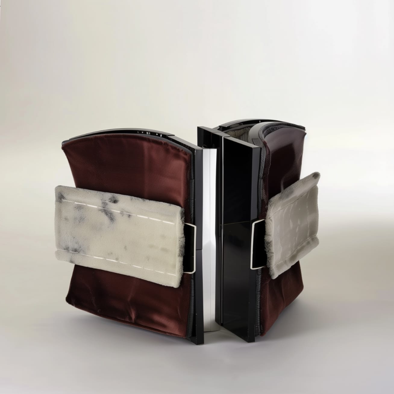 Fakewhale Studio contributes to the project with the piece “Untitled #53,” a digital artwork that reflects the integration of artificial intelligence in the creative process. Through algorithmic analysis of reference images, combined with generative synthesis, the piece explores new formal configurations while maintaining a constant dialogue with the original visual models. The result is an object that challenges conventional categories, combining contrasting materials like reflective panels and fabrics, and marked by structural complexity that questions the balance between aesthetics and functionality.