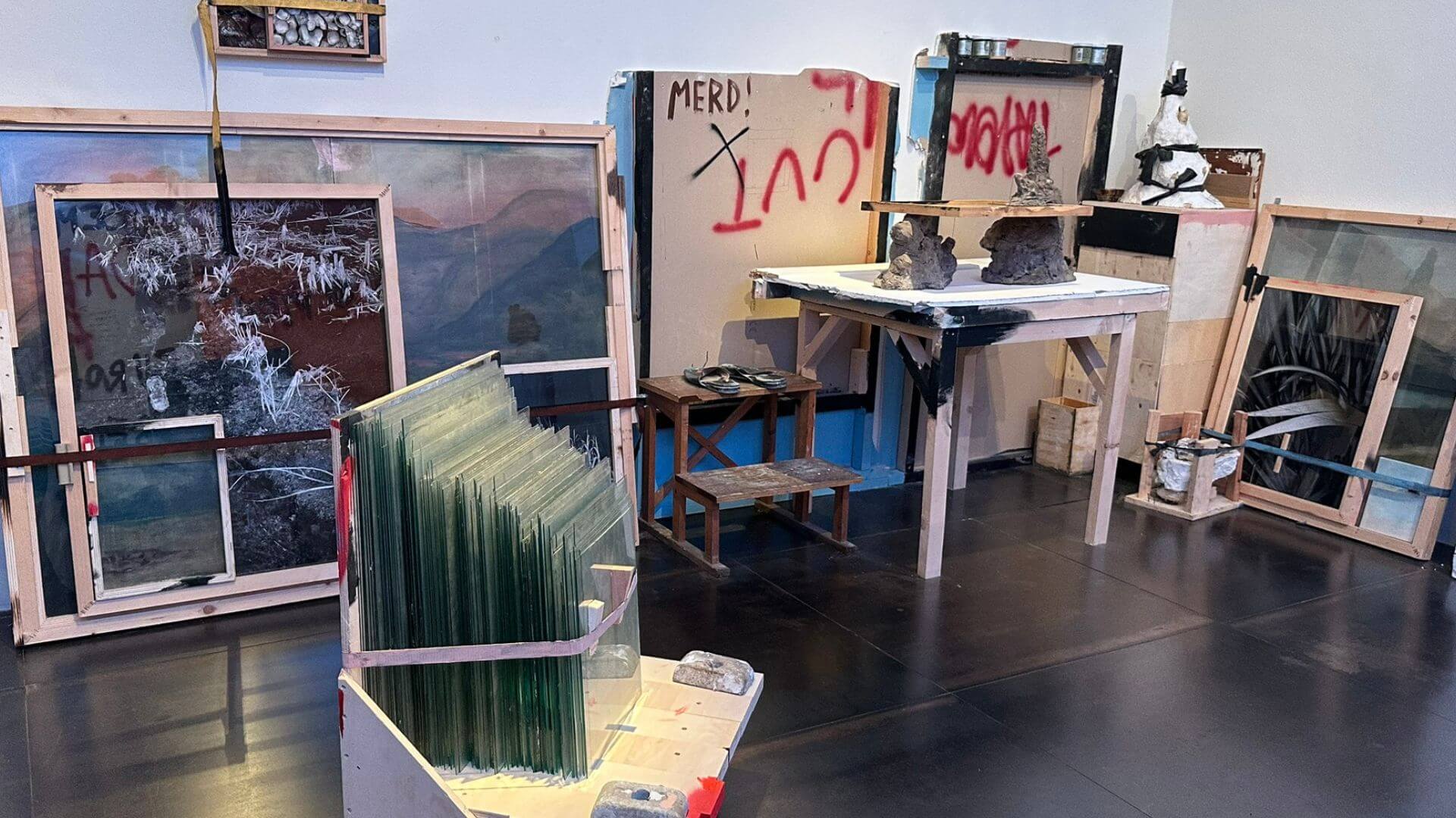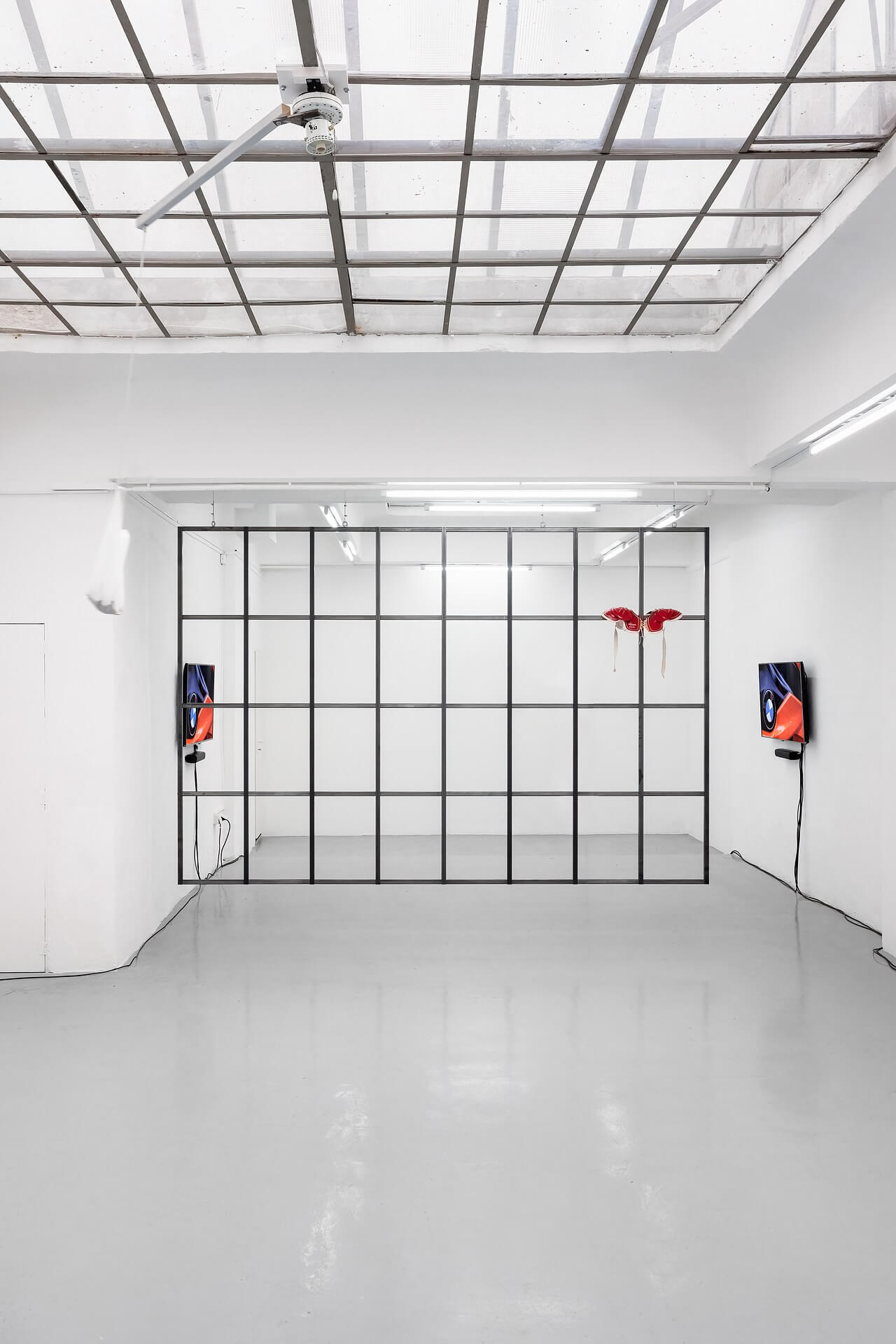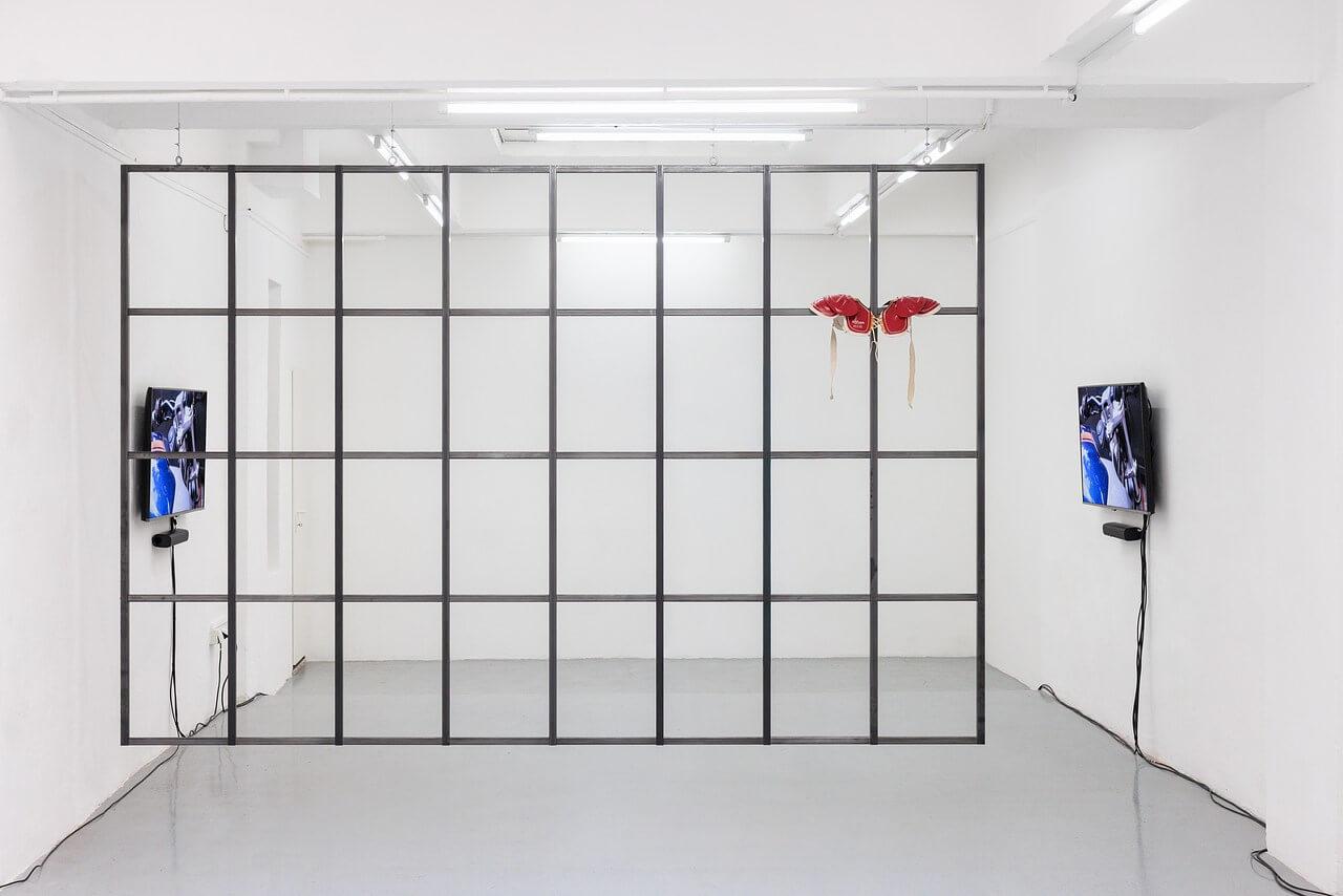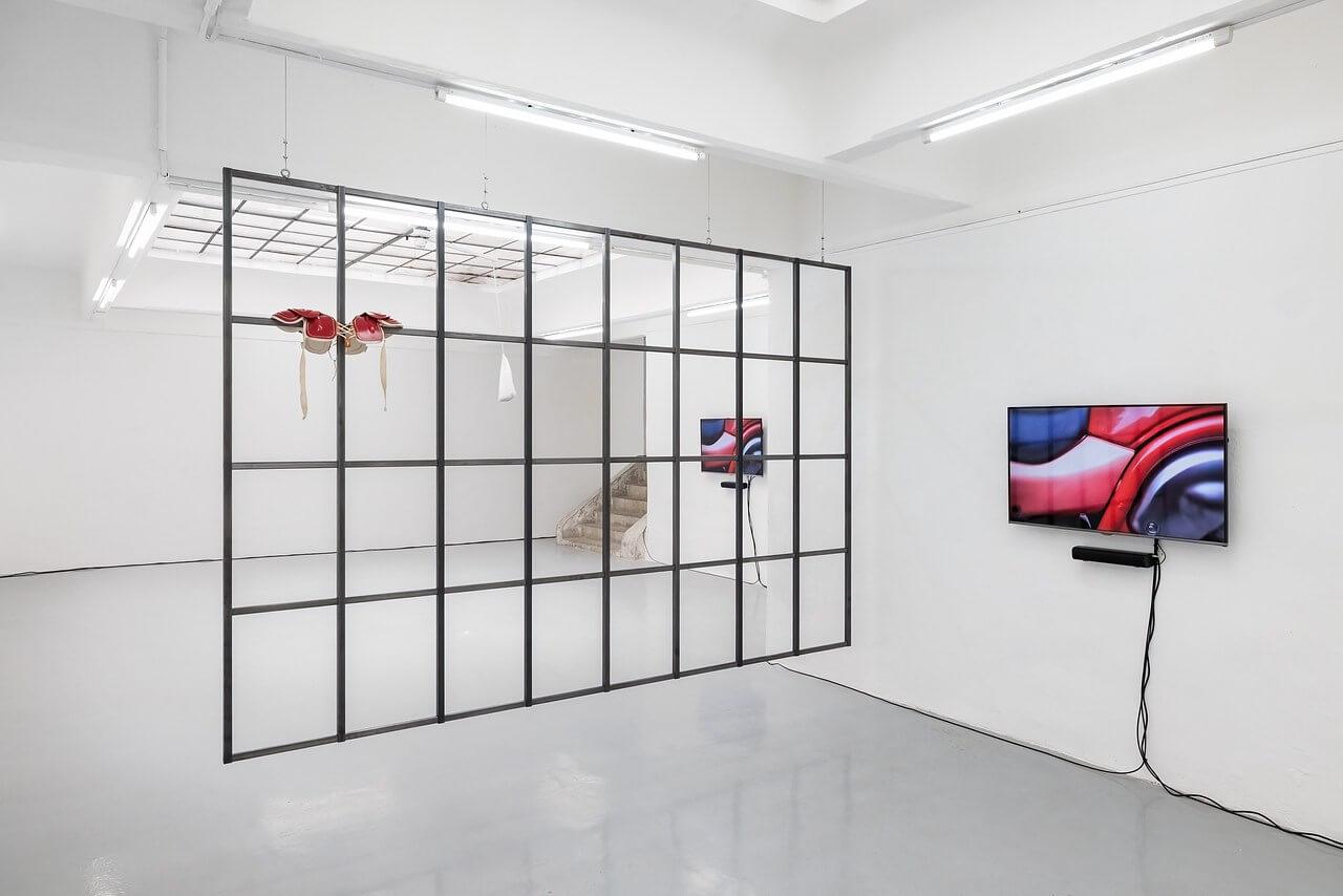 Finally, Margherita Raso leads us into a different kind of staging. Studio (2024) is a fake, and an epiphany. A 1:1 replica of the window from her former studio in Basel becomes a membrane suspended between intimacy and representation. Two 1950s shoulder pads, processed animal by-products, disrupt the presumed transparency of the absent glass. Like markers or relics, they gesture toward absent yet summoned bodies. Raso works on the skin of things, at the threshold between what is seen and what is projected. There is no nostalgia here, but a constant tension between interiority and surface.