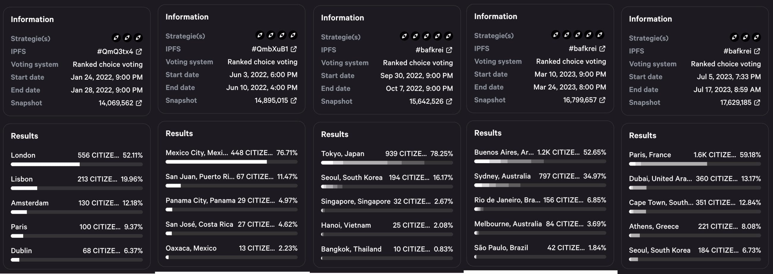 After Berlin, we turned to the 4,000 Citizen holders in our DAO to choose our next cities. Here are the on-chain snapshots that show the voting for each of the cities: