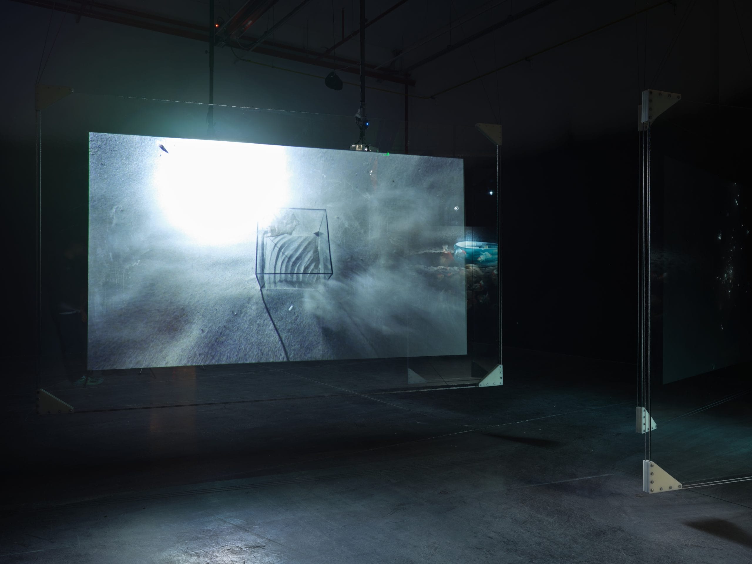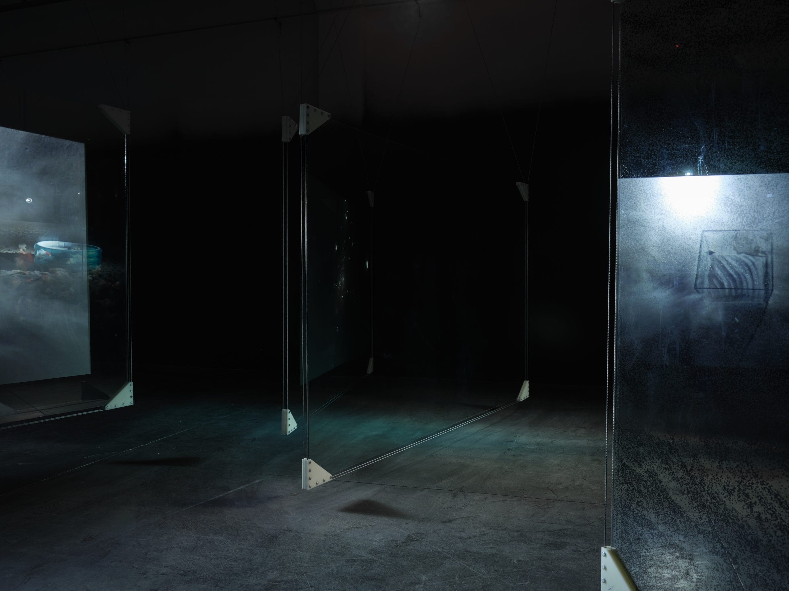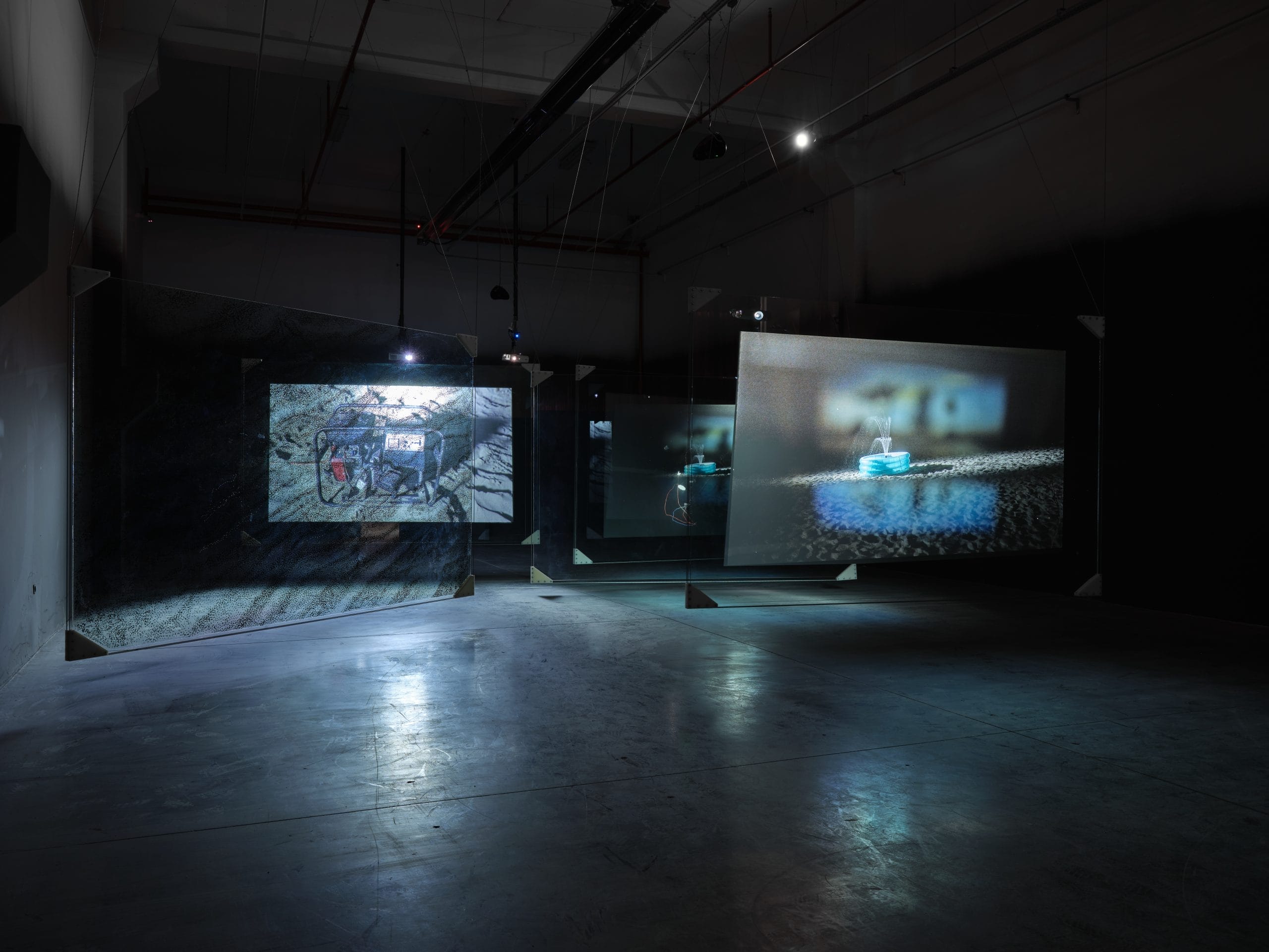 Burak Kabadayı‘s solo exhibition titled Whether it’s a desert or not is irrelevant, curated by Deniz Kırkalı, explores the ambiguous boundaries of seeing and knowing through illusions created by natural phenomena such as reflections and mirages. The site-specific installation includes three new video works by Kabadayı and delves into the material relationality between the desert and glass as a dynamic environment, using light, pattern, video, and sound. The exhibition creates a sense of disorientation, unsettling our familiar perception of the material world and offering a cognitive estrangement experience. This highlights the fragile relationship between habit and habitat, inviting contemplation on concepts of ambiguity, fracture, reflection, and deception by constructing fictional worlds that attempt to reveal the unseen. Kabadayı‘s fragmented narratives reveal our partial perspectives and embodied states within the networks we inhabit. They invite us to confront the limitations of knowledge, positioning bodily experience as an interpretive and partially constructed phenomenon. His work underscores that knowledge is inherently site-specific and rooted in perceptual habits.