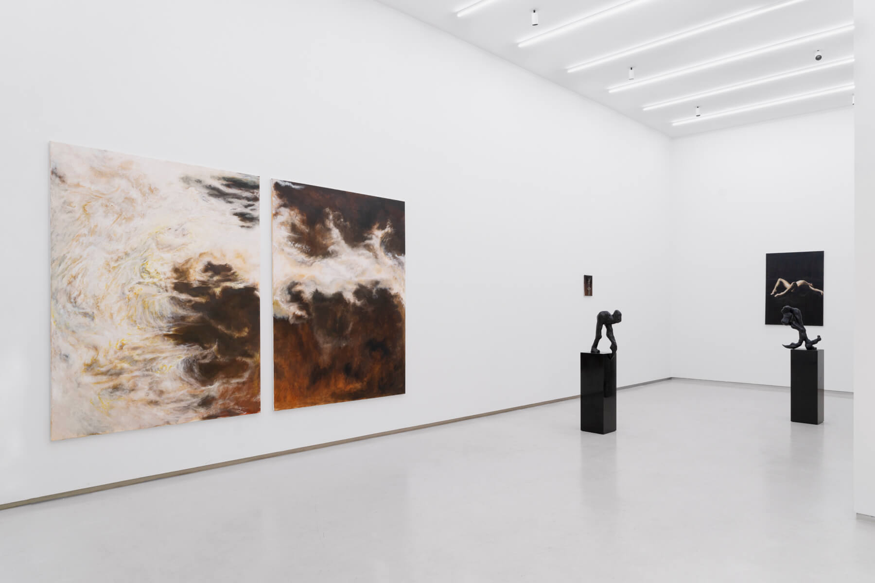 Mads Hyldgaard Nielsen, by contrast, works in oil but speaks through fire. His paintings recall the baroque, the sublime, the spectral body, yet they never settle into representation. They move like music. VI MVMNT Finale is one such composition, a luminous, contorted figure emerging from a dense atmosphere of smoke and magma, where gold leaf flickers like heat. Nielsen doesn’t depict sensation, he makes it happen. The body is not stable, but vibrational, caught between release and restraint, between desire and dissolution. If D’Angelo gives us the psychic wound, Nielsen paints the moment it ignites.