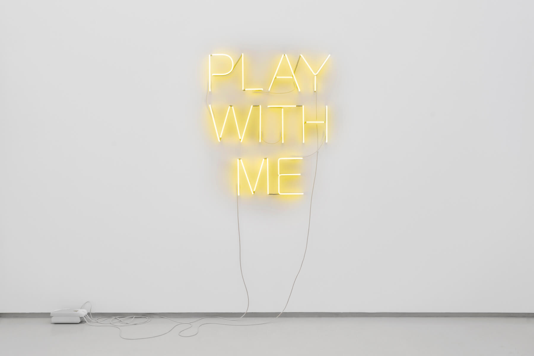 Christa Joo Hyun D’Angelo’s The Death Drive – A Love Story unspools like a psychic map of trauma, cinema, pop culture, personal testimony, and psychoanalytic reference collide in a video that is less narrative than excavation. Shot in stark contrasts, black-and-white melting into saturated color, it exposes how love can be both cradle and weapon. Inspired by figures like Rosetta, Asia Argento’s The Heart Is Deceitful Above All Things, and the Menendez brothers, the work conjures a terrain where family, abuse, and power flow into one another. The repetition of violence is not merely recounted, but performed in the rhythm of the montage. Neon works like PLAY WITH ME sharpen this seduction, turning a familiar pop phrase into a mantra of power play, where language itself becomes complicit. Here, D’Angelo offers not commentary but choreography, a grammar of wounds that bloom from within intimacy.