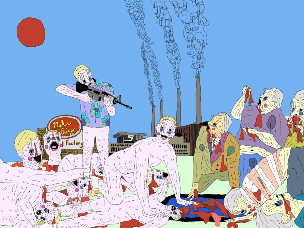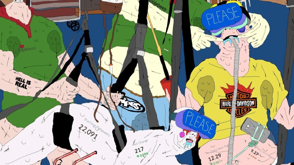 Mark Wilson, better known as diewiththemostlikes , is an Indiana-based artist and writer whose work navigates the more somber aspects of our everyday lives, emphasizing our collective infatuation with social media and our tendency to thoughtlessly consume.