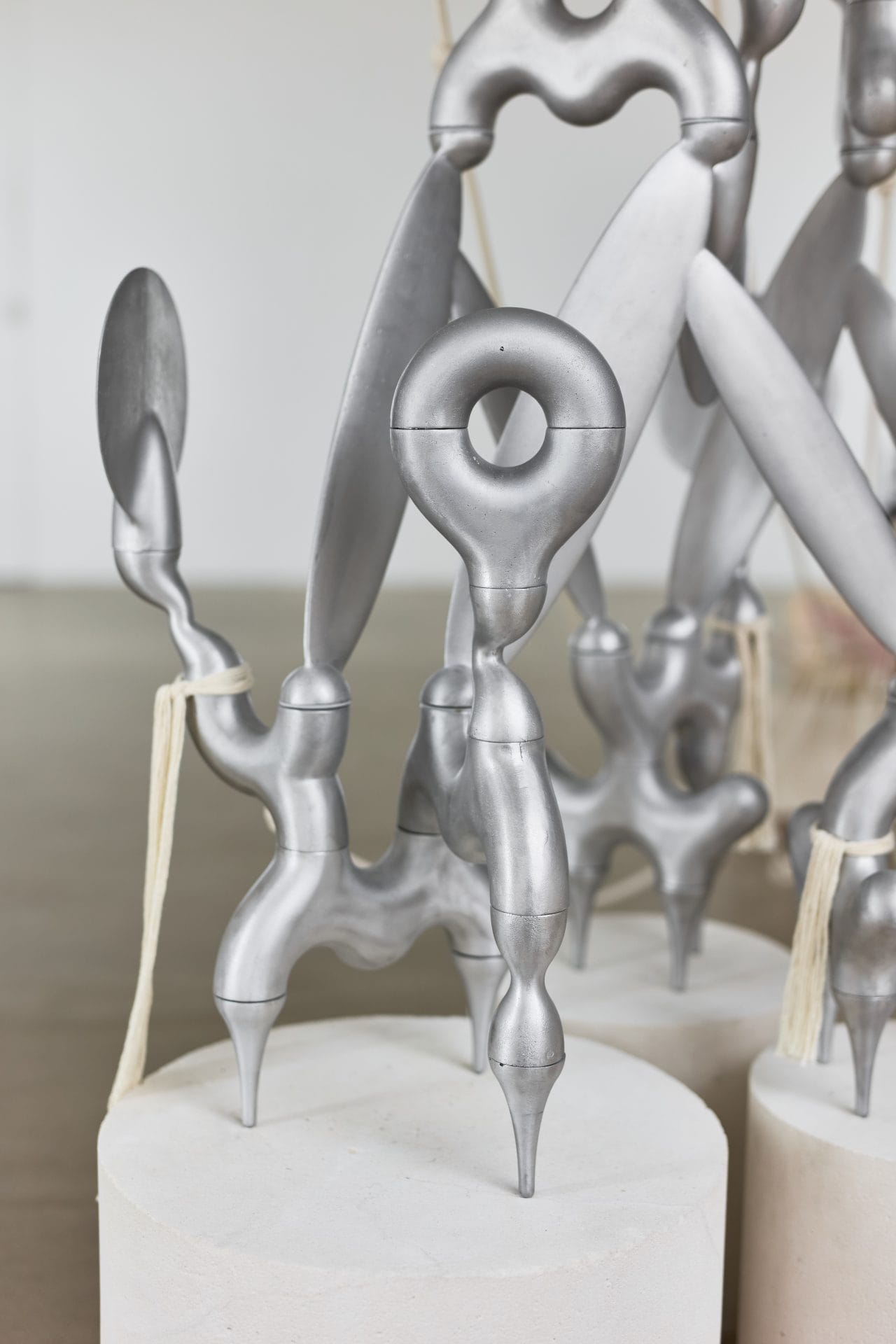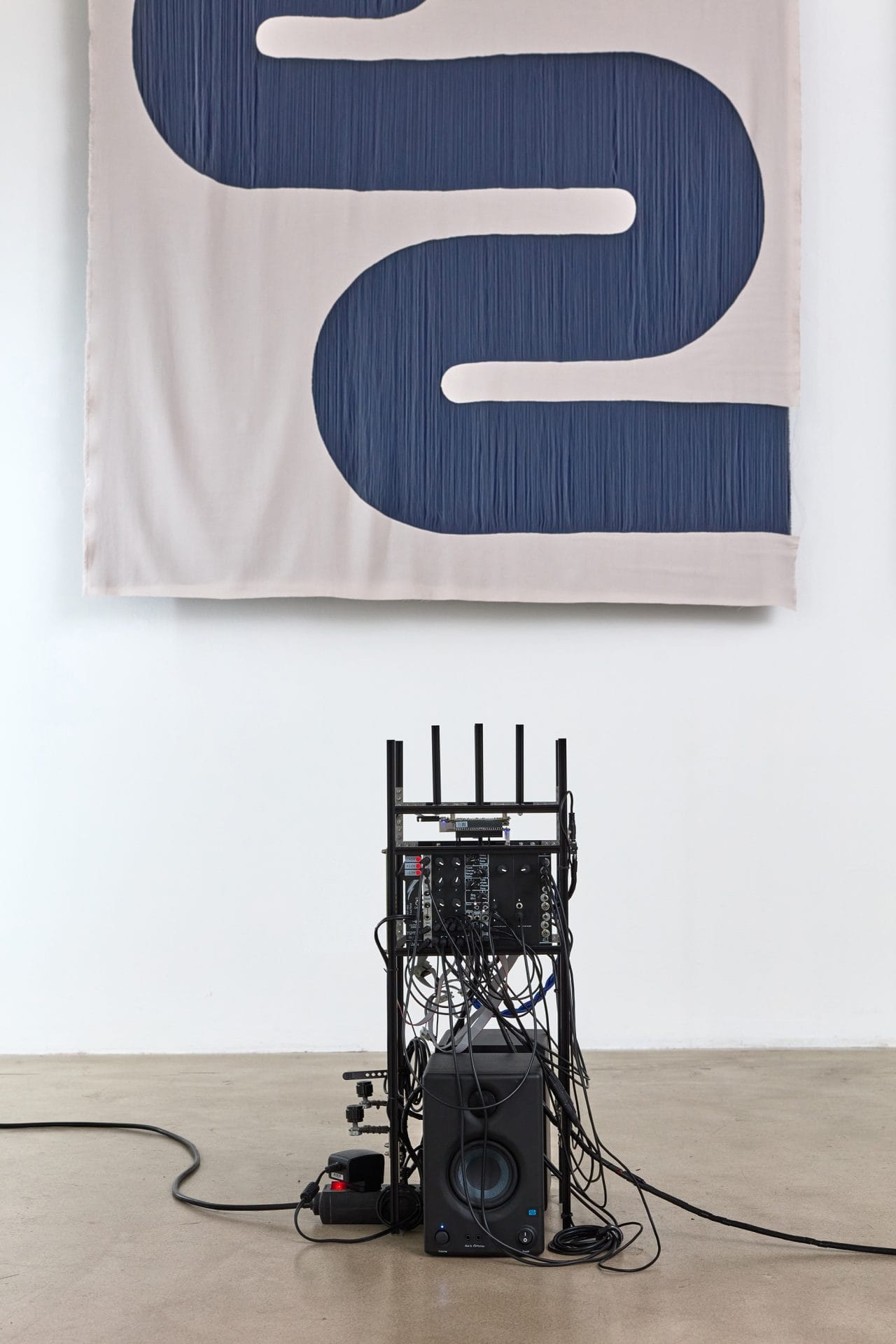 The blades have survived the millennia, but the strings have rotten away. Stone hammers and bronze arrowheads patiently await to be excavated, yet the fundamental framework of string technology remains unacknowledged. A technology woven so deeply into everyday life, that it seems to disappear completely. Prehistoric layers of time are defined by the increasing capability of humans to shape matter into tools. What archeology has delineated as the Stone Age should be referred to as the String Age; the dawn of the ability of mankind to extend a hunters reach via ropes, to expand carrying capabilities of a gatherer with a pouch, to insulate the body from the weather with a fabric. The foundational cognitive skill of amalgamating two hard materials into a single tool by tying them together with a crafted soft material. The jumpstart of this complex process demonstrates ‘infinite use of finite means’, effectively weaving the fabric of civilization. The return to unearthing this tacit knowledge and perceiving such concepts becomes a source for basing a contemporary spirituality and recalibrating social constructs. A possibility to discard an outdated, unbalanced belief system, and make way for fertile new mythologies. The tacit, un-applauded, technology of string. The oldest found string remnants date back to around 50,000 years. Archeological proof of an ancient technology that extended the capability of human hands and built the capacity of human minds. From twisting three bundles of fiber into a string, and spinning this string into threads and ropes, the structure becomes more and more complex. Multiple ropes can become interlaced into knots, and knots into networks, into textiles and into fabrics. The fractality of this process requires a cognitive complexity equal to that required by human language. Pre-hispanic cultures in the Andes developed an ancient operating system, a code and a language called Quipu; an intricate system of knotted strings which store and convey information. Fiber type, knot direction, or color all held embedded meaning that could be edited and transported easily. These string computers predate the Inca civilization by 4000 years and to this day deciphering this language still eludes scholars. It is rumoured that Quipu also served as musical notation storing songs and melodies. It is in the modern western world where music is performed to a passive audience. Music and chants have always been an integral part of a community, where all involved actively perform music together. The vibrational force of sound weaving bodies and breaths into a joint collective experience. We present a space that encompasses uchronic fictional archaeology, where techno-spiritual ritualism can blossom from an underlying dynamic system. We raise a modular menhir of vital materiality where touch incites matter into motion treating sound as a territorial marker where space is activated. Our realization takes form in a multilayered environment enabling the potential to construct new mythologies. An activity that affects the overlap between space, matter and body. Ecology of knowledge systems. Ecology of sentient matter.
