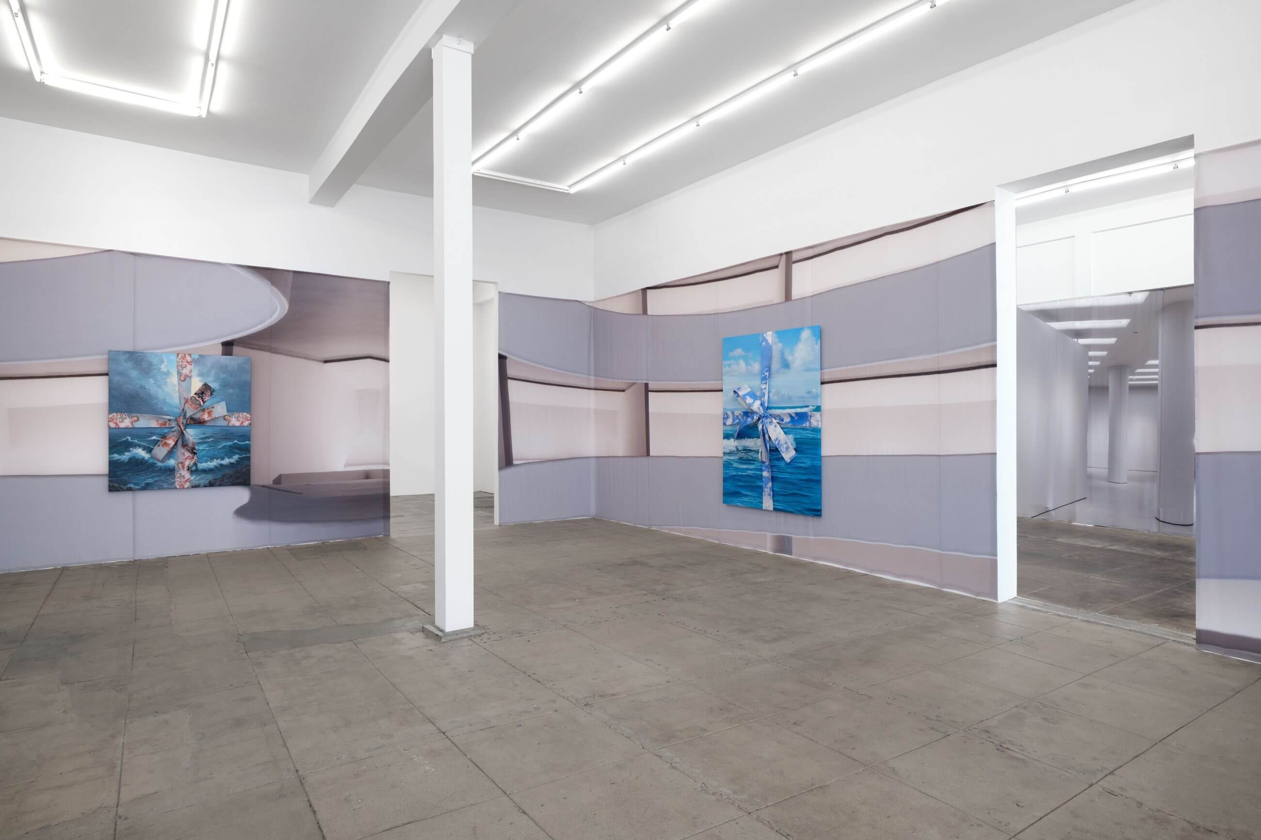 At Overduin & Co., visitors step into a disorienting silence, broken only by the occasional rustle of textiles slicing through the gallery’s air. Controlled, cold lighting sharpens the synthetic sheen of the ribbons that encase each canvas. You’re not moving among artworks anymore, you’re inside a staged scene: a fictional museum, mimicking the Guggenheim’s monumentality but reversing its role. Along the sweeping curve of the fabric walls, the paintings emerge like apparitions: hung yet immobilized, captured by their own ornate bindings.