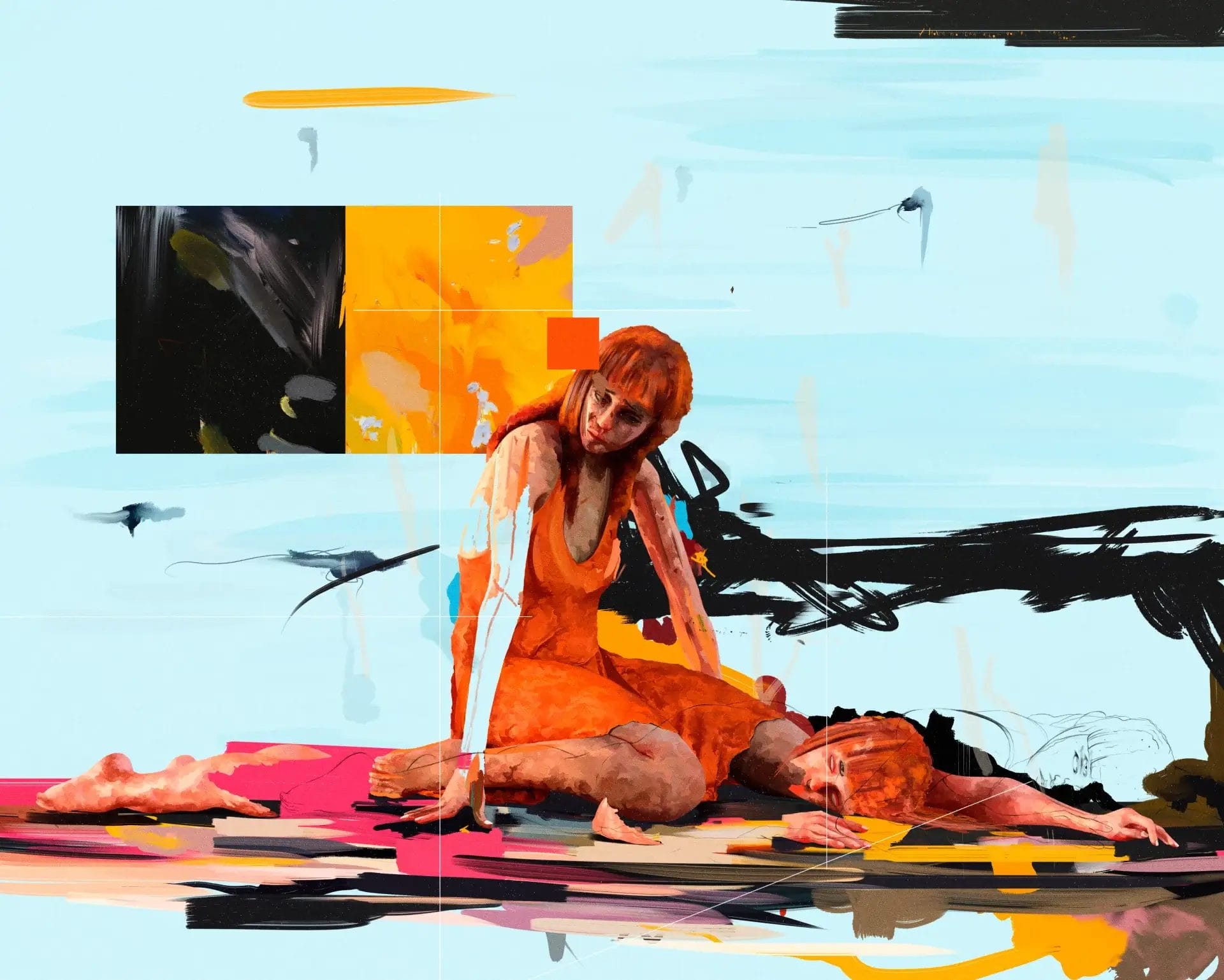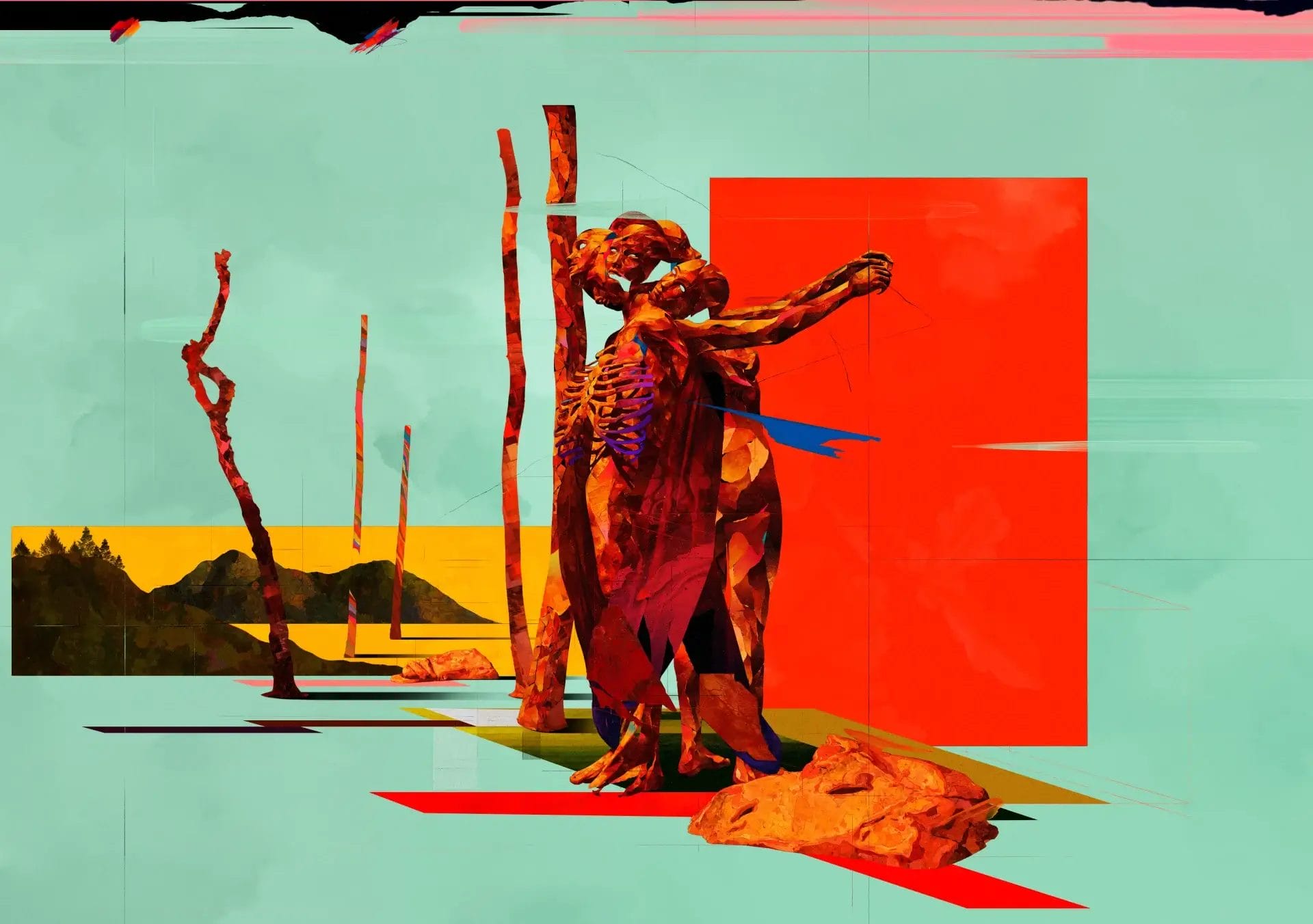Drawing from his background in graphic design, Etiene also incorporates elements of typography and geometric shapes into his work, adding another layer of depth and complexity that seamlessly interact with the human figures, further emphasizing the emotions and themes he seeks to convey.