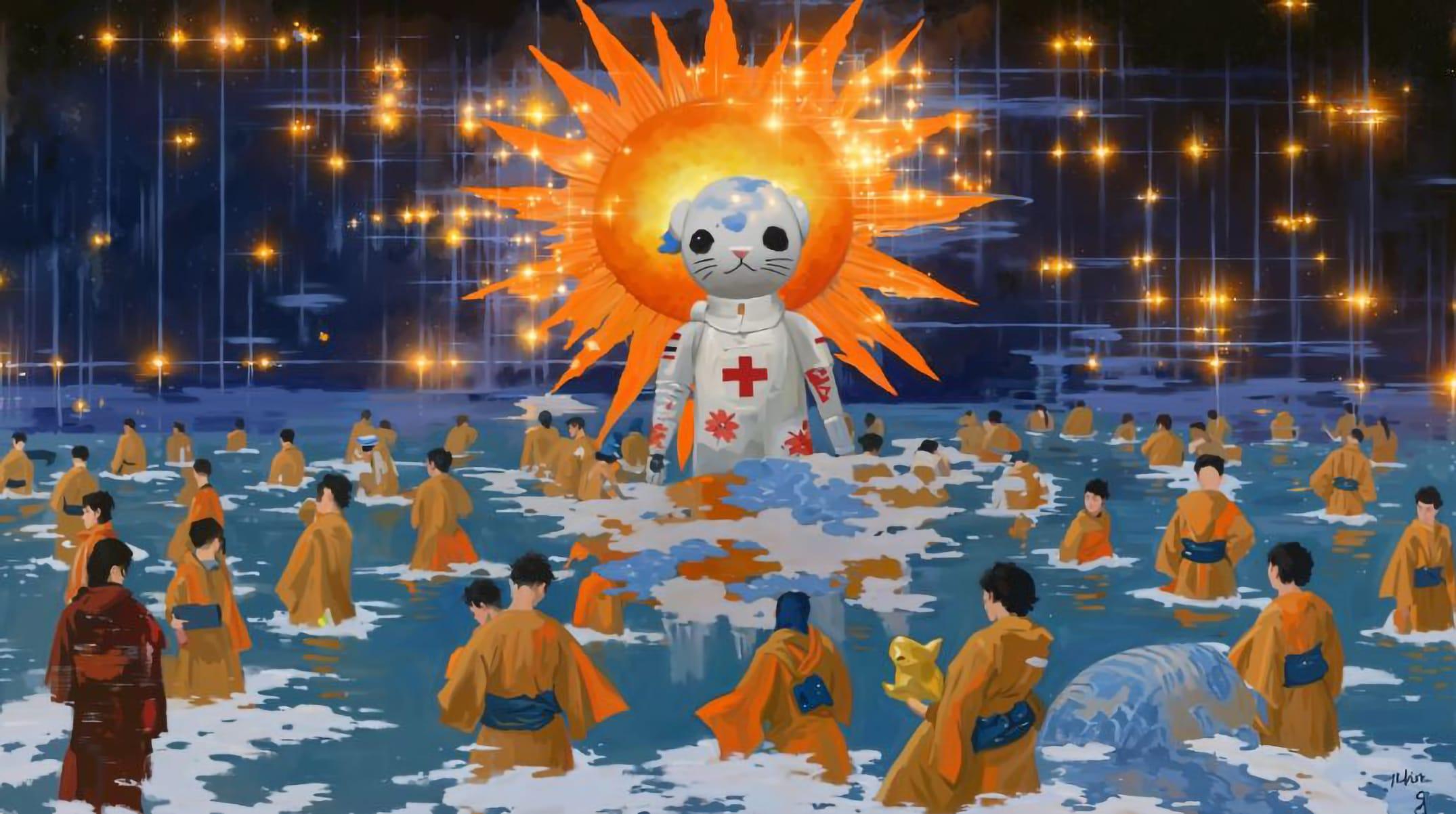 This negotiation between the intimate and the systemic continues in the collaborative project Omoiyari by Keiken and Gabriel Massan, where avatars inhabit liminal states of memory and disembodiment. Figures such as Uxkme, hovering between recollection and oblivion, and Xibam, aware of their own spectral distance, stage tender confrontations with the instability of selfhood.