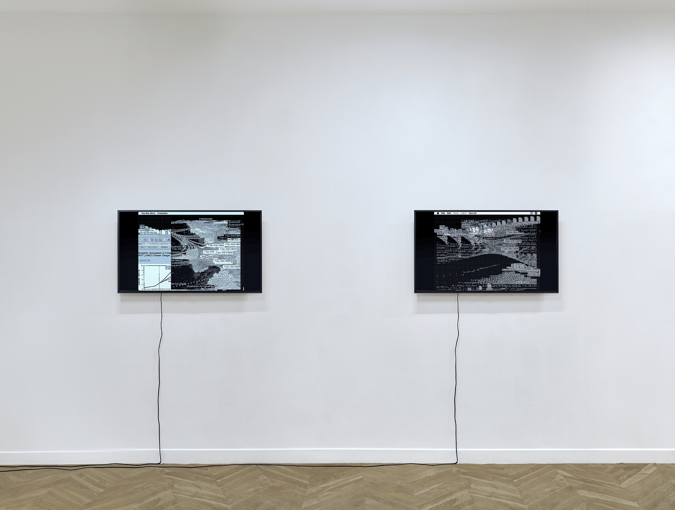In this series, Harlan extends his innovative use of emulated desktop environments to critique the widespread apathy toward climate change embedded within techno-utopian narratives. By reconstructing pages from the landmark 1990 IPCC Assessment Report within a simulated 1990s Macintosh operating system, he creates a poignant dialogue between the optimism of early tech culture and the pressing realities of environmental science.
