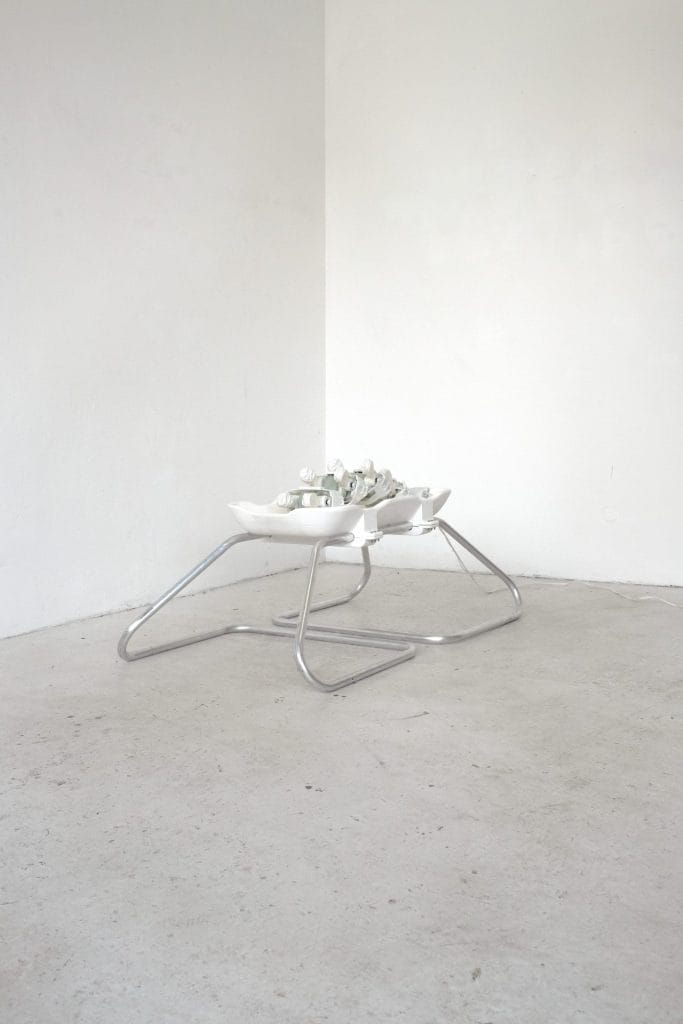 The object integrated into the installation, which plays a central role, is a hybrid in relation to this uncertainty. On one hand, this object evokes exactly this type of uncertainty in me, but on the other hand, it is clearly not human and doesn’t aspire to be perceived as such.