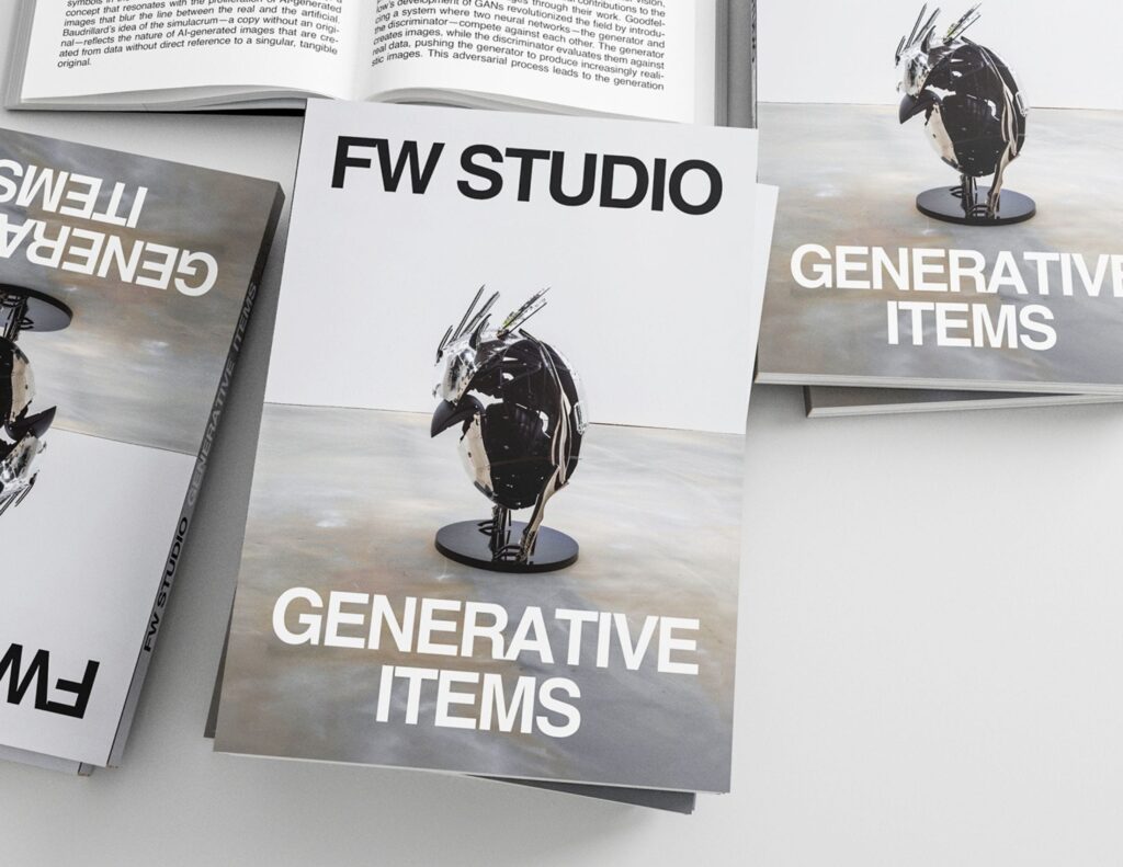 “GENERATIVE ITEMS” is more than a collection of artworks; it is closer to a manifesto of what can be achieved through collaboration between human creativity and algorithms. Each output selected for this edition not only represents the artist’s work in some way but also serves as a testament to the shared journey with Fakewhale Studio, embodying our active intention to stimulate critical reflection on the future of creativity and the role that AI, and technology in general, will play in redefining the boundaries of contemporary art.