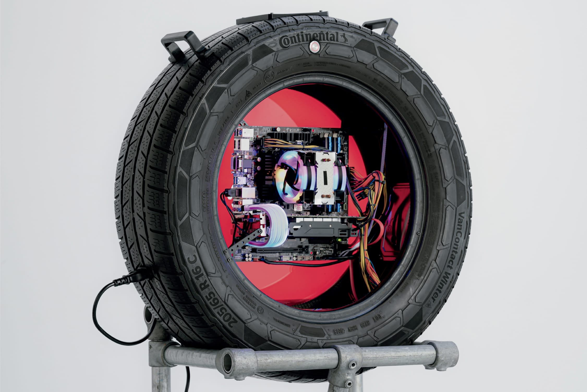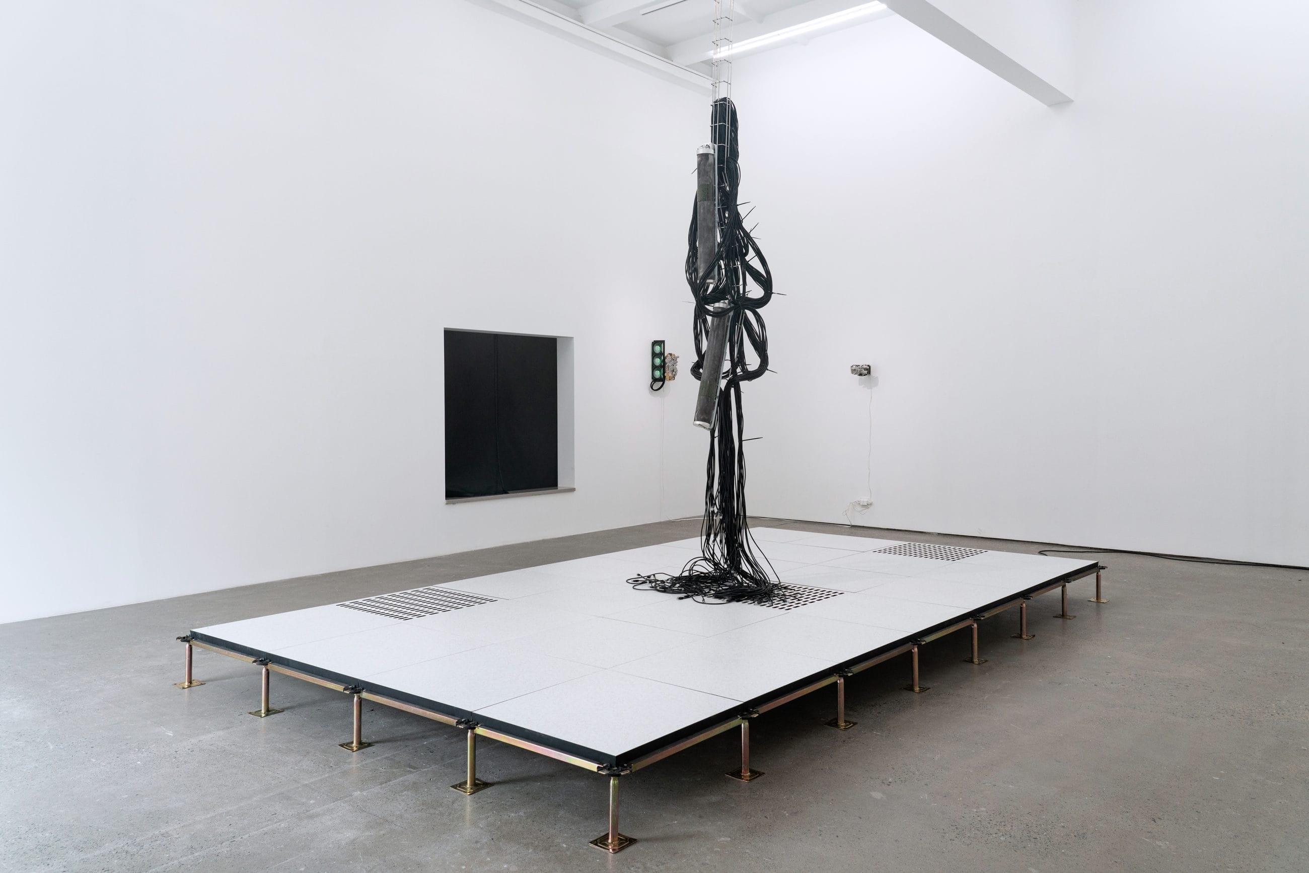 Split between two environments, a sterile data center and a surreal outdoor field, the exhibition opens a rift in perception. Rock cores wrapped in cables rotate under flickering green light, evoking ancient sediment and digital flow, while a smartphone endlessly scrolls through a calendar that far outlives human history. These are not sci-fi tropes but mirrors of our present: when even time is stored in apps and stones are mined to power thought.