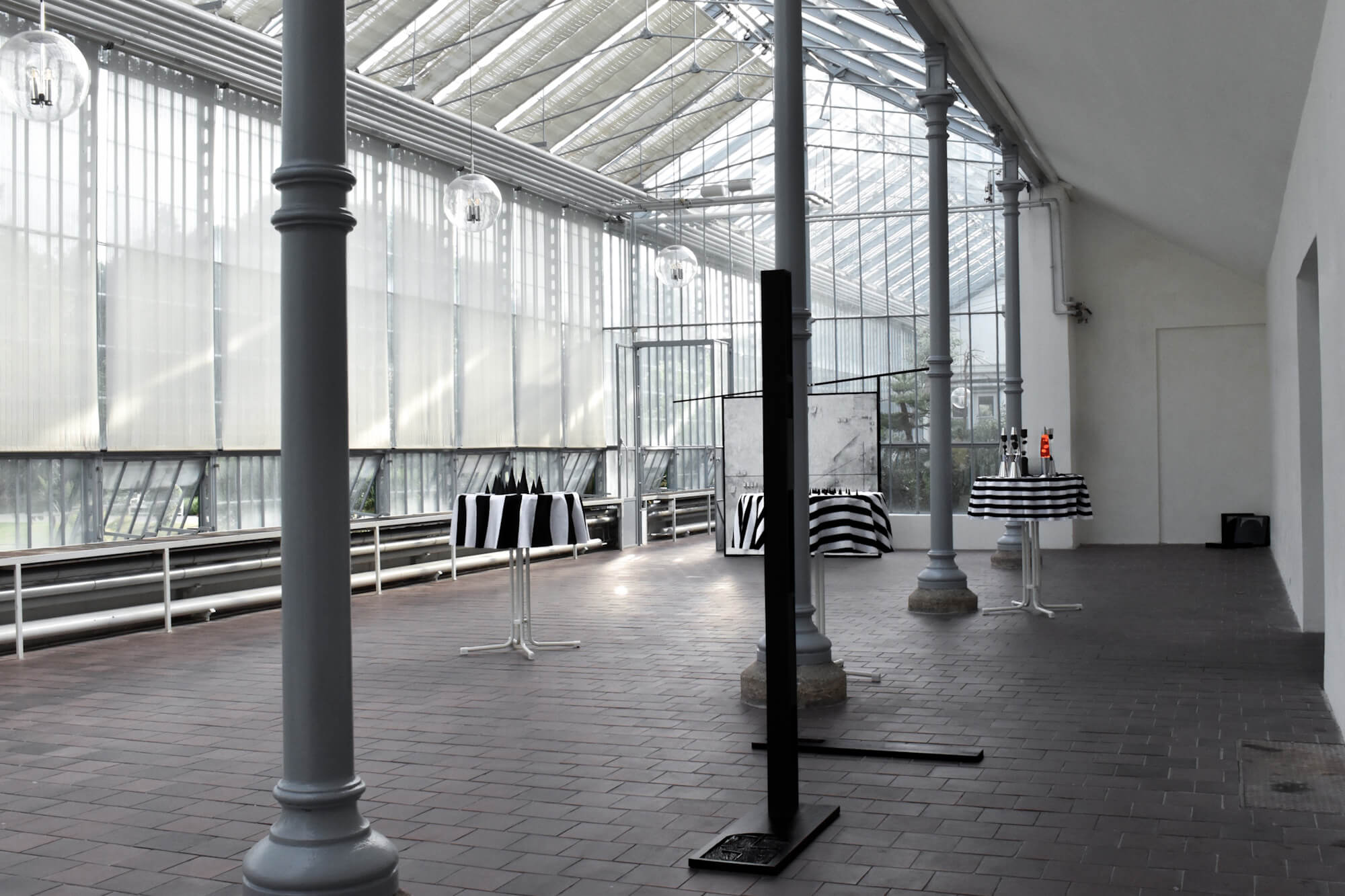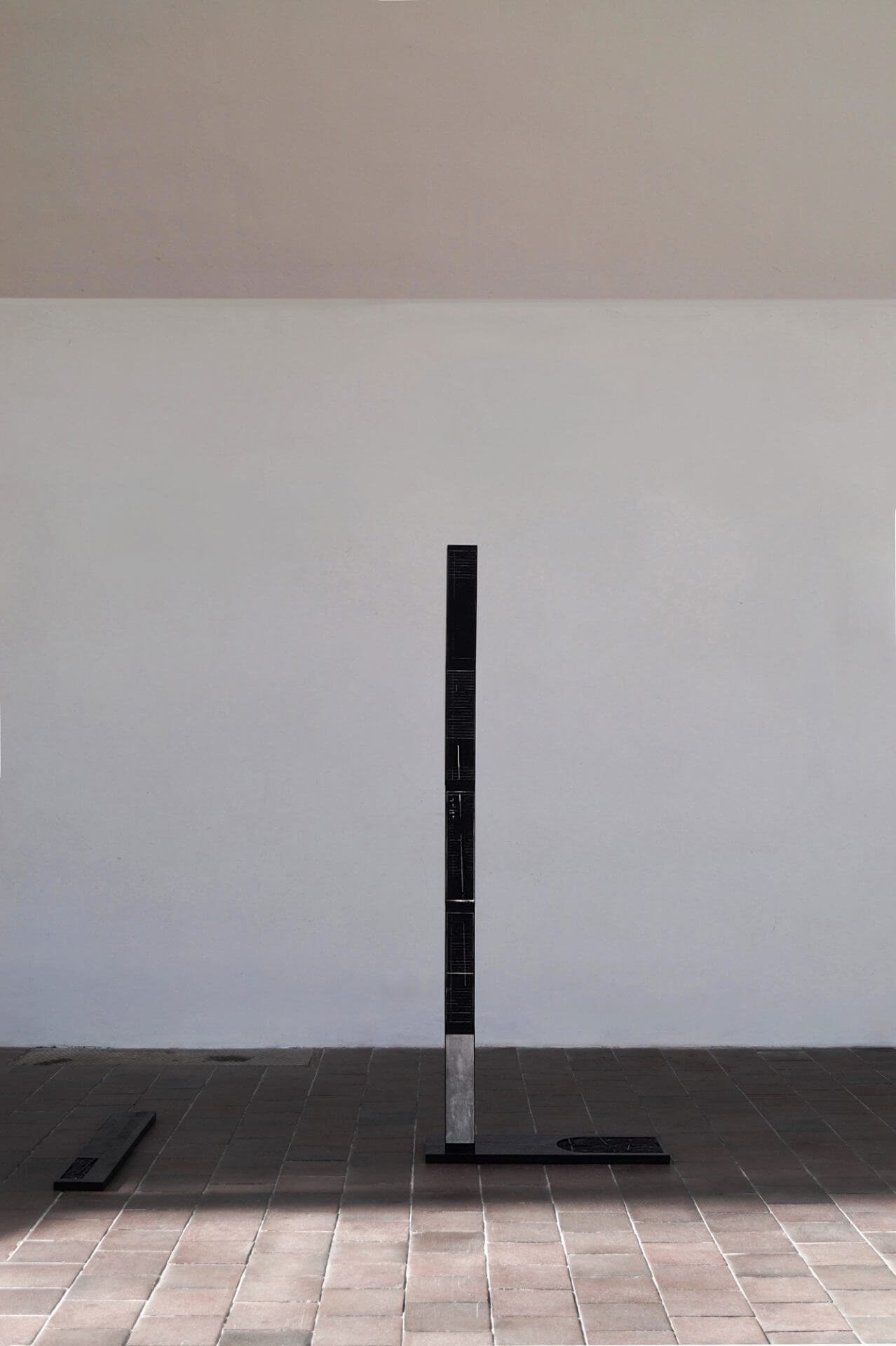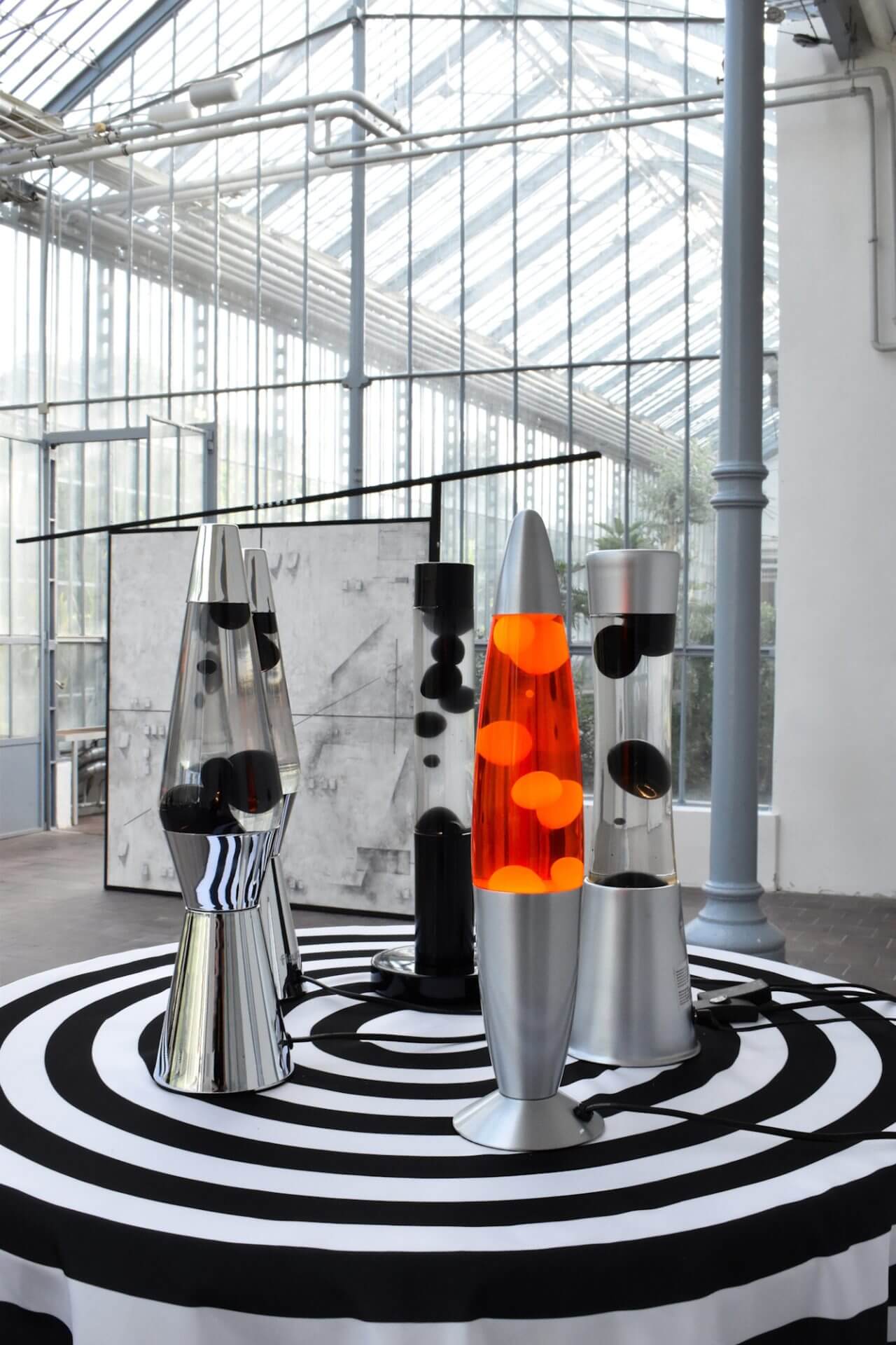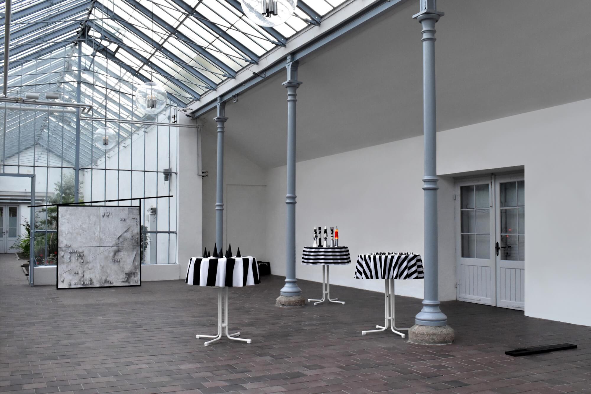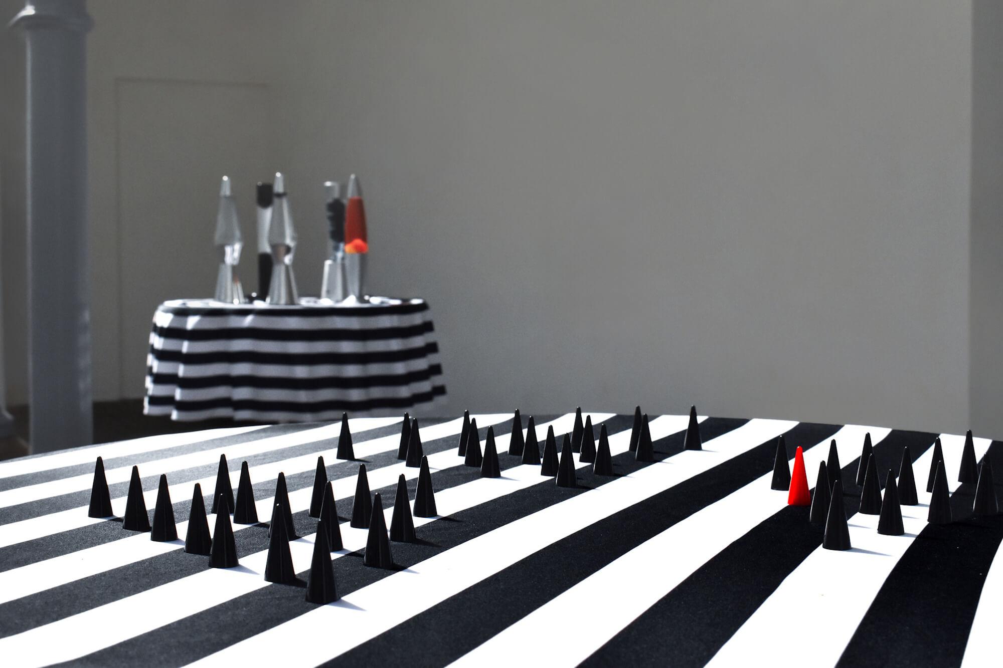 Inside this 19th-century greenhouse, now a diaphanous stage, the works of both artists move quietly, like seasoned actors in a wordless performance. Georg Dahled’s new pieces, created specifically for this exhibition, are laid out like geometric islands: three white standing tables, objects typically associated with conversation, become sterile altars. On their surfaces, black-and-white compositions rise like ruins of a never-existent order. Symmetry here is a cruel illusion: the eye searches for logic but finds only enigma. On one table, a triangular arrangement of small conical pieces references the game of Nim, in its so-called “Marienbad variant,” nodding to Alain Resnais’ Last Year at Marienbad. But this is not about rules; Dahled seems far more intrigued by their failure. Then suddenly, a jolt: a single red lava lamp erupts into the monochrome, like a rogue note. Is it pop? Psychedelia? Or just a crack in the façade?