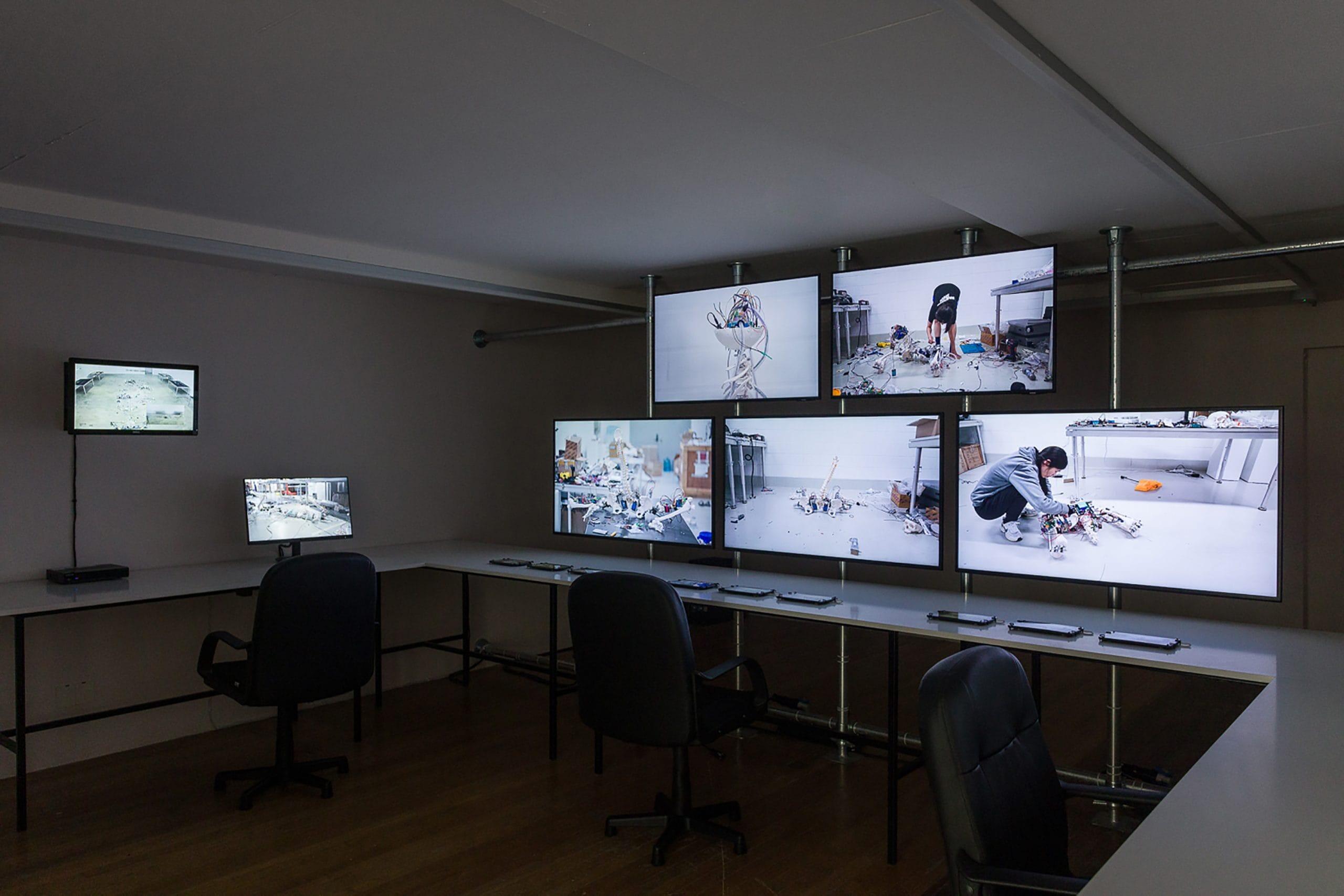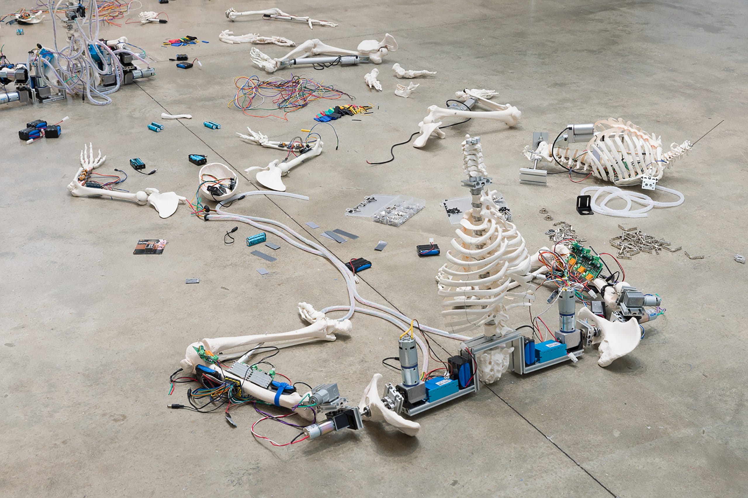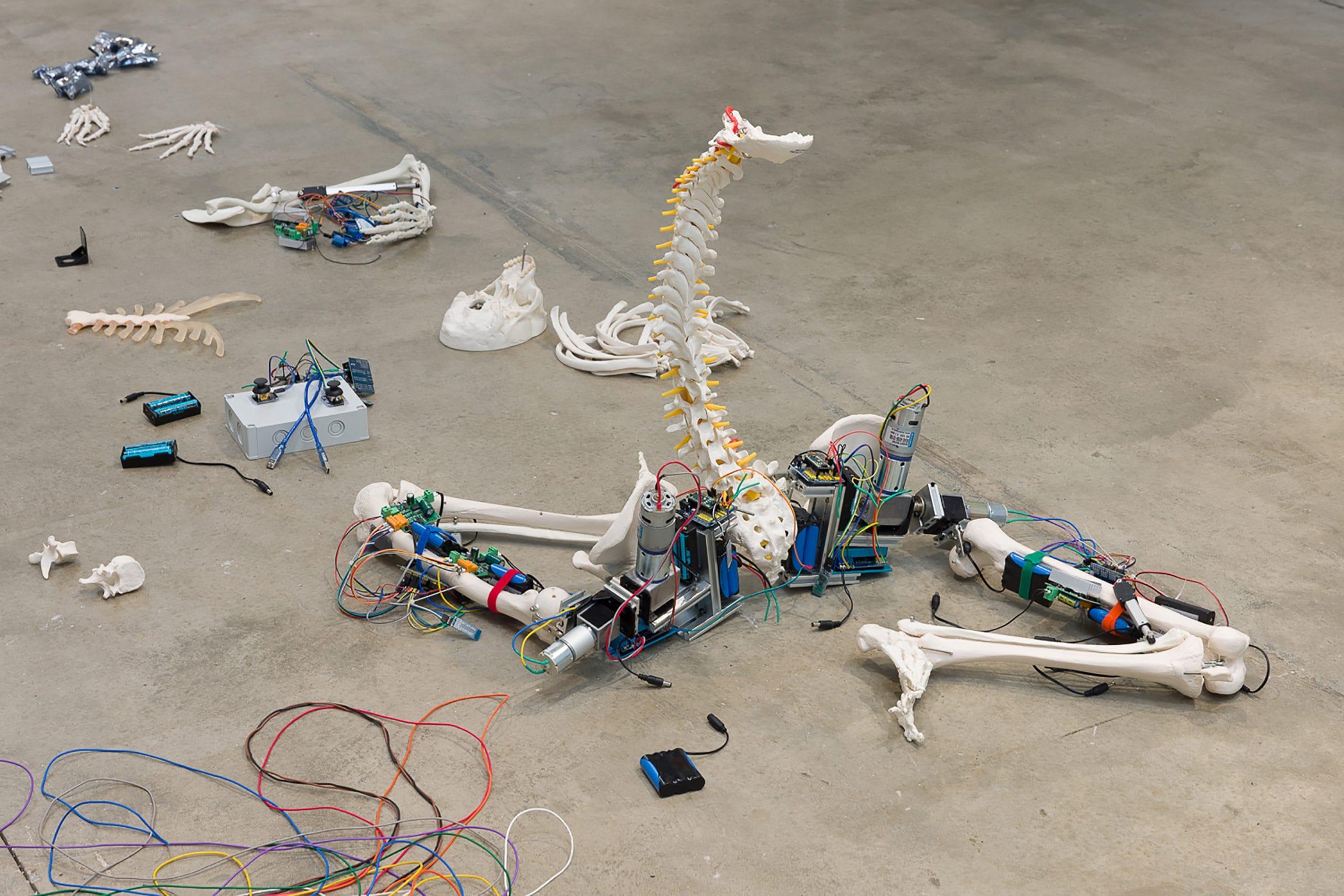 Compared to her earlier works, Under Construction represents a significant evolution. While Jeong previously used fragmented mannequin parts and medical dummies, the introduction of complete skeletons here adds a new level of anatomical precision and complexity. Yet, her signature DIY aesthetic—combining accessible materials with iterative, trial-and-error experimentation—remains intact. The use of skeletons, with their direct reference to human anatomy, deepens the exploration of the interplay between natural and artificial forms, pushing the reflection on technological dependency and the humanization of machines into even more profound territory.