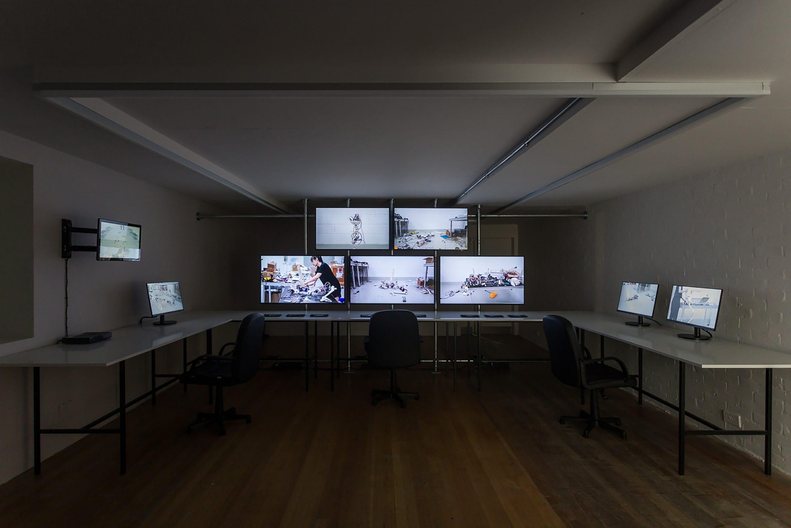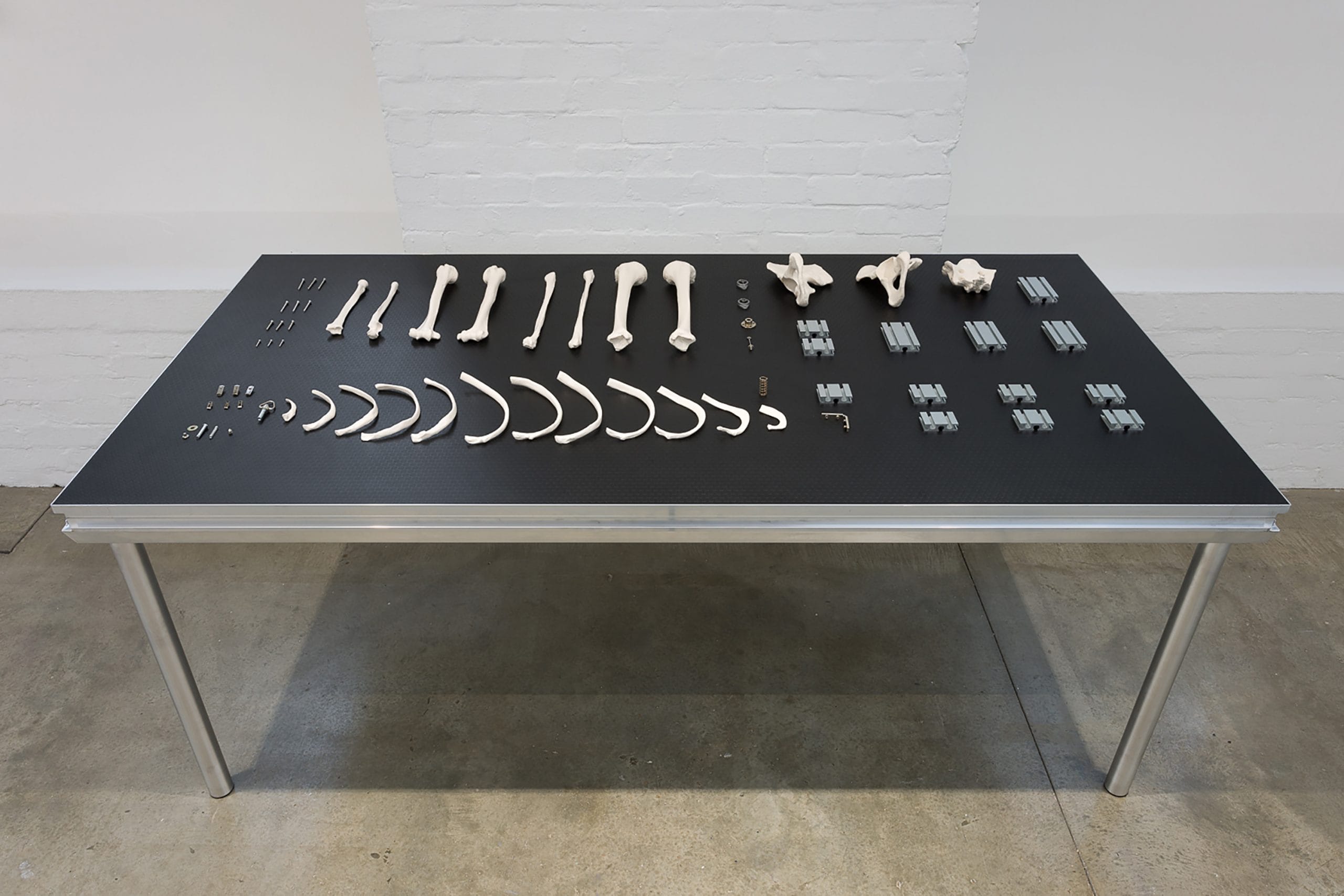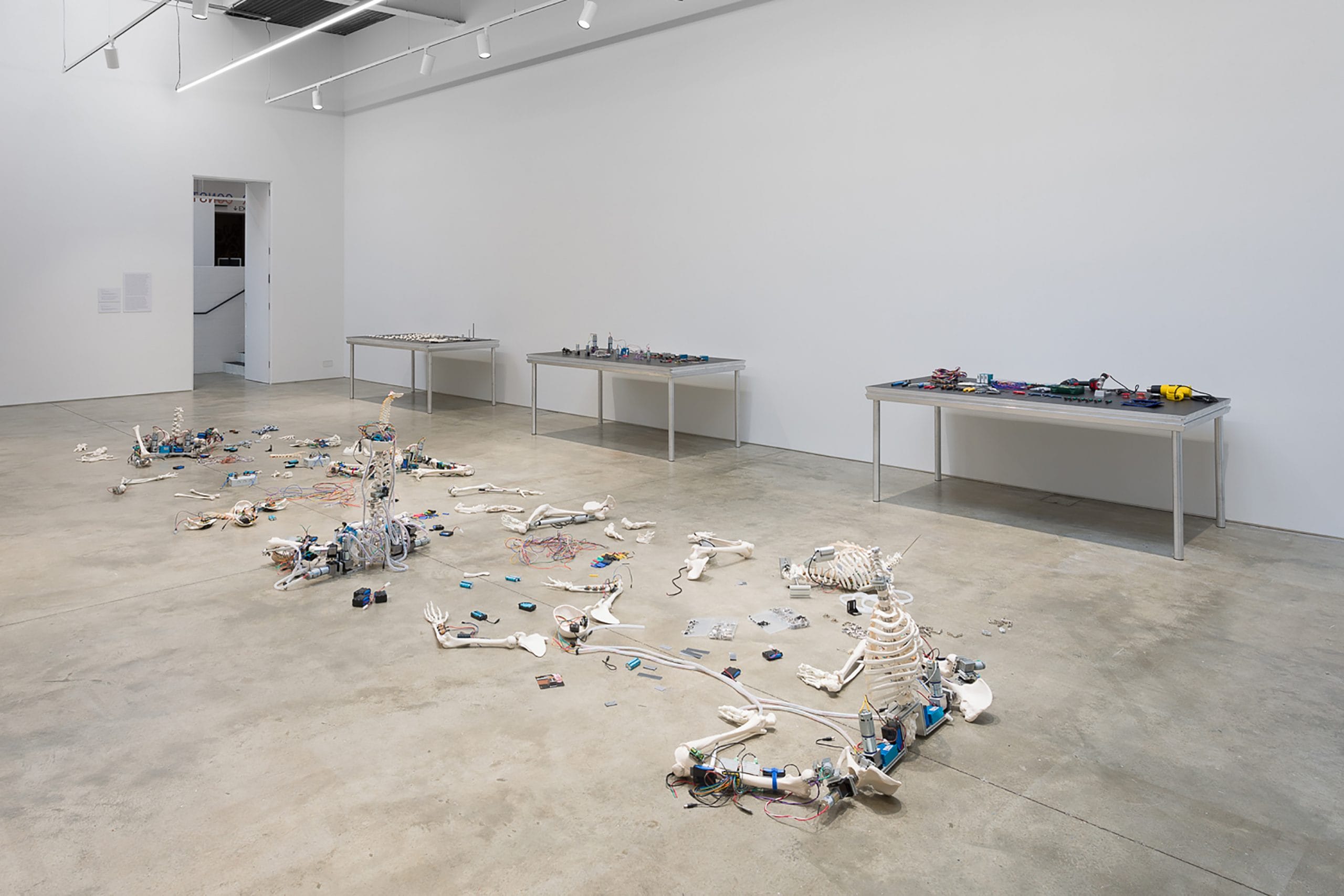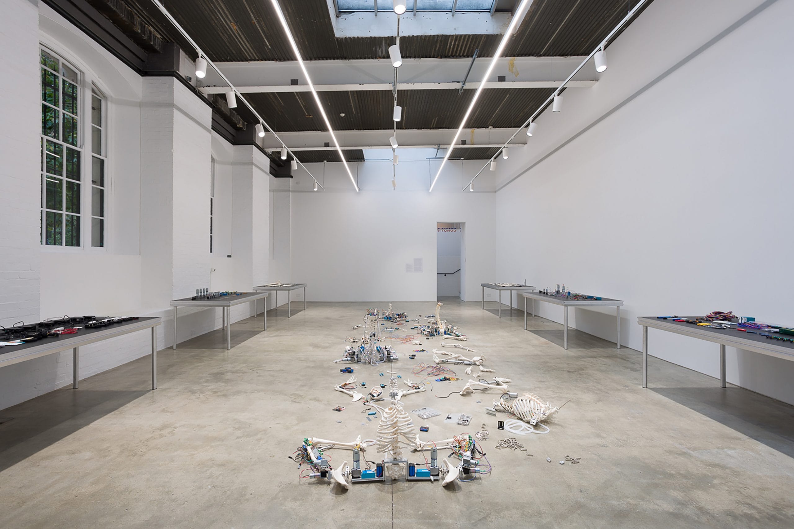 Entering Geumhyung Jeong’s Under Construction at the ICA in London is an experience that provokes an immediate sense of anticipation and unease. The industrial gallery space, with its white walls and bare concrete floors, serves as the stage for an intricate dialogue between humanity and technology. Screens scattered throughout display videos documenting Jeong’s interactions with her creations, while skeletal-mechanical figures sprawl across the gallery floor, caught in ambiguous poses somewhere between motion and stillness. The atmosphere is both clinical and theatrical, heightened by sharp lighting that underscores the raw materials and unfinished quality of the works. Along the walls, meticulously arranged tables display mechanical components, synthetic bones, motors, and wiring, offering a close-up view of the laborious process behind Jeong’s creations. Every detail, from the placement of objects to the interplay between movement and stasis, feels integral to the exhibition’s narrative.