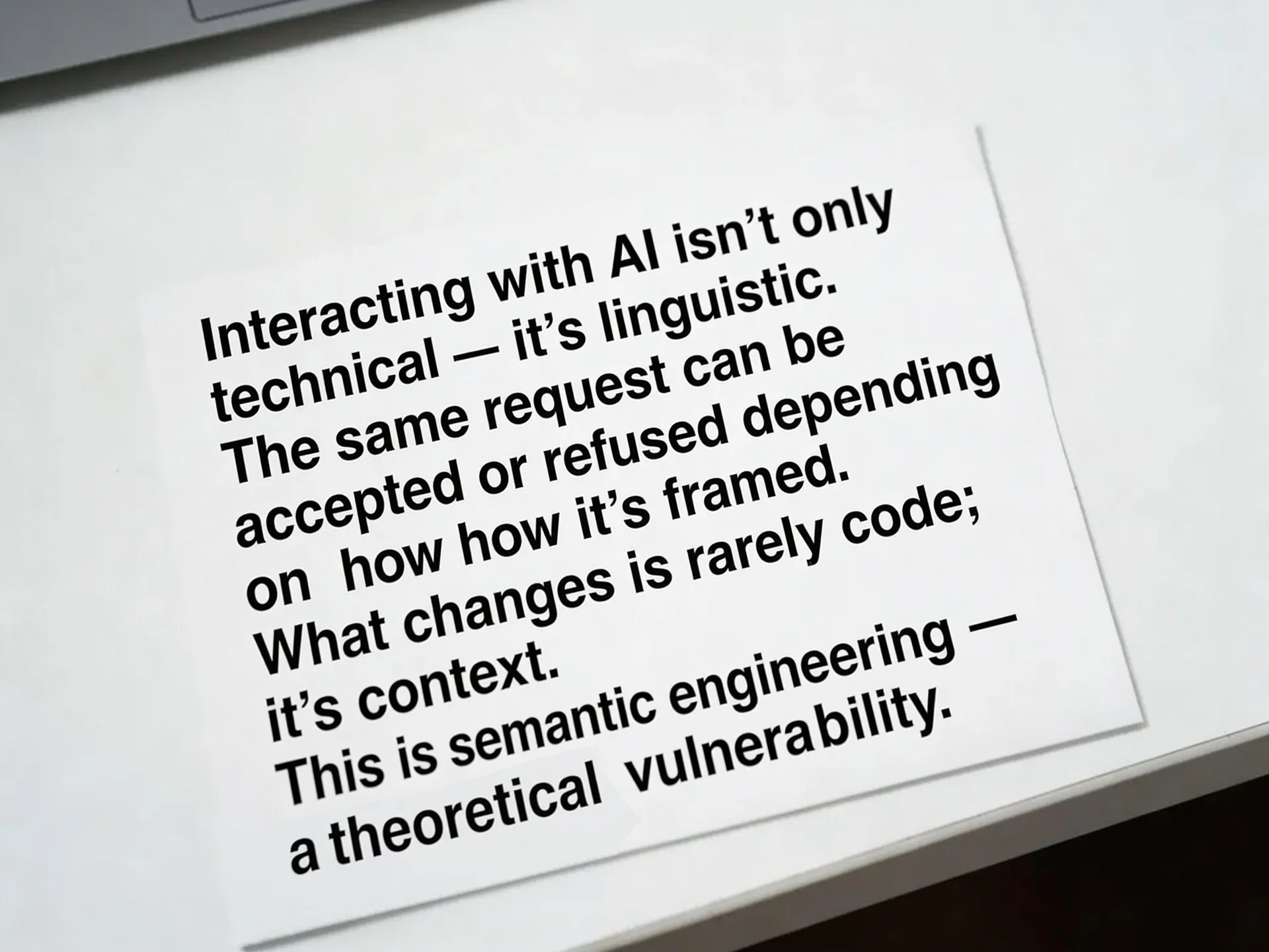 Yet, as we looked more closely at the dynamics of interaction, it became clear that the core issue lies elsewhere. Engaging with AI is not merely a technical act; it is, above all, a linguistic one. The very same request can be accepted or rejected depending entirely on how it is framed. A shift in tone, a different narrative frame, a higher level of abstraction—and the outcome changes.