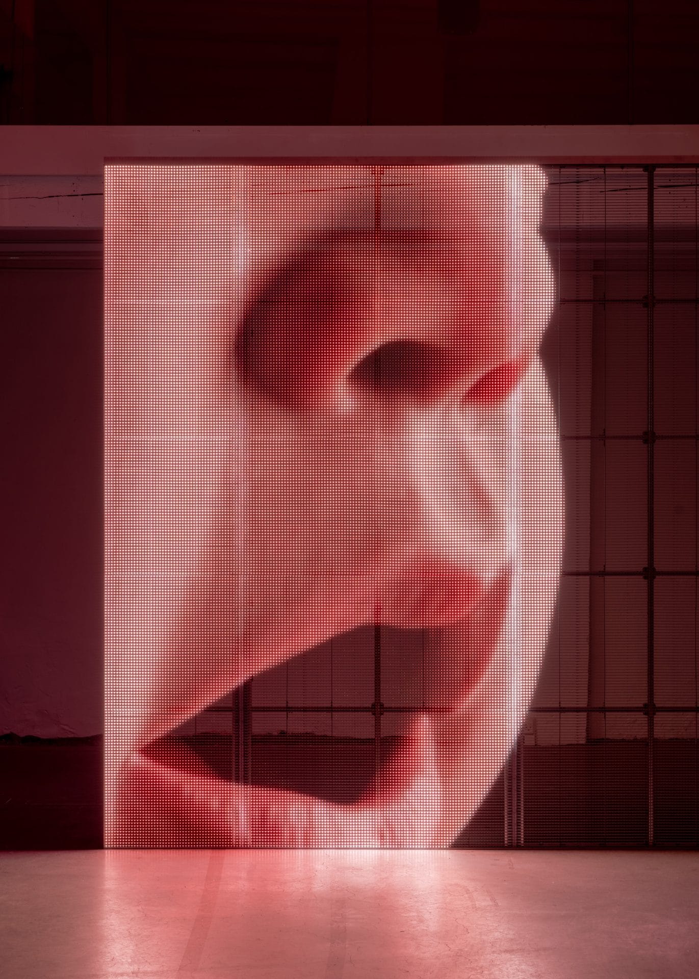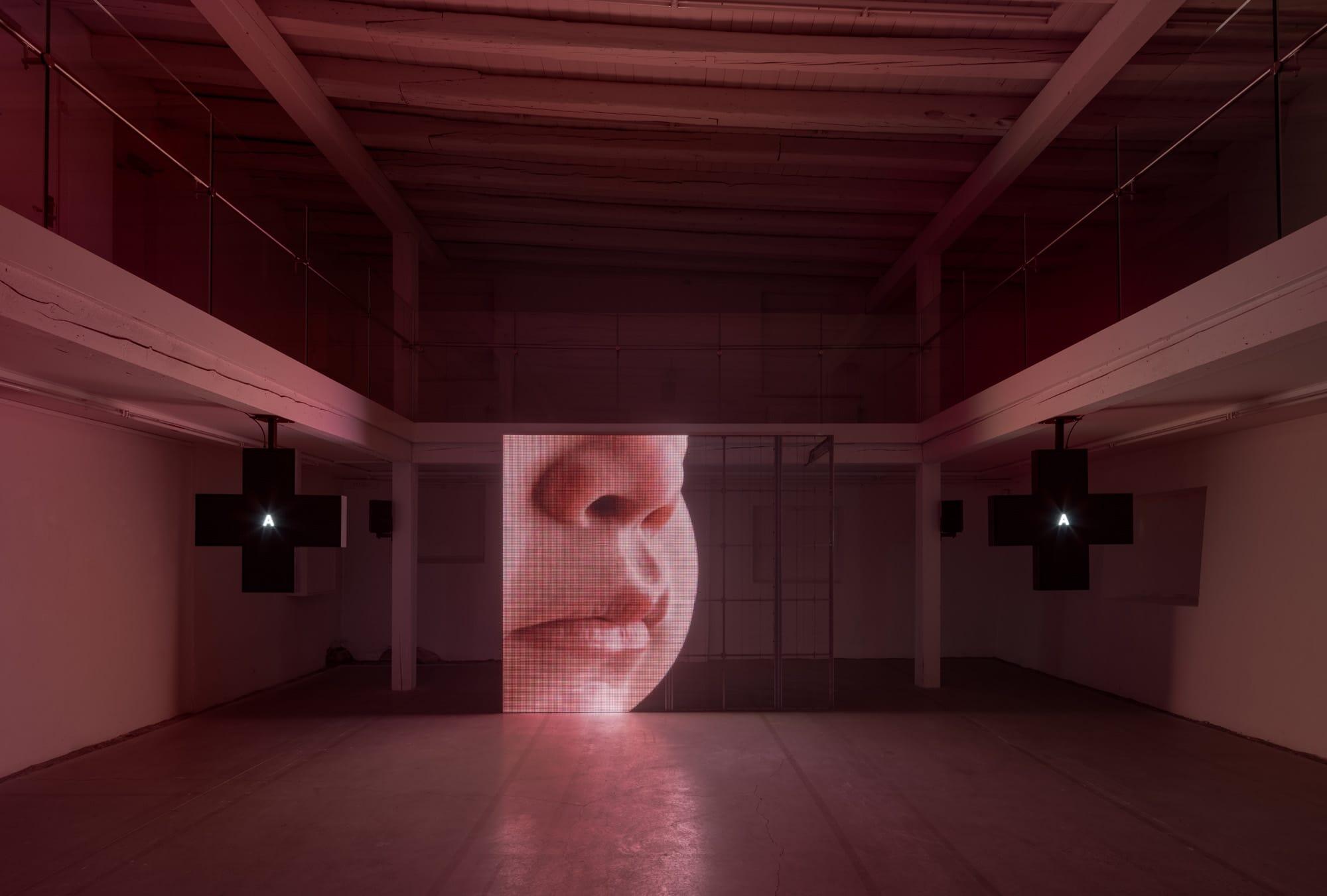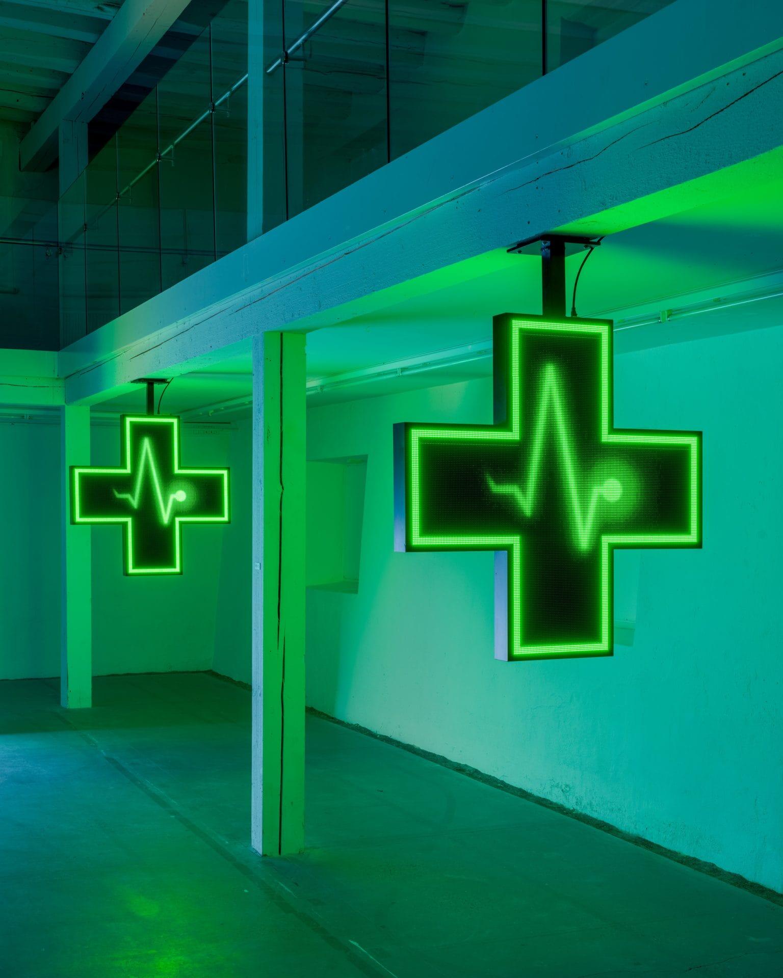 At Viborg Kunsthal, Settergren presents a freestanding LED screen that dissects the space of the lower gallery surrounded by four cross-shaped pharmacy signs. Graphic animations in the characteristic bright green hue either pulse like a heartbeat or emit Doppler-like waves that emanate from the center. Against these rhythmic repetitions, the film takes us through the tube-shaped chamber of a vessel as it passes through a stream of cartoon-like blood cells, reminiscent of biomedical demonstrations enacting the efficacy of a new drug. Across the synchronized projections, we follow the abstracted narrative of a sentient baby—its heavily processed voice scoring the plot of Settergren’s quasi-science fictional realm. Unnatural flows of simulated milk rush across the screen, colliding into one another in slow motion. The smooth and synthetic edges of the baby’s eyelids open and close, before it addresses us directly—a way of coming into being in utero that evokes a futuristic world in which birth is no longer tied to the female womb.