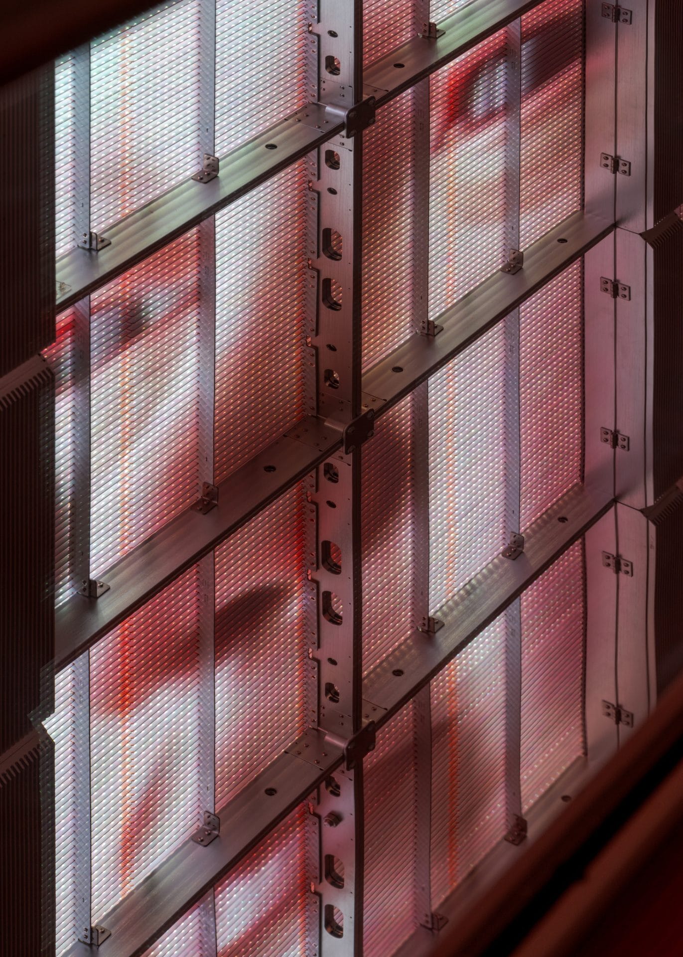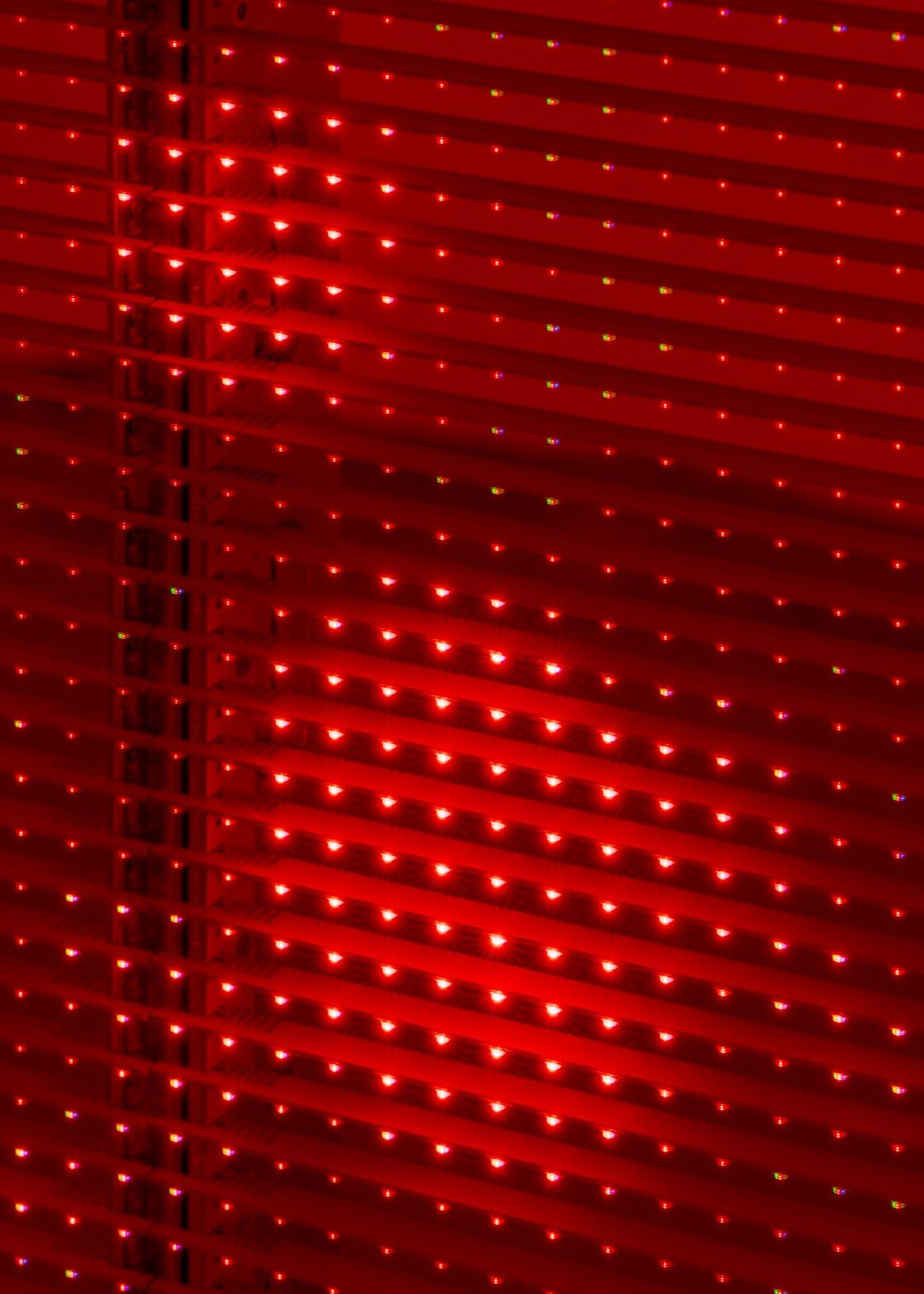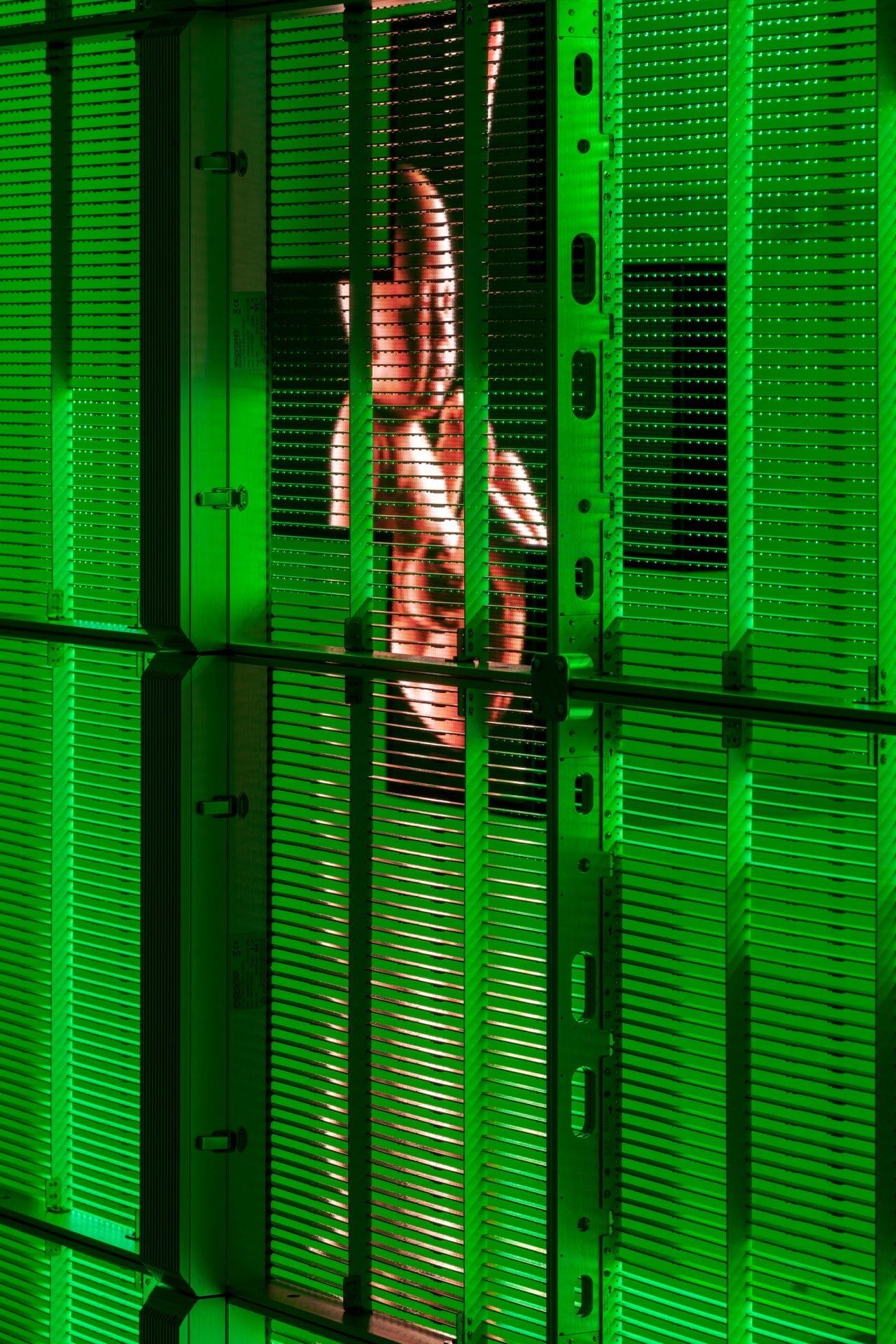 At Viborg Kunsthal, Settergren presents a freestanding LED screen that dissects the space of the lower gallery surrounded by four cross-shaped pharmacy signs. Graphic animations in the characteristic bright green hue either pulse like a heartbeat or emit Doppler-like waves that emanate from the center. Against these rhythmic repetitions, the film takes us through the tube-shaped chamber of a vessel as it passes through a stream of cartoon-like blood cells, reminiscent of biomedical demonstrations enacting the efficacy of a new drug. Across the synchronized projections, we follow the abstracted narrative of a sentient baby—its heavily processed voice scoring the plot of Settergren’s quasi-science fictional realm. Unnatural flows of simulated milk rush across the screen, colliding into one another in slow motion. The smooth and synthetic edges of the baby’s eyelids open and close, before it addresses us directly—a way of coming into being in utero that evokes a futuristic world in which birth is no longer tied to the female womb.