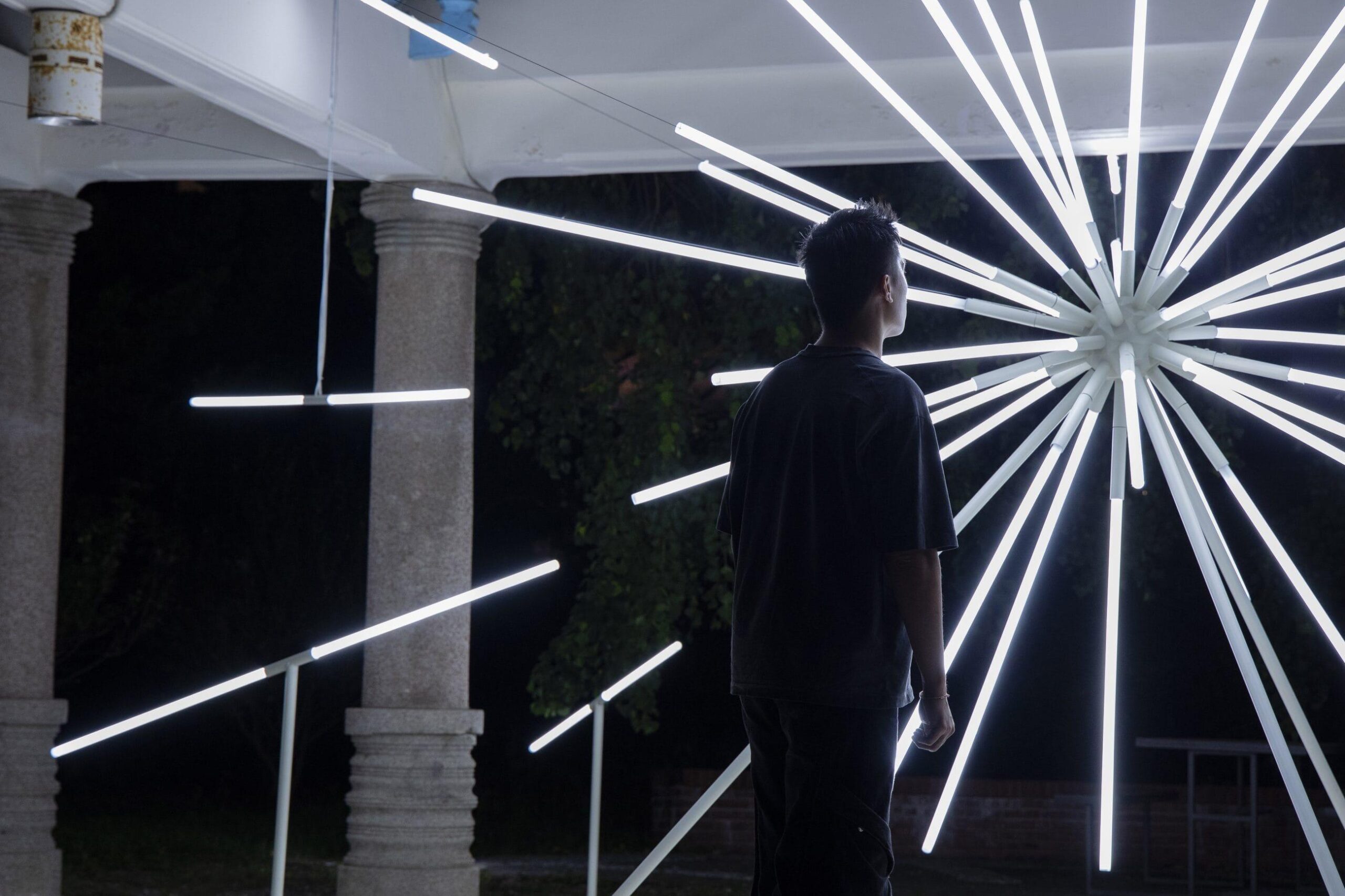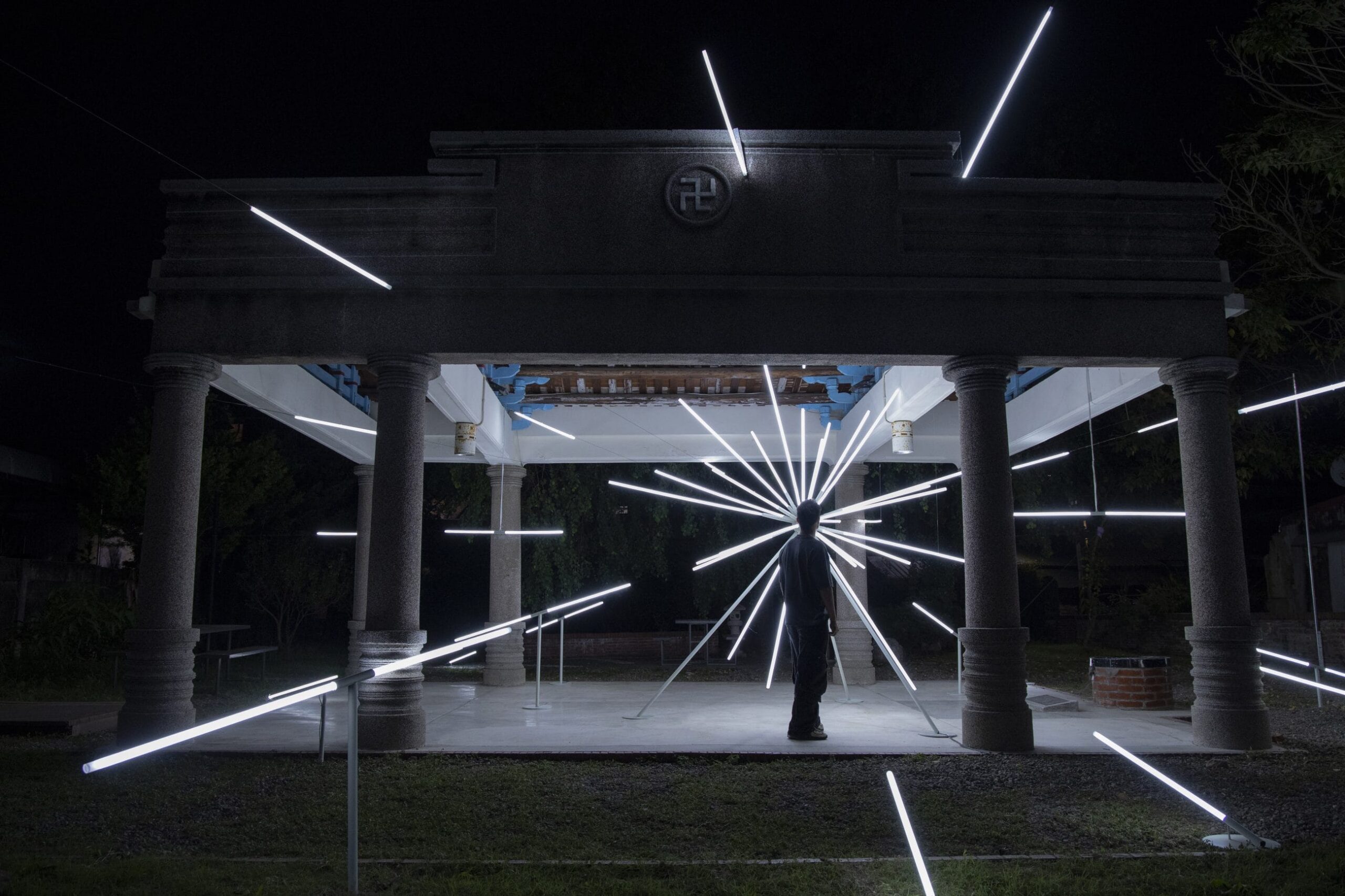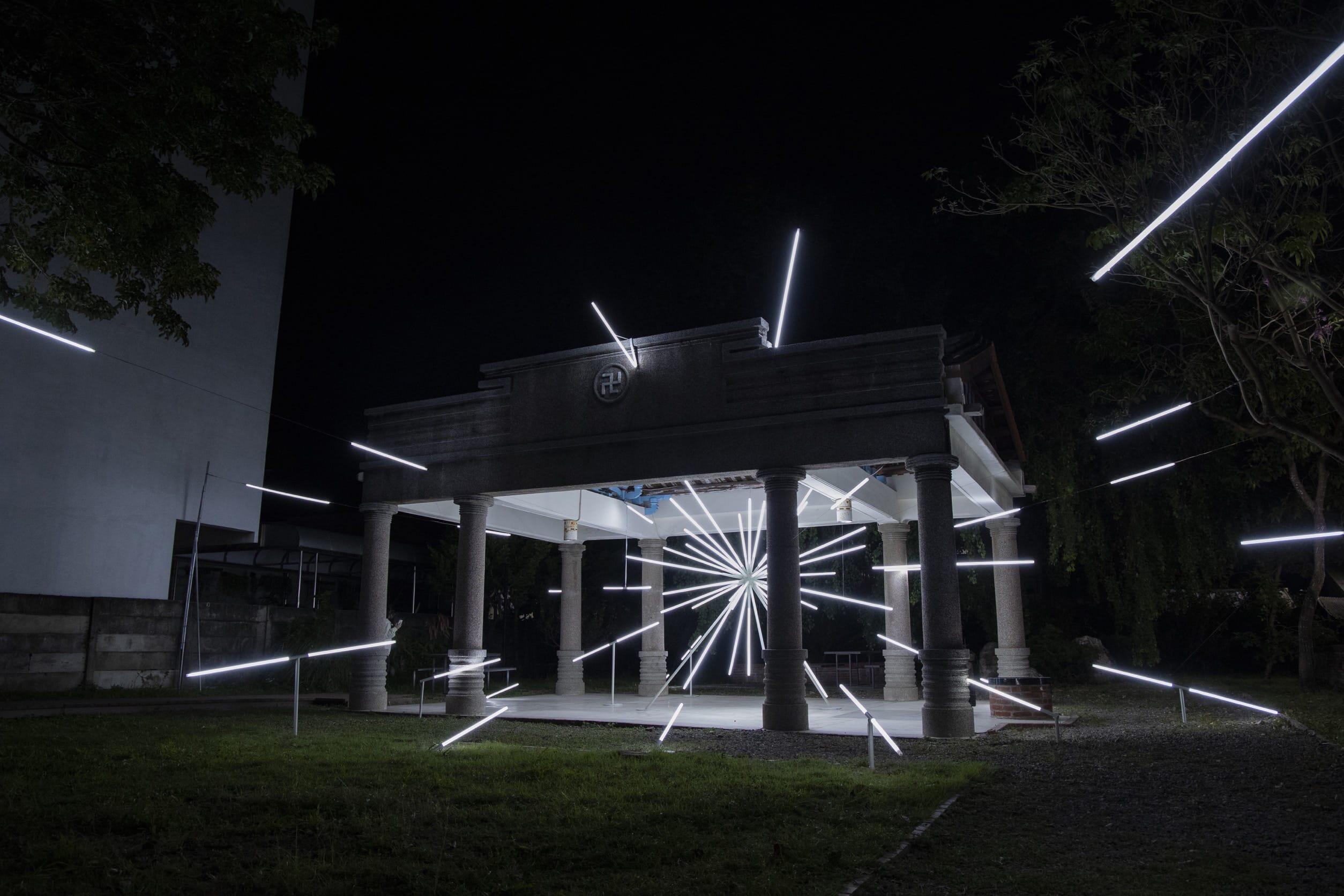 Light in Buddhism is an important metaphor for enlightenment – the awakening or the understanding of truth. Buddha alongside many sacred figures in other religions are often depicted with various forms of halo – surrounding the head or body. In this work, the artist imagined the starburst form of a halo – revealing both the intricacy of the pavilion and its relationship with the neighbourhood. Like a gap in time, the installation comes to life through rays of light. The dynamic yet pure streaks of light emanates an intangible aura while revealing a portal – allowing viewers a peek into the past. The deconstructed nature of the artwork allows for intimate illumination around each of the light tubes, revealing unseen and often forgotten elements. The hyper site-specific work is inspired by its host building – the Xiu De Bai Pavilion (修德拜亭), a former Buddhist temple in the historic town of Yan Shui, Tainan. Built in 1919, the temple has history tracing back to the Qing dynasty and was pivotal in supporting the community.