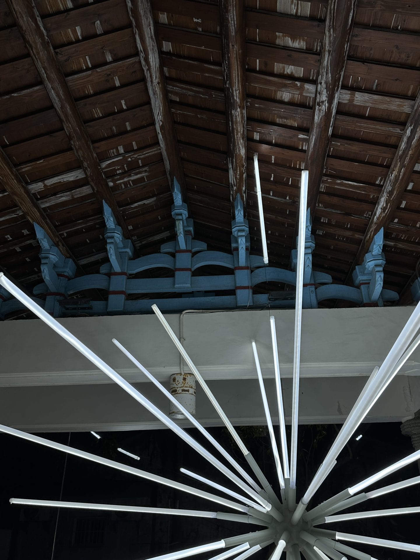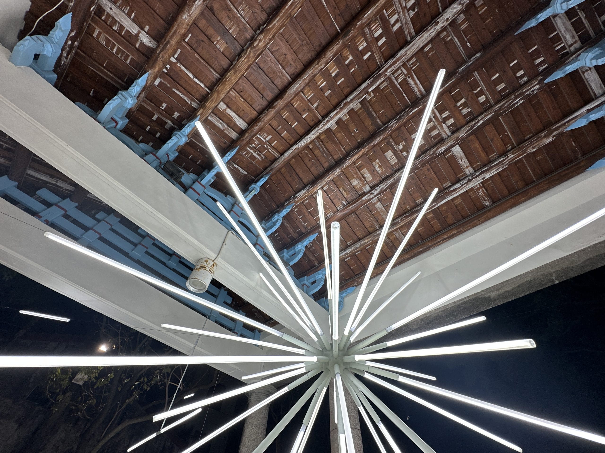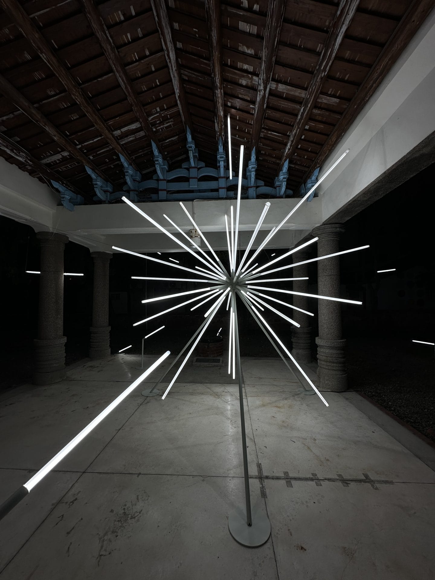Light in Buddhism is an important metaphor for enlightenment – the awakening or the understanding of truth. Buddha alongside many sacred figures in other religions are often depicted with various forms of halo – surrounding the head or body. In this work, the artist imagined the starburst form of a halo – revealing both the intricacy of the pavilion and its relationship with the neighbourhood. Like a gap in time, the installation comes to life through rays of light. The dynamic yet pure streaks of light emanates an intangible aura while revealing a portal – allowing viewers a peek into the past. The deconstructed nature of the artwork allows for intimate illumination around each of the light tubes, revealing unseen and often forgotten elements. The hyper site-specific work is inspired by its host building – the Xiu De Bai Pavilion (修德拜亭), a former Buddhist temple in the historic town of Yan Shui, Tainan. Built in 1919, the temple has history tracing back to the Qing dynasty and was pivotal in supporting the community.