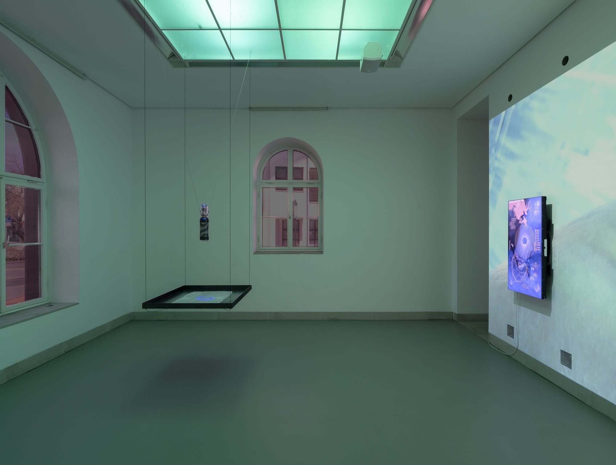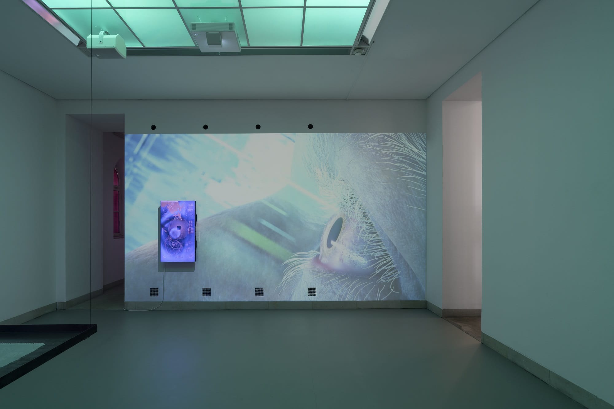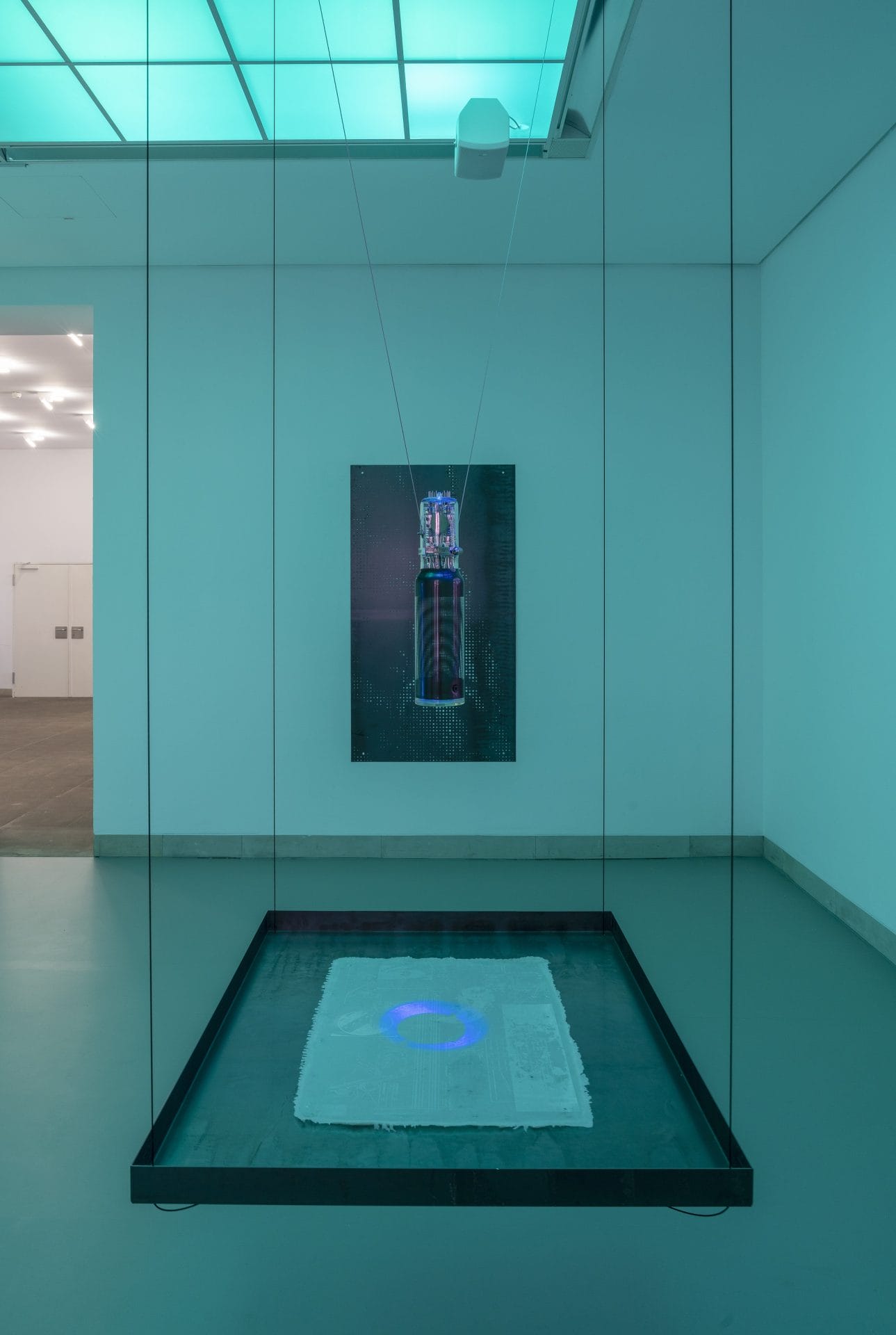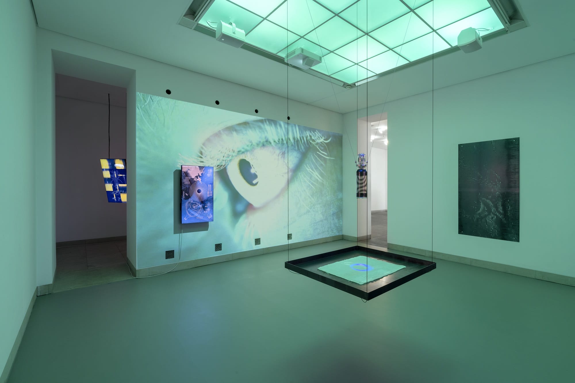 The exhibition also features sculptural works such as NANO DROP (2025), where a blue laser beam passes through a cathode ray tube and a transparent acrylic membrane mimicking the human retina, illustrating the intersection of biology and technology. The second exhibition room introduces BLIND SPOT (2025), a video installation employing neuromorphic event-based camera systems that process movement as a continuous data stream rather than discrete frames. Here, machine vision operates on a micro-temporal scale beyond human perception, producing images meant not for human eyes but for other machines.