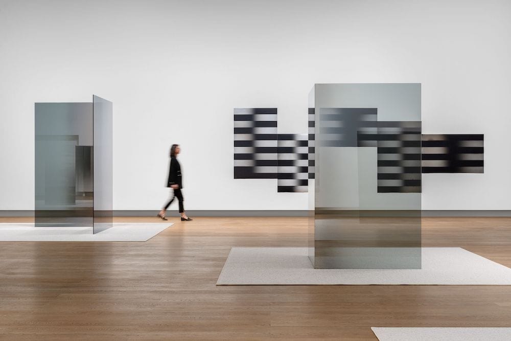 Each glass panel captures and reflects light differently, creating a complex play of shadows and reflections that transform the perception of space. The mural ‘Moving Ways’ in the background adds a visual depth, with its black forms contrasting the transparency of the glass sculptures. This setup not only enhances the aesthetic qualities of Bell’s works but also emphasizes their dialogue with space and light, offering an immersive and contemplative experience for visitors.