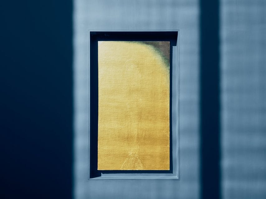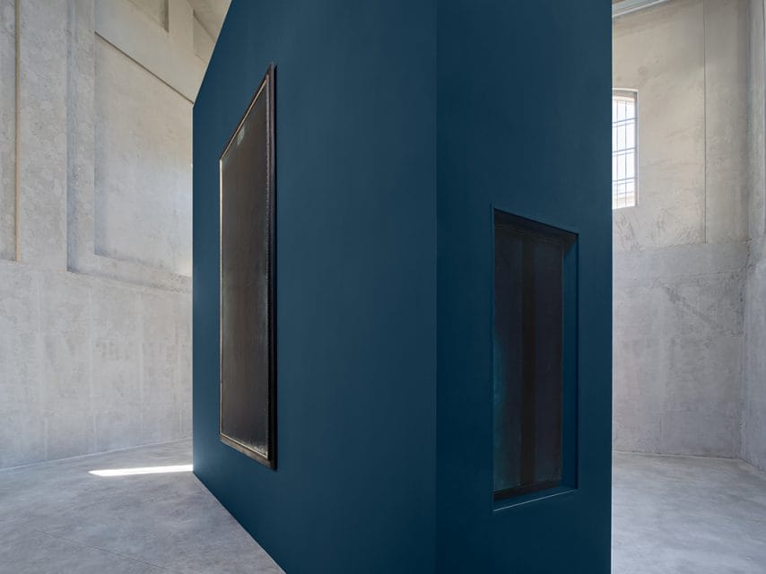 The Cisterna itself becomes an active participant in this discipline. With its industrial cathedral-like architecture, its high ceilings and filtered light, it doesn’t simply host the paintings, it frames them as sacral. The exhibition architecture mirrors a triptych: three open structures, each housing a single suspended canvas. Smaller works are placed in alcove-like niches, suggesting stations of contemplation. The entire installation reads not as a sequence of images, but as a ritual space. A kind of anti-church for believers in silence.