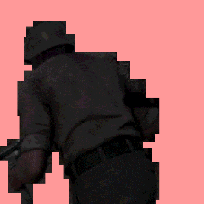 The removal of the background from her compositions further emphasizes the qualities of Lorna Mill ’s work, where content, movement, and edges all coalesce into a new, reimagined space and surface. The pixelated texture of her work is enhanced by the rhythm of the imperfect loop, a technique she employs in pieces such as “Handyman Bill”. This imperfect loop, rather than a linear narrative, guides the subjective meaning of every piece, creating a compelling sense of chaos and urgency. This is particularly noticeable in her animated GIFs like “Wonderful Mom Sons”.