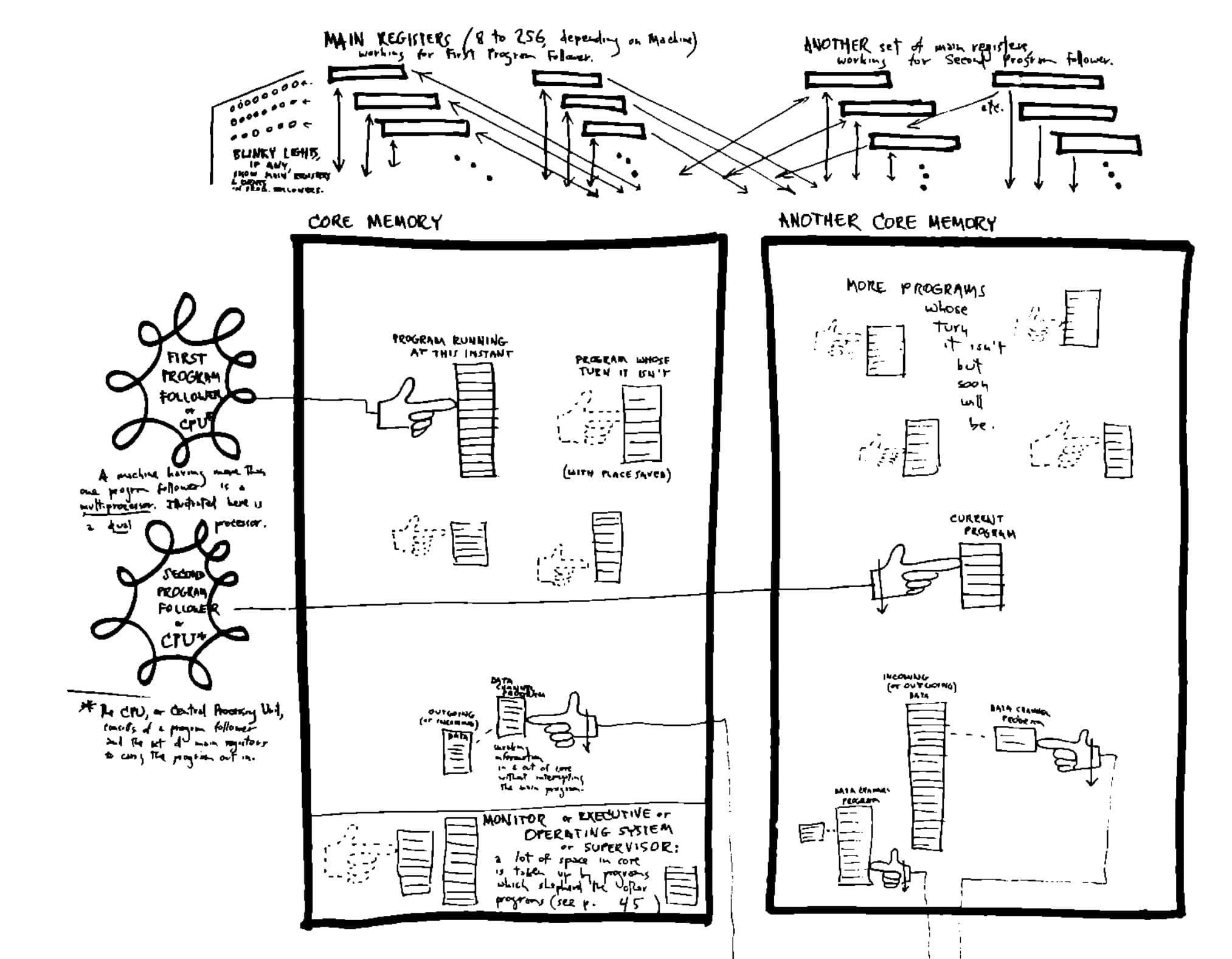 This was the Memex, an imaginary machine conceived by Bush in 1945, a sort of mechanized library of files, detailed in his article As We May Think. It was intended to be an electro-optical machine, a large, translucent desk equipped with buttons that would activate mechanisms to search documents. This device was designed to allow users to move from one document to another in a way similar to how we navigate electronic hyperlinks, enabling better management of large quantities of information. The issue was always the same: how to manage an ever-growing mountain of research. The Memex is, in effect, an ancient form of mass memory: Bush described it as “a kind of mechanized private file and library,” a device where one stores books, records, and communications and can consult them with greater speed and flexibility. In other words, it was a “collective human memory amplifier.” Technology should not aim to replace humans but to enhance human (mnemonic) capabilities, this was the consensus among early computer scientists.