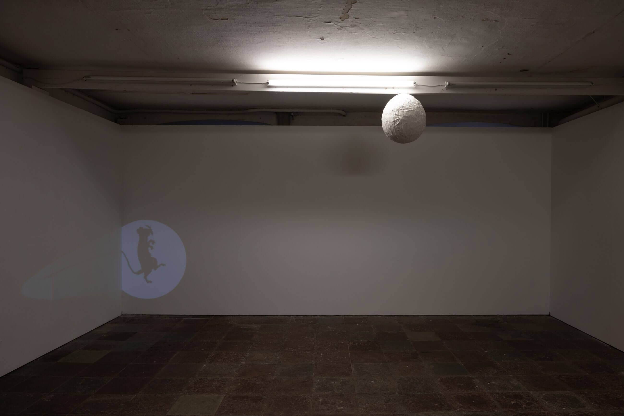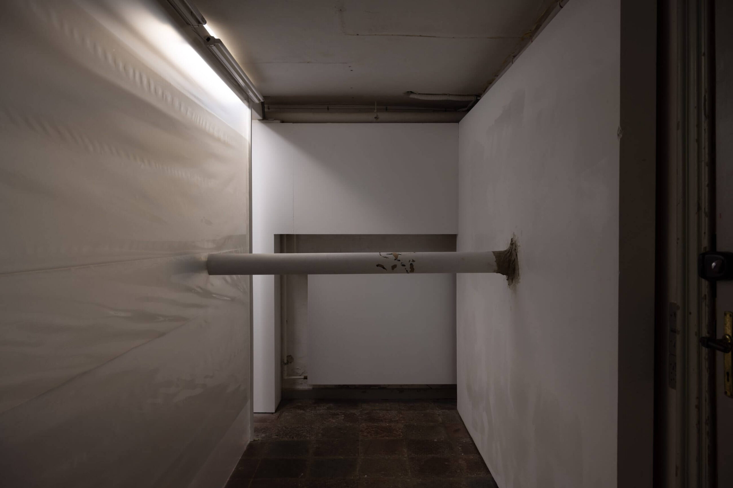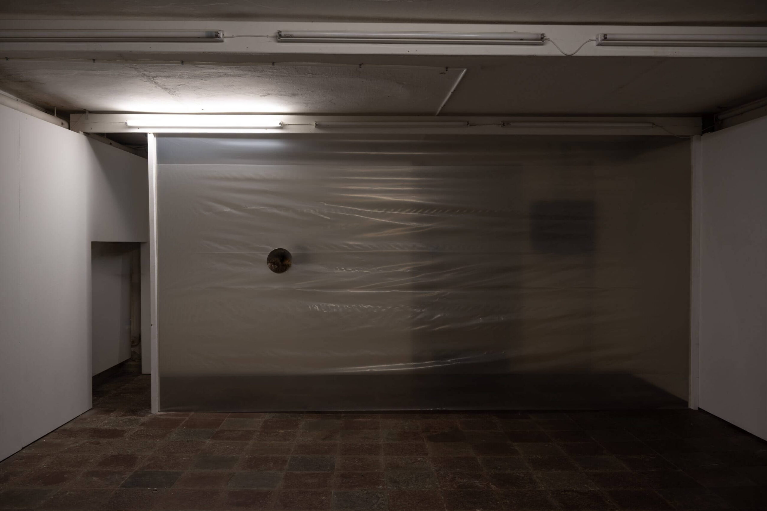 The space at Ping Pong, already semi-subterranean, is bisected by a translucent membrane, a plastic sheet that divides, veils, distorts. Transparency here is deceptive, it lets light and shadows through, but imposes detours. To enter, we have to narrow ourselves, squeeze into the tight corridor that initiates the sequence of rooms. We are no longer distant viewers, but bodies navigating space, like the nocturnal guest described in the exhibition text, caught on infrared camera, cunning, agile, unseen.
