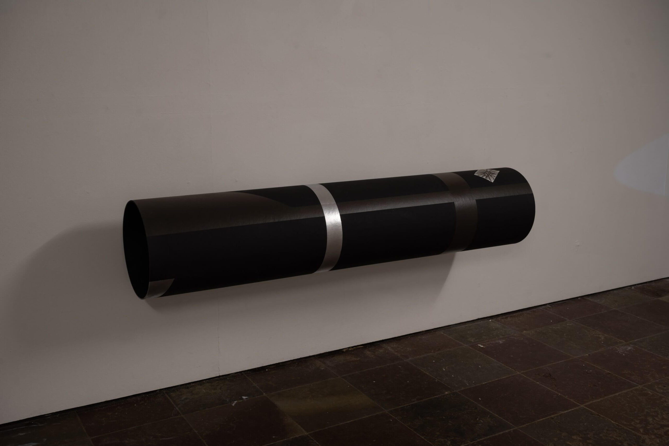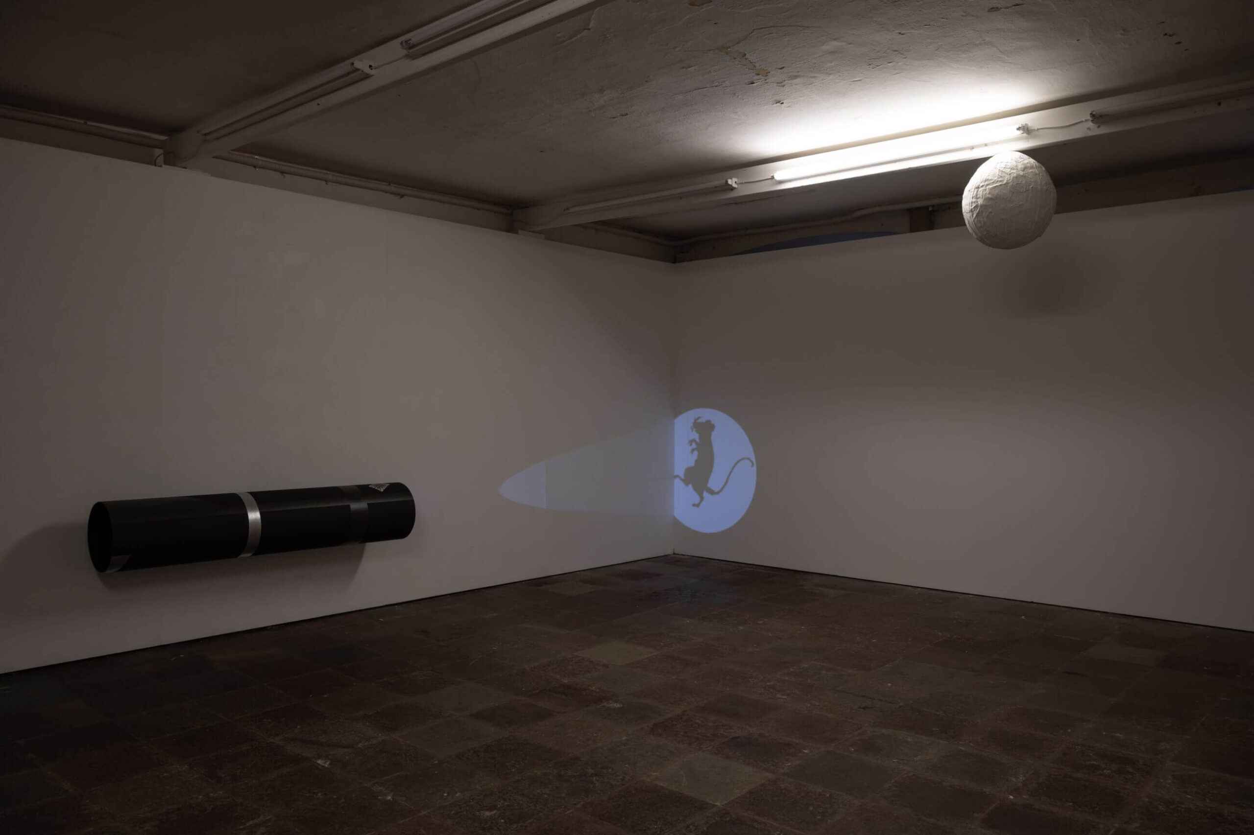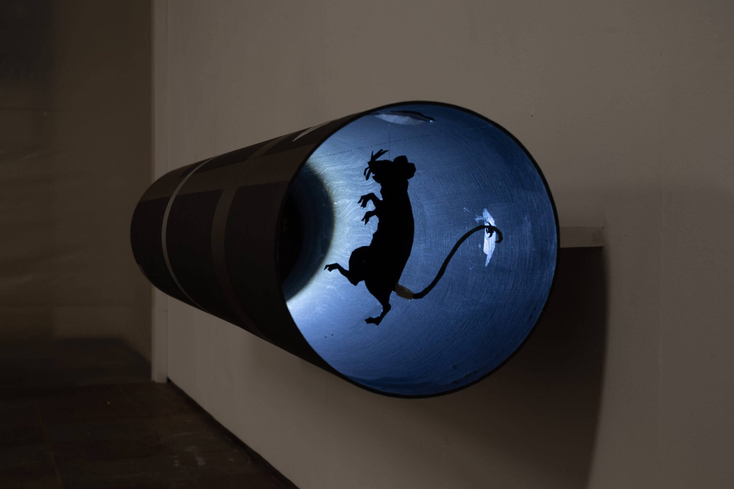 These works aren’t simply “looked at”, they are uncovered. A black tube juts out from the wall like a disarmed cannon, and inside, a pale blue glow reveals the perfect silhouette of a rat standing upright. Projected onto a wall, the image becomes a signal, an urban bat-signal, but animal, clandestine. It’s a shadow animated by light and memory, a trace of a living presence that once inhabited the space.