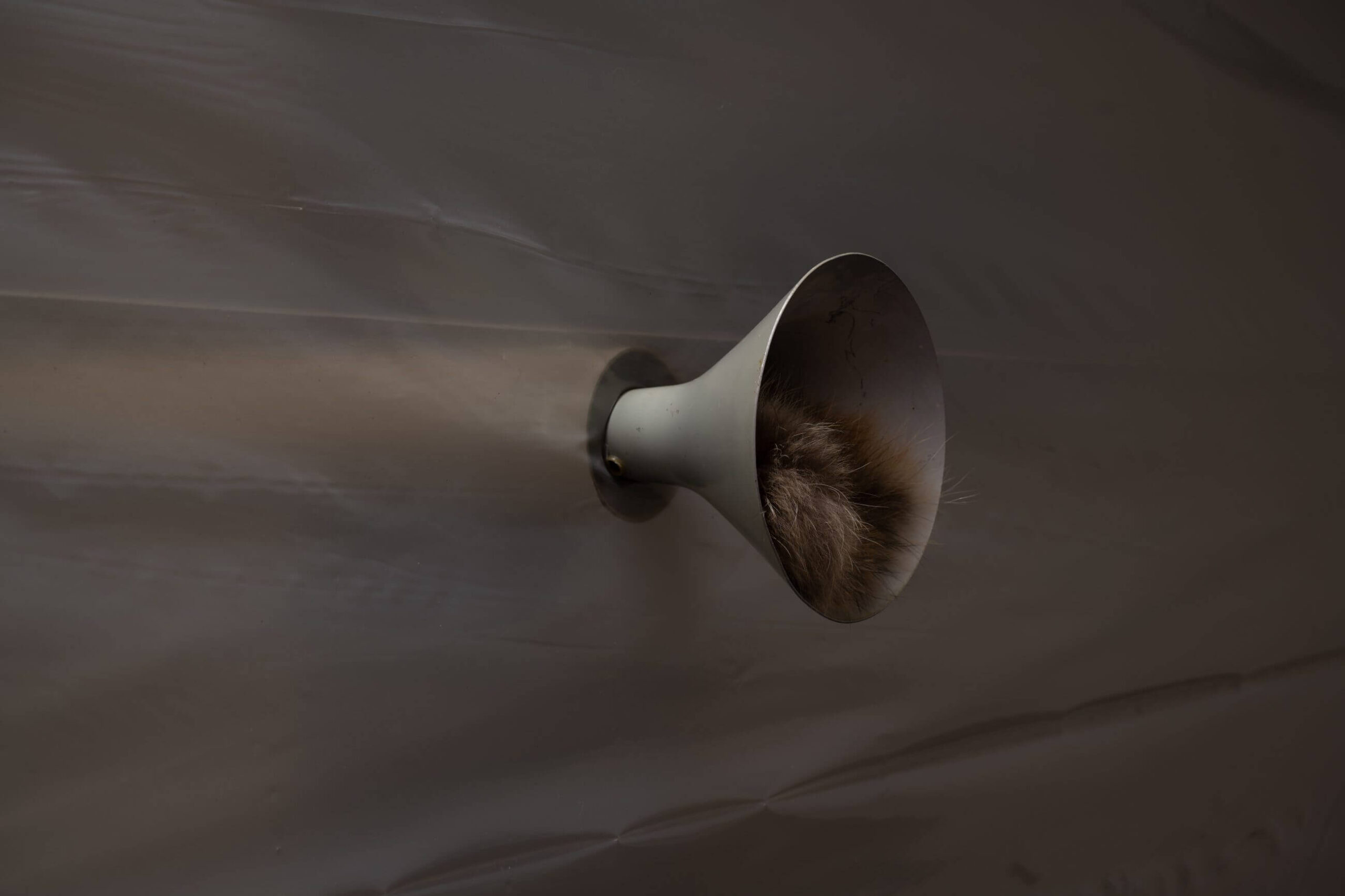 Further on, an acoustic horn, or perhaps an industrial siren, emerges from the wall. Instead of sound, it emits a tuft of brown fur, as if the animal had taken shelter there or curled up inside it. A speaker of silence, a mouth closed off by a presence.