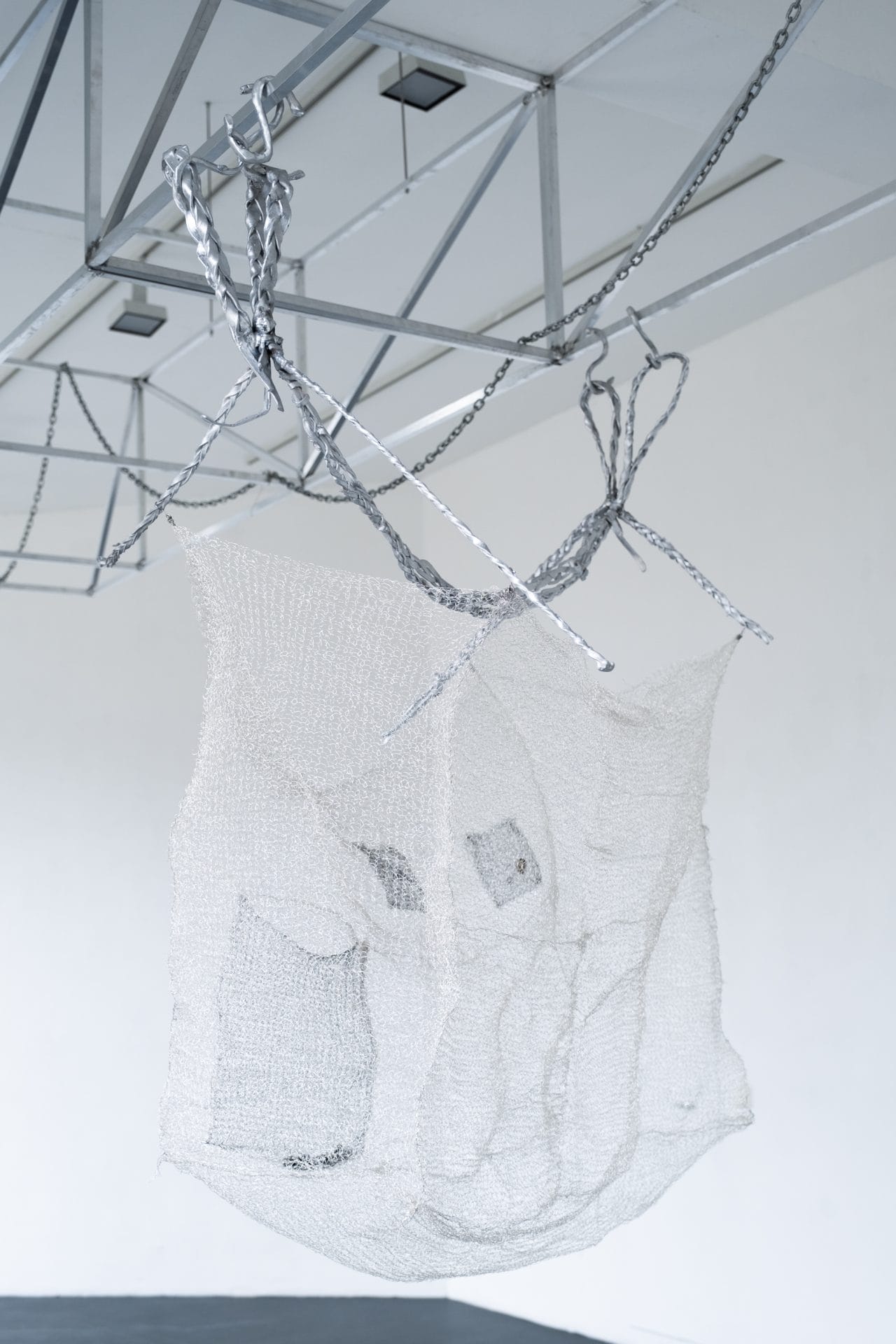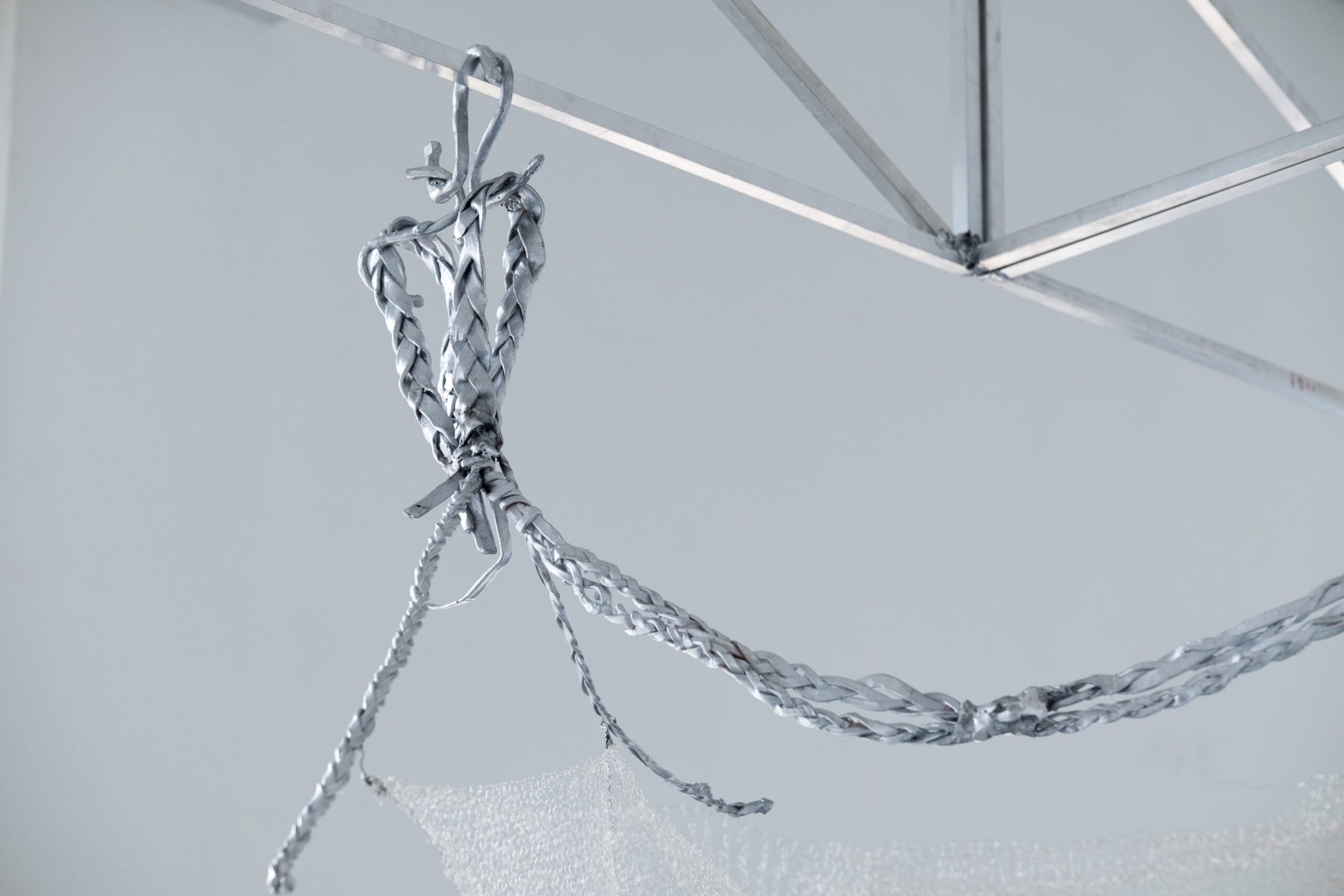 A Base For A Crane: A home of materials, nets, machines, spirits, and workers; a community of connectors nestled together. From liquid to fixture, from grass to sky, from lifting to landing. A complex tapestry of intricate root systems, remaining fragments, and heartbroken ridges. A savannah of reeds holding hands and arms to form a foundation of support; a base for flight, movement, and time. The exhibition includes collaborative works made by sculptors Maija Fox and Valo Vairio, created under the mist and moon down Yhdystie, a passage from the city to the swamp. Flying machines flying over woven wetland grasses, while ovens full of handcrafted laces and wax hooks cook over time. A familiar trust, a sense of compassion, lingers in the spines of leaves, arms of branches, chains of tracks, in the heart of the function. This environment, with all its internal logic, has continually fed and fueled the process of making. A resting place for the crane birds and a home; grown by friendship.