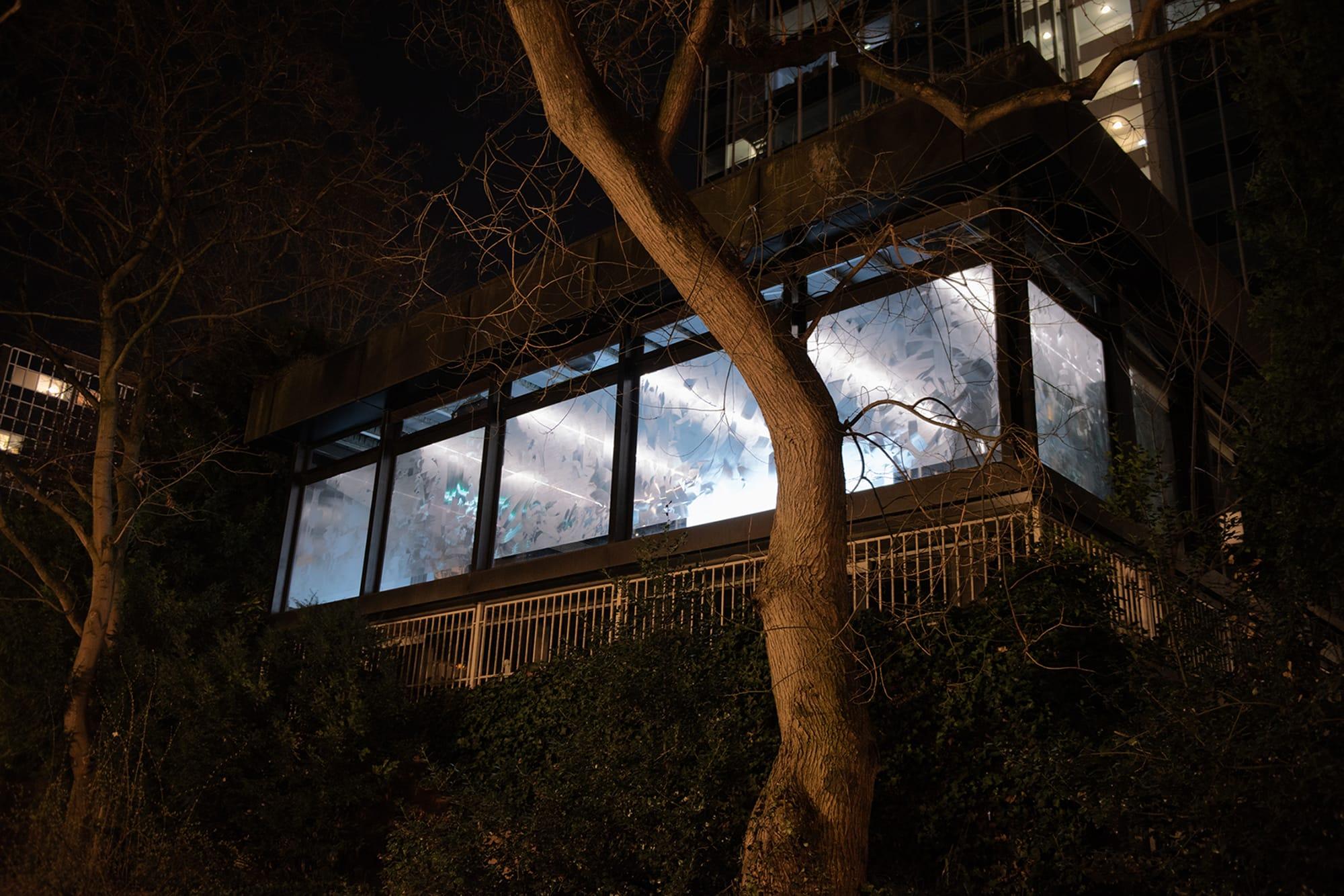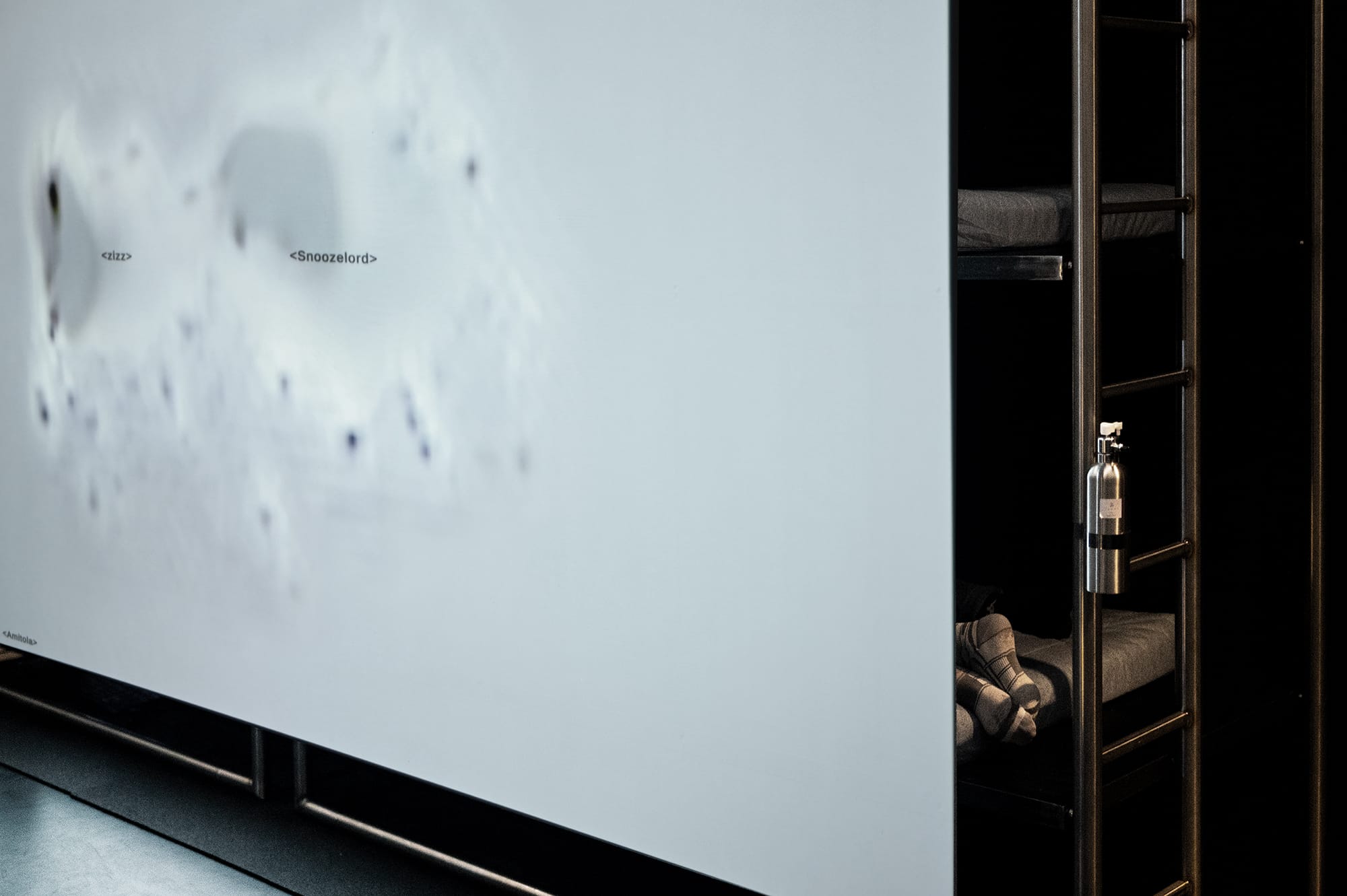 At its center is the digital and participatory life form Latent Entity, which is linked to the sleep of people around the world, across different countries and time zones [2]. Their individual sleep patterns are recorded via a tracking system developed by Dörr and transmitted in real time to a digital entity—a kind of game character. Based on the participants’ individual and collective sleep phases and cycles, Latent Entity manifests as an audiovisual projection in the glass architecture of saasfee*pavillon, evolving autonomously over time. The exhibition stages a fictional nocturnal workspace for the participants: at night, it transforms into a sleeping space, as the specially designed Sleep Station, on which Latent Entity becomes visible, serves as a sleeping retreat at the back. Visitors can also get involved in the cluster structure—either within the interactive Sleep Station in the exhibition space or remotely using individual Sleep Kits from home.
