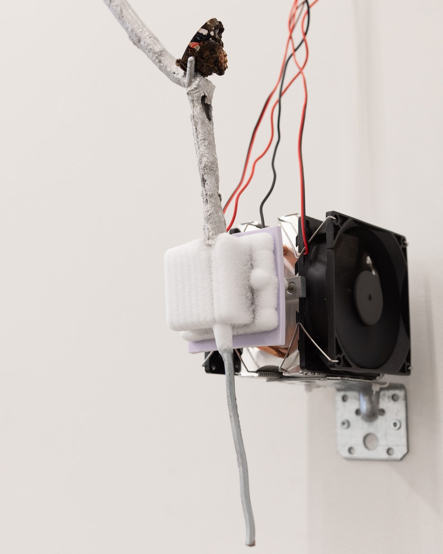Zulli’s installation, mounted on the exhibition wall, embodies a digital landscape, where computer cooling systems merge with natural elements—a stone, a butterfly, and aluminum-cast tree branches. The cold air forms a thin layer of ice, isolating and mechanically preserving each organic shape, creating an aseptic translation of a landscape. This transient ice layer binds the electronic devices with selected natural objects, bridging the artificial and the natural. - Davide Zulli, Landscape Reinforcement #2, 2024
