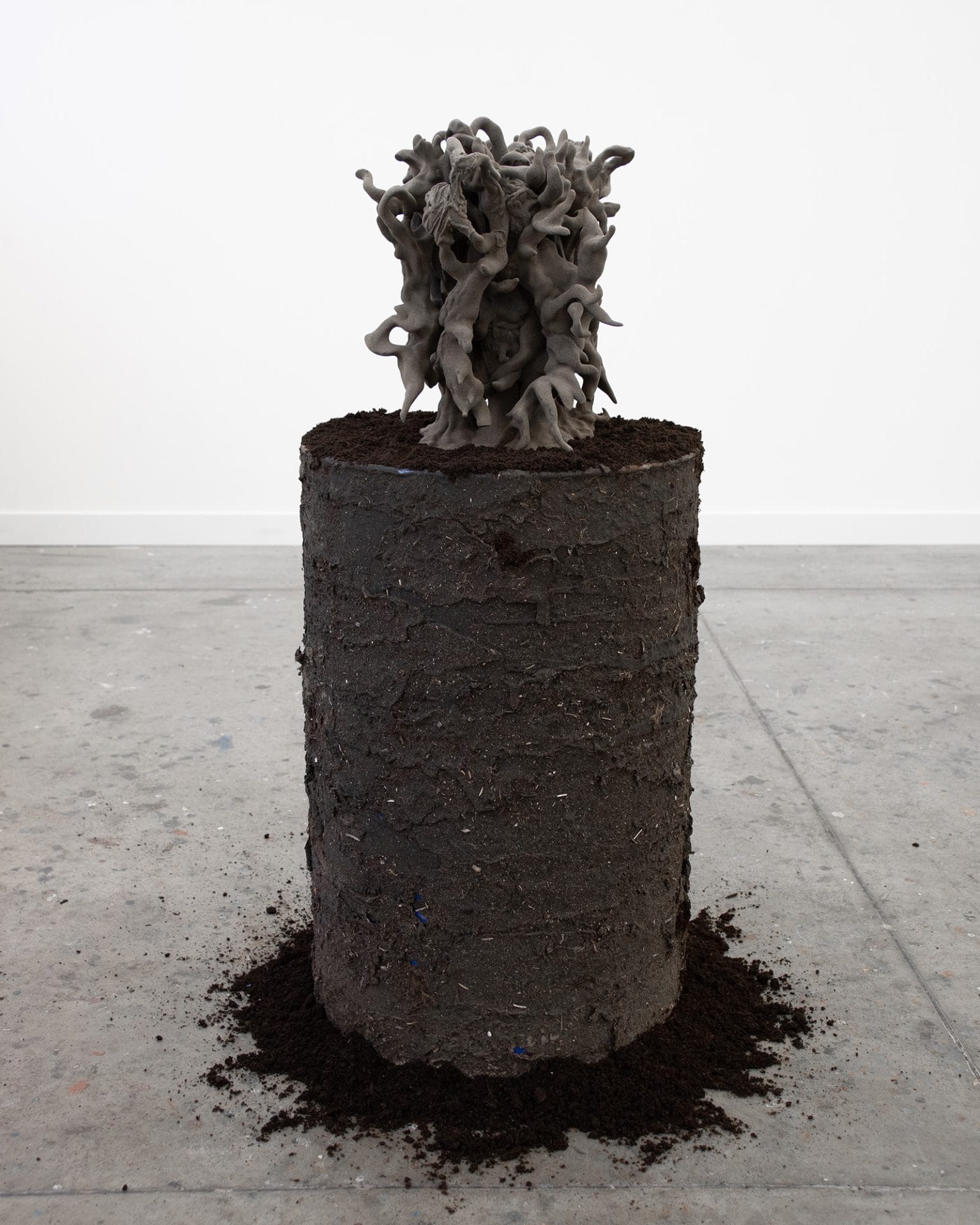 Mathias Mu’s sand-printed sculpture rests on a pedestal made of earth and an oil barrel, merging digital and physical elements. This piece is an amalgamation of three 3D sculptures unified into a single form, emphasizing the possibilities of digital fabrication processes. Blurring the boundary between digital and physical realms, the visual features of Mathias Mu’s digitally designed work resemble natural, organic forms. - Anton Cla, Cyclepaths, 2023