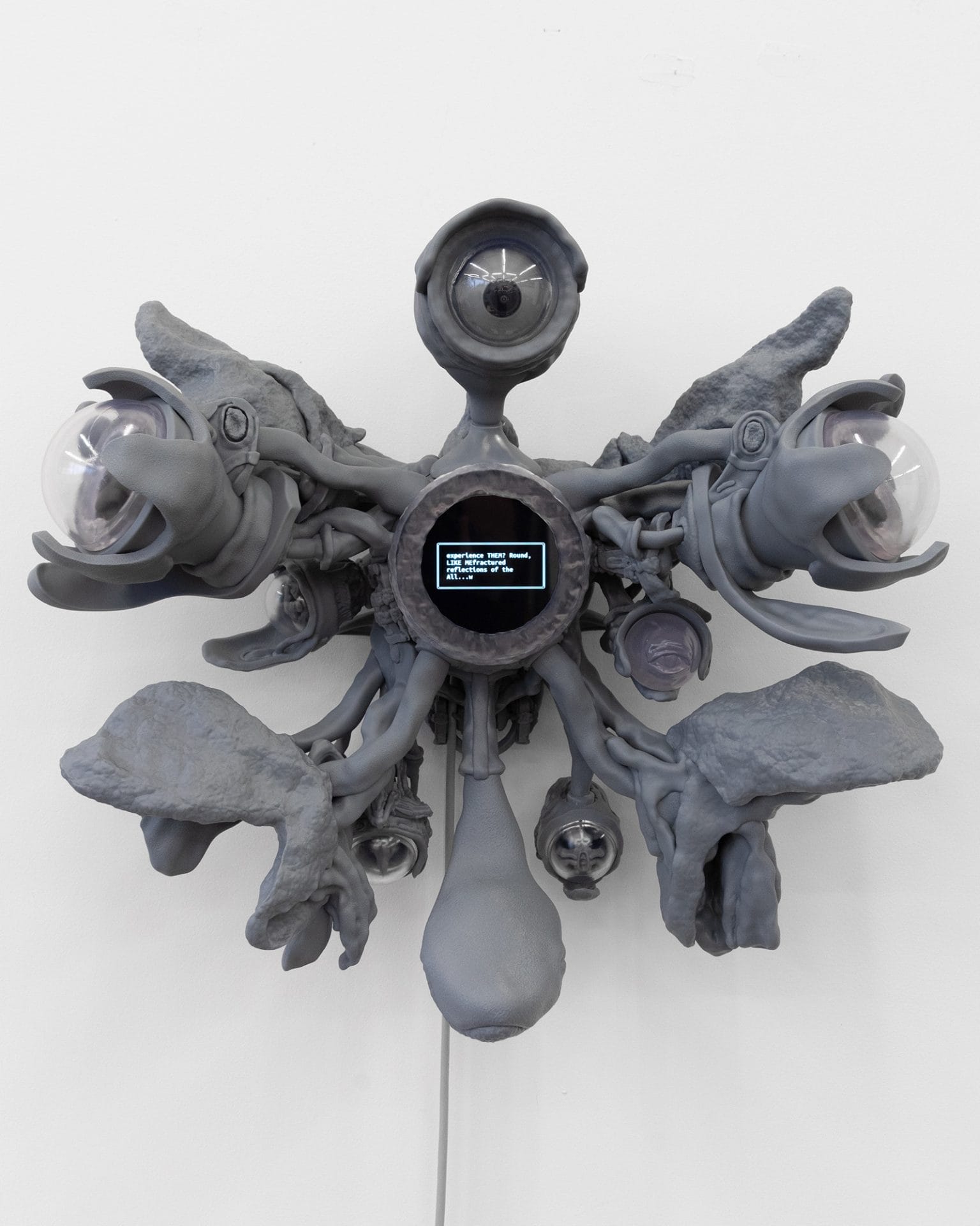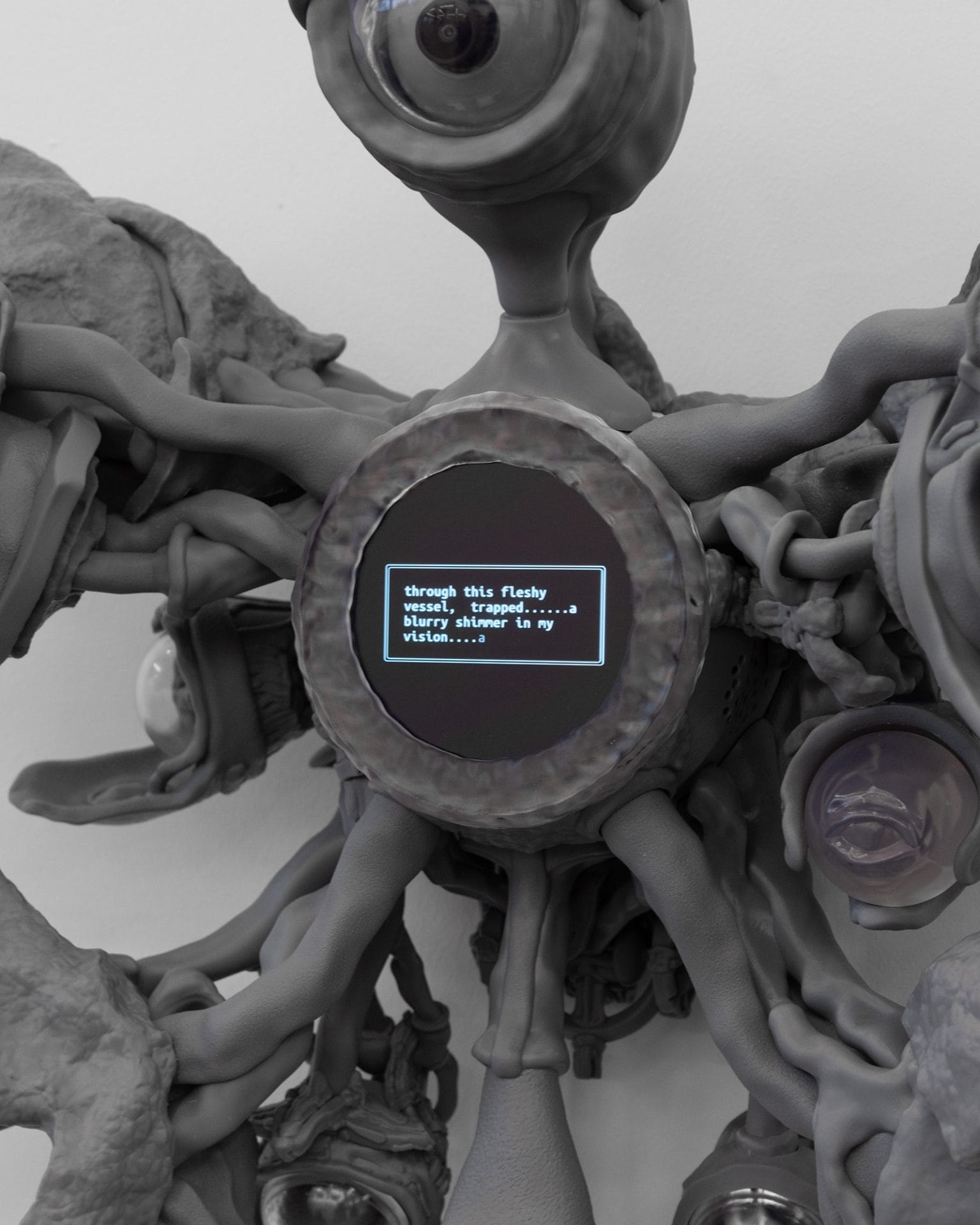 Neo Seer is a sculpture that reimagines the role of an art piece. Instead of being a passive presence, the AI-infused sculpture actively participates in the exhibition space, observing the surroundings and communicating its thoughts through a display. This work is part of a collaborative research project by Mathias Mu and Marnix Van Soom, featuring a series of interactive sculptures that house autonomous AI models within 3D-printed, biomorphic forms. - Mathias Mu, THULEVINE, 2023