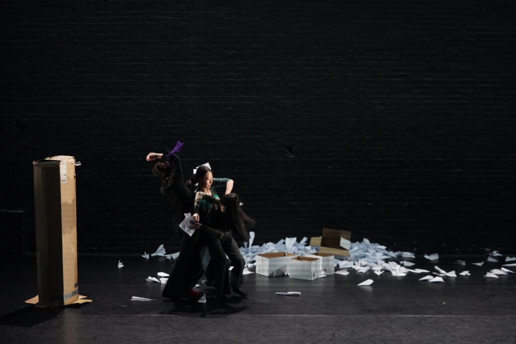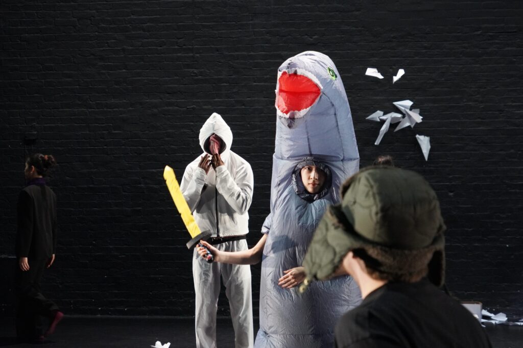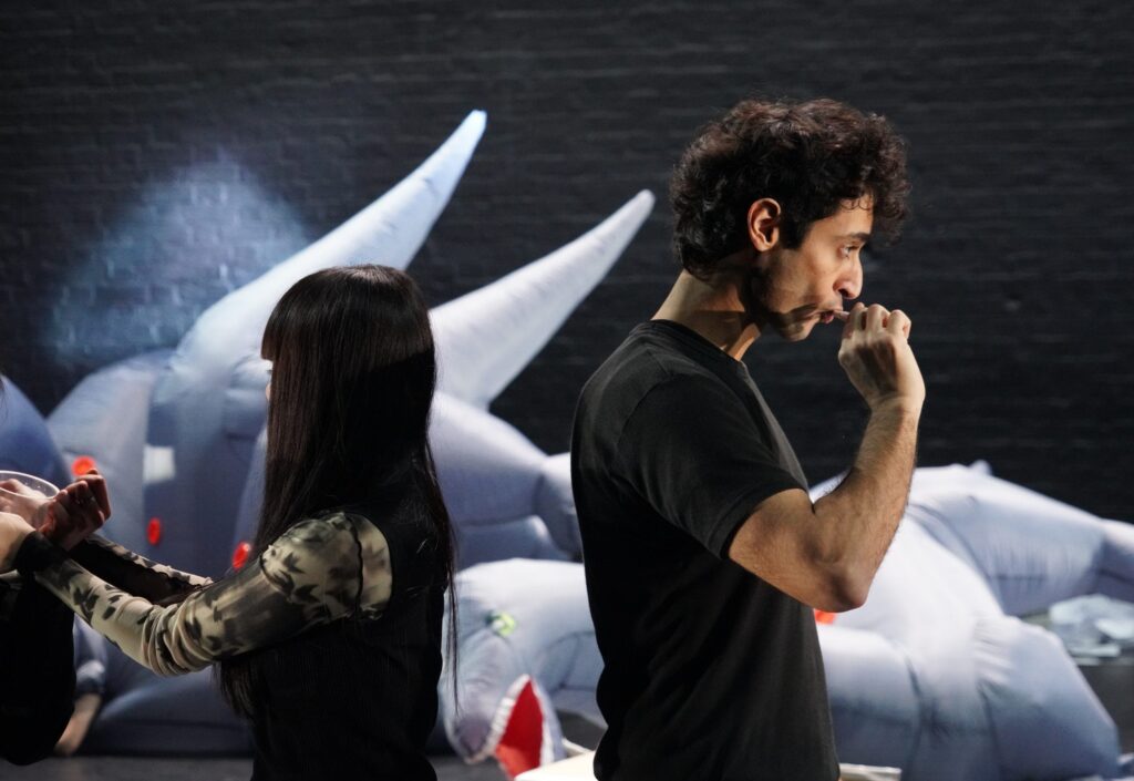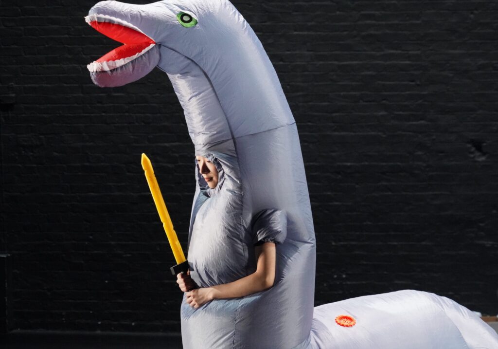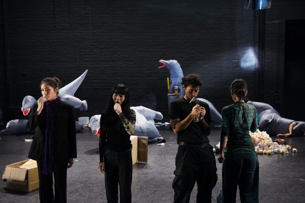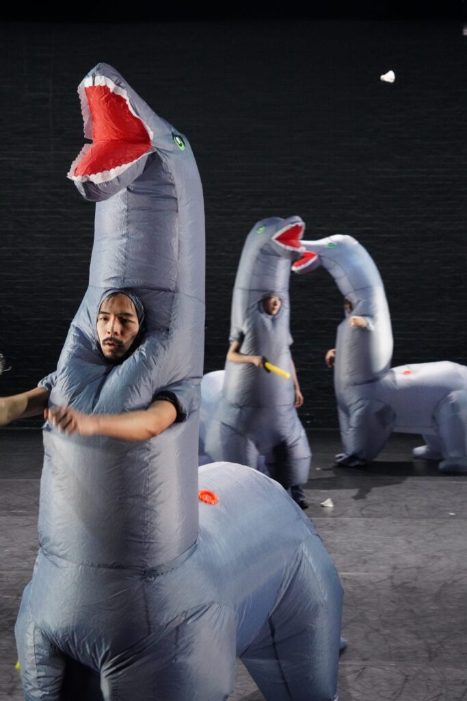 With barely any dance as we know it, the piece unfolds as an erratic sequence of vignettes, each a cacophony of the absurd. These composites unravel with escalating chaos. A line of four performers wrestle to wear a pair of glasses before engaging in a synchronised toothbrushing ritual, collectively spitting into a shared glass. A man dressed in an infinite loop of sweatshirts zips them on and off in a Sisyphean display, only to finally reveal his identity beneath the layers. Another figure, clumsily hopping on stage to sing off-key, drops a box of individually wrapped squeaky toys. Scattered across the floor, they are used by the dinosaurs to bury the hapless announcer who had earlier warned about pickpockets. The impression is that of an exaggerated synthesis of a hectic tube journey someone fiddling with toiletries, singing out of pitch, huffing impatiently, or accidentally dropping all their belongings on the floor. This time, however, this parody of the banal unfolds on stage all at once, under clinical lighting, before a disoriented and silent crowd. A few dance moves repeat energetically as to emphasise the cyclical inexorability of time. With the cast’s piercing seriousness, the performance demands no embellishment, cutting through with raw intensity.