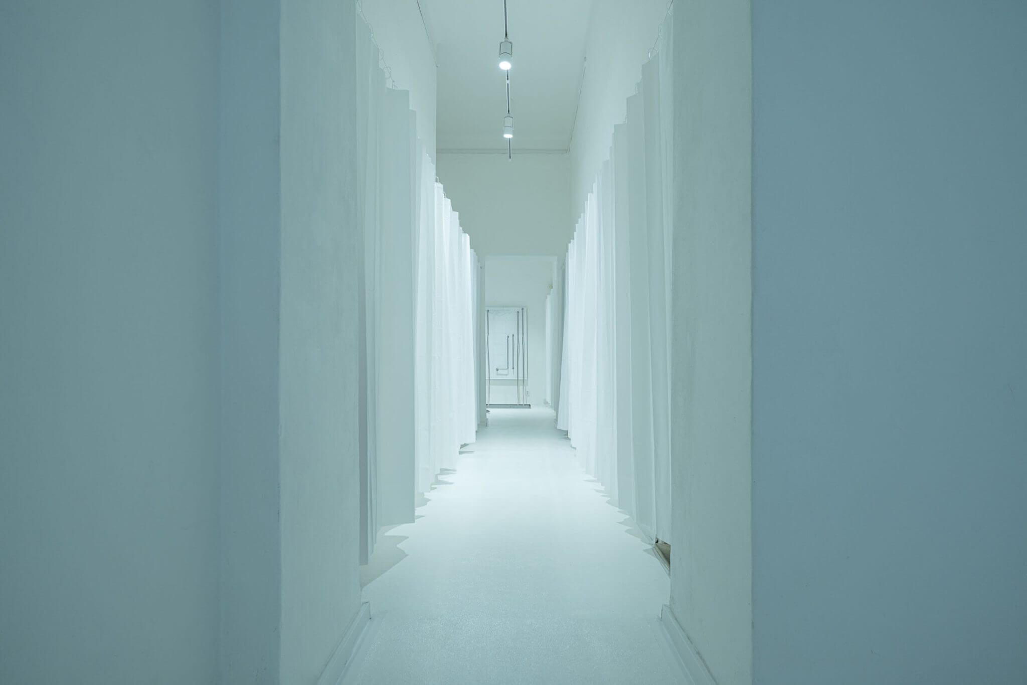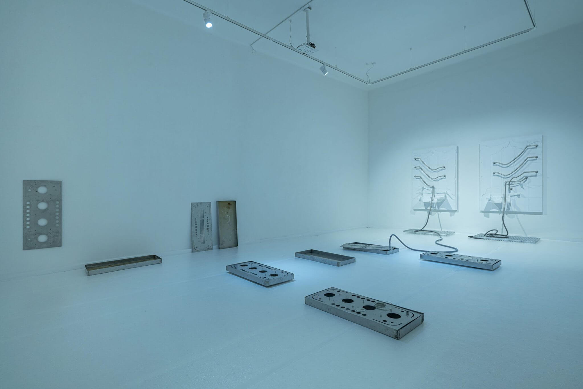 The room is cold. Not just due to the dominance of metal and milky white surfaces, but because of that altered silence that hangs only in liminal places, waiting rooms, locker rooms. Johannes Tröstler’s ambient soundscape hums imperceptibly underfoot, a continuous tremor, almost pre-human. Adam Rýznar’s exhibition design is anything but neutral: it’s clinical, surgical, surveyed. The space asserts itself as a controlled organism, and yet, contaminated. Prokhor Maserov’s graphic design isn’t seen directly, but it’s felt in the quiet typographic austerity that threads through the show like an invisible signature.