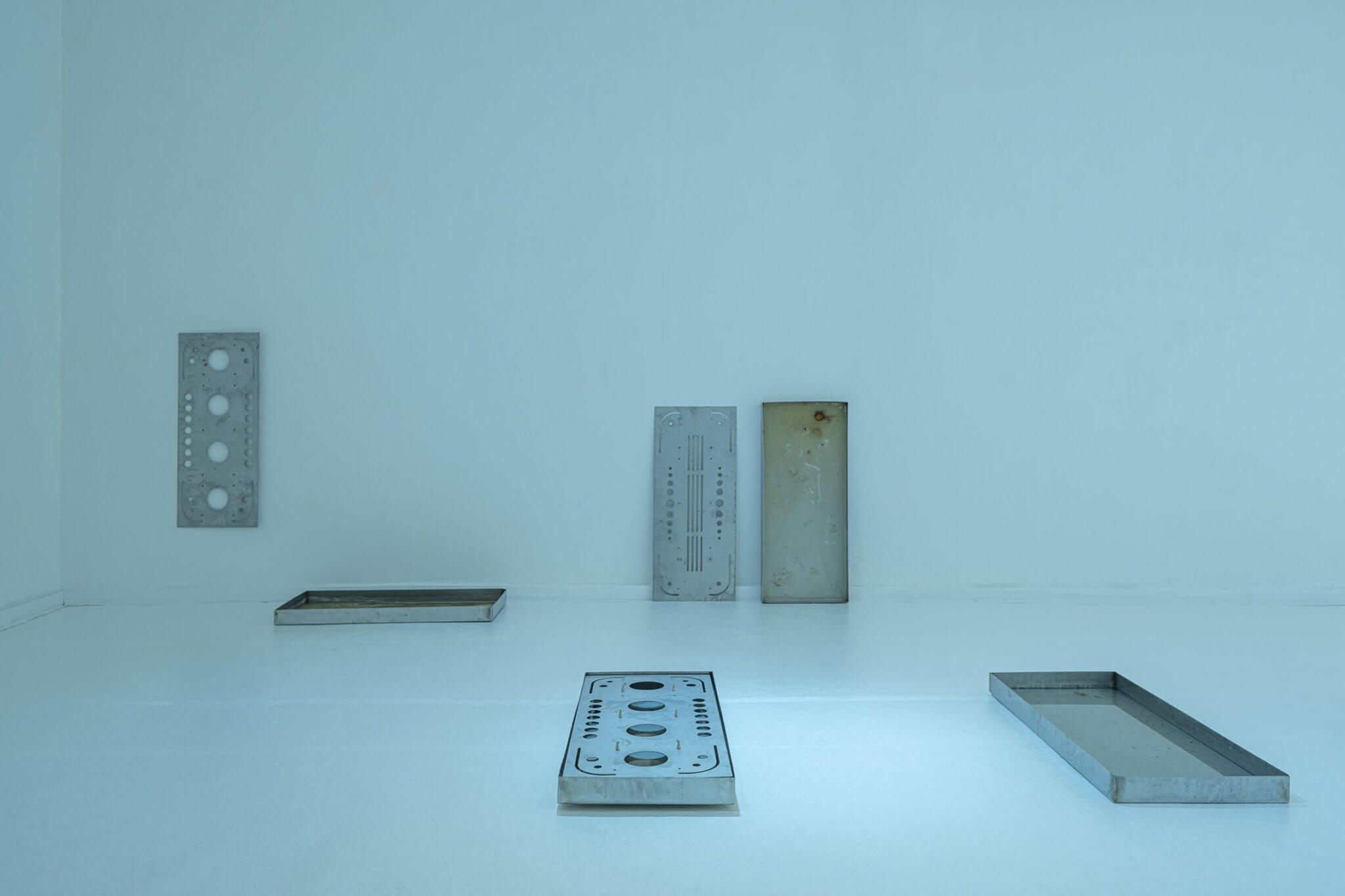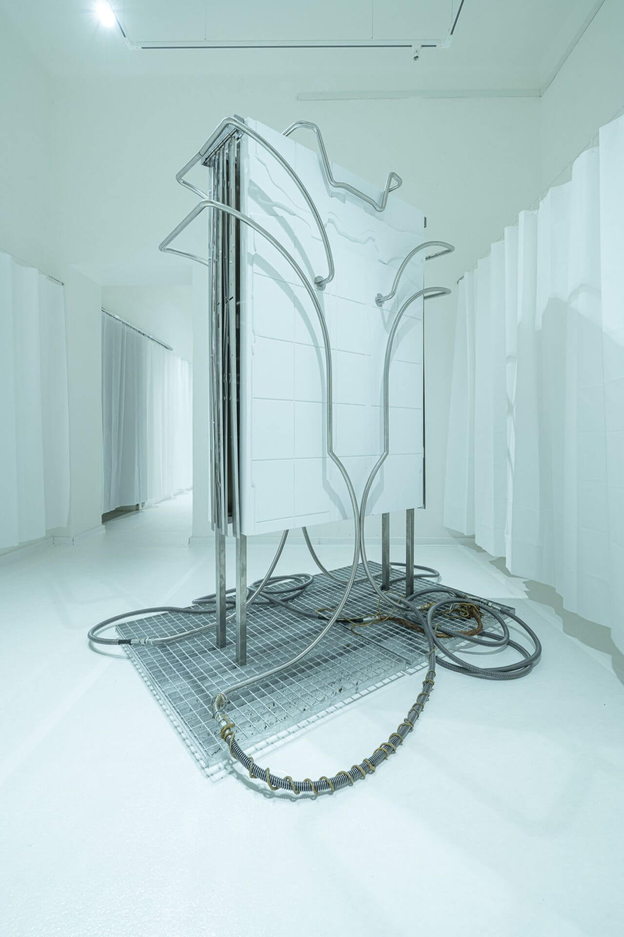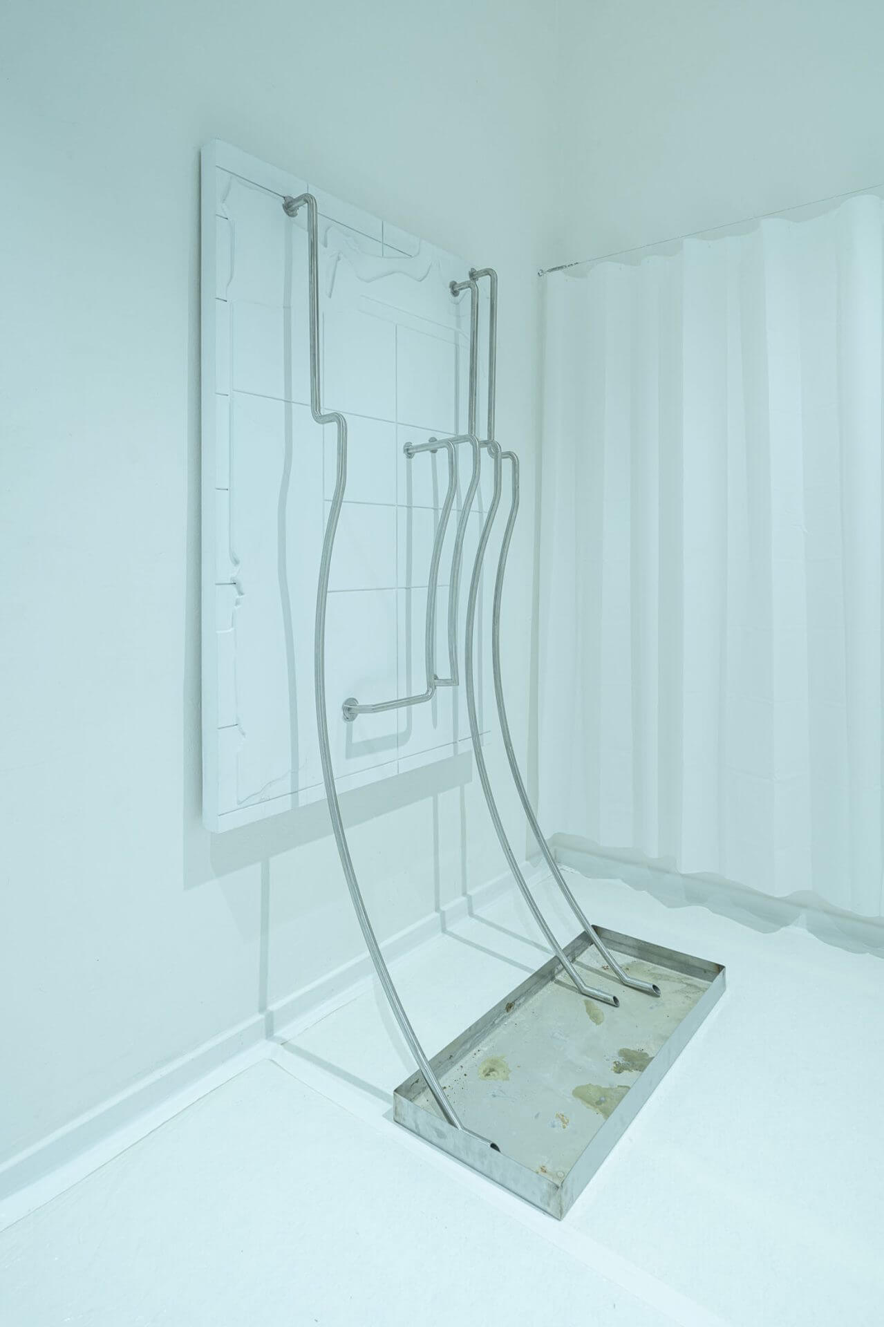 The gesture is surgical even in the material choices: brushed steel, galvanized grids, mirrored-yet-matte surfaces, traces of use and abandonment. There are no bodies on display, and yet everything screams presence. The presence of someone who washed, medicated, hid, perhaps even transformed within these walls. The “feminine” is not iconographic here, but intrinsic, almost endocrine. The title itself, Begone Estrone, echoes an exorcistic injunction toward a female hormone: a tension that is both corporeal and ritual, medicinal and superstitious.