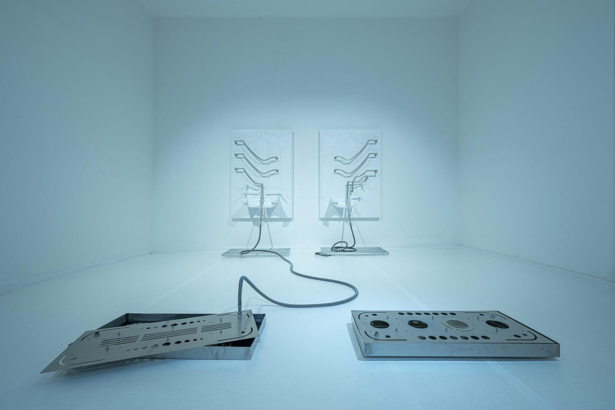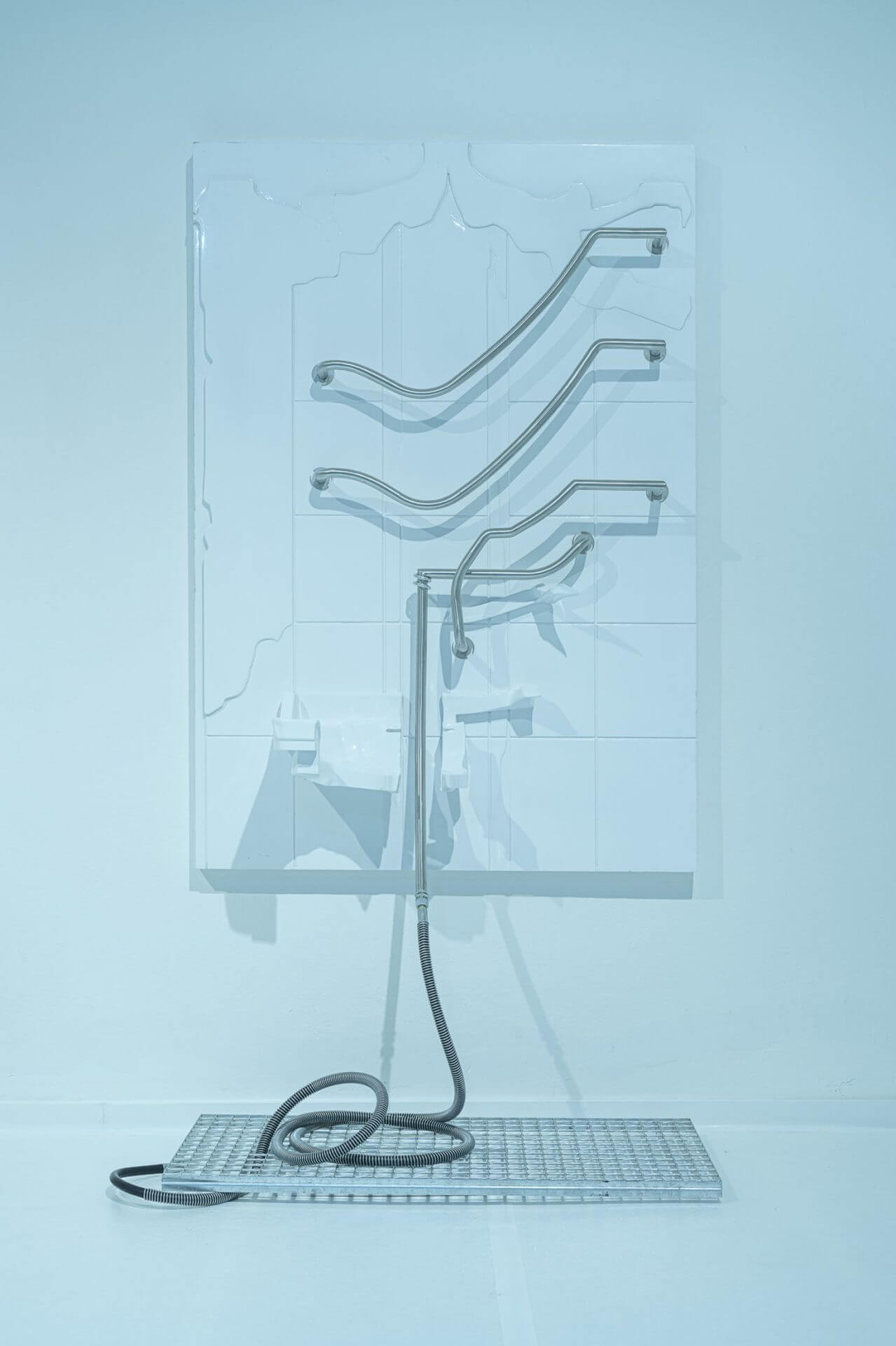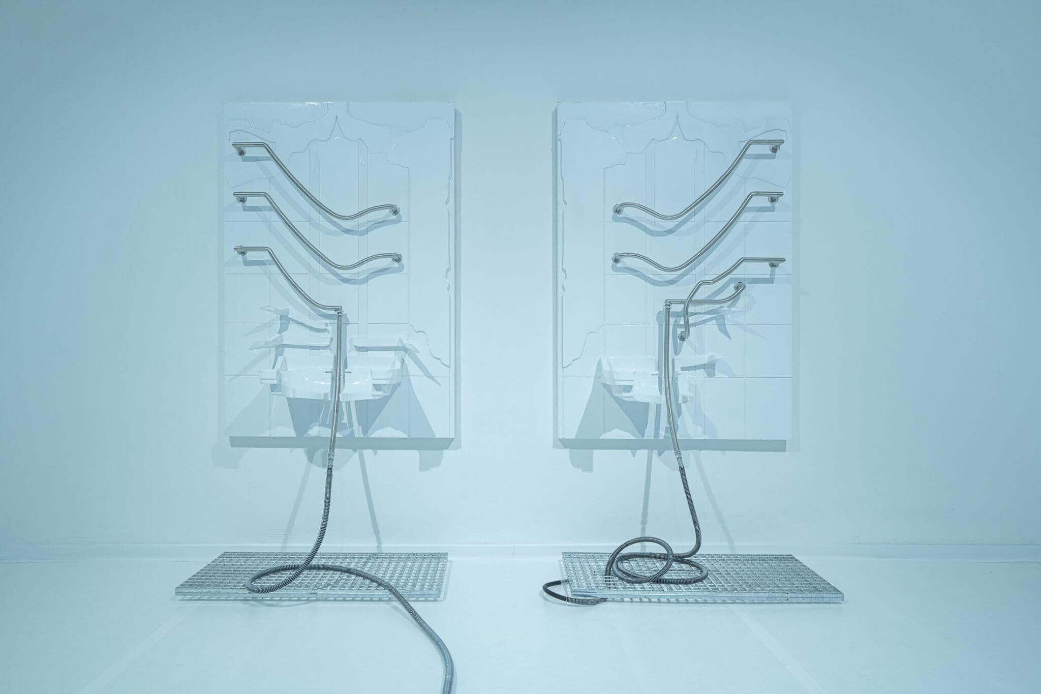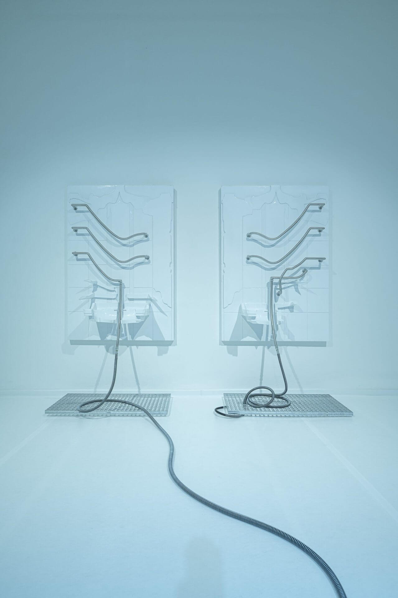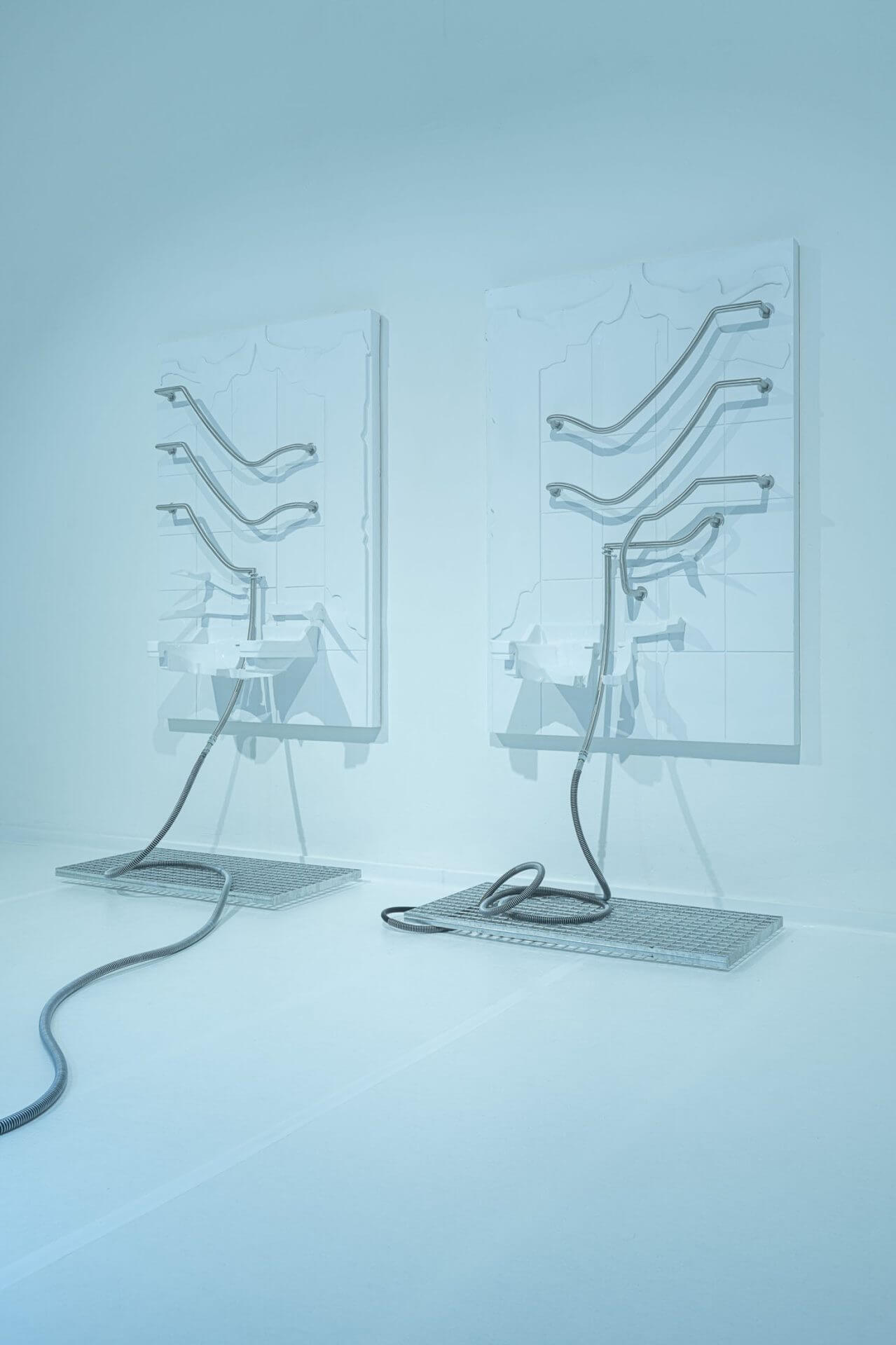 Scattered across the gleaming floor, metallic plates and flat surfaces resemble discarded machine carcasses. Vertical wall elements evoke sacred silhouettes reduced to plumbing: twin installations with stainless steel hoses hanging down like mechanical limbs or instruments of futuristic ablution. The bathroom here is both simulacrum and threshold, sacred and profane cancel each other out in a glacial visual coherence. Each object, meaningless in isolation, becomes a vessel of meaning precisely because of its displacement.