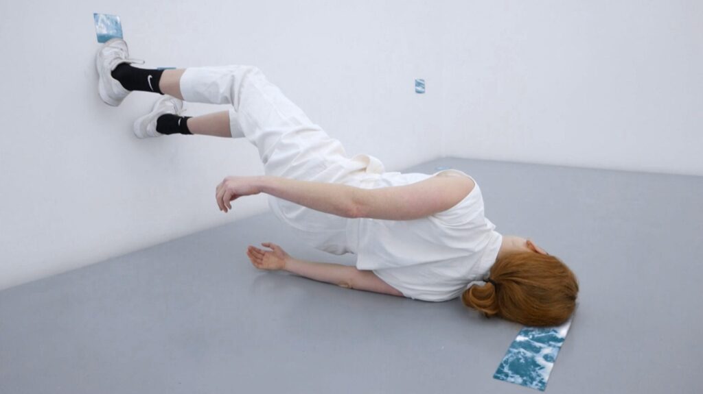 A woman lies precariously on the floor, with one part of her body heavy and still on the surface, which is defined by a grayness that suggests a vague possibility of dematerialization or, in any case, problematizes its very materiality, while the rest of her legs rest against the wall. In contrast, at the extreme margins of the figure, the head and feet, digitally generated images are inserted and placed in post-production, acting as media interfaces that interrupt the apparent continuity of the space, suggesting openings into other dimensions. Rachel Monosov’s performance, in which the action is delegated to third parties, is not an isolated case. It fits into a strand of performative practices that are redefining the nature of certain contemporary performances. These actions seem designed to exist within aseptic architectures, in the most literal sense: “germ-free” spaces, purified of any sensory interference. The hyper-aestheticization of these works brings the white cube closer to environments such as Apple Stores: minimal, sleek designs dominated by a perfectly codified technological aesthetic. In these low-tech capsules, performers blend with technological language, assuming the characteristics of the devices we use daily. Slowed movements, controlled postures, functional clothing: every element of the body seems to align with the minimalist design logic of the space, in a process of technological embodiment. An example that amplifies this reflection is Hustle Harder by Adam Linder, which radicalizes the concept of the service-body within a rigidly codified environment.