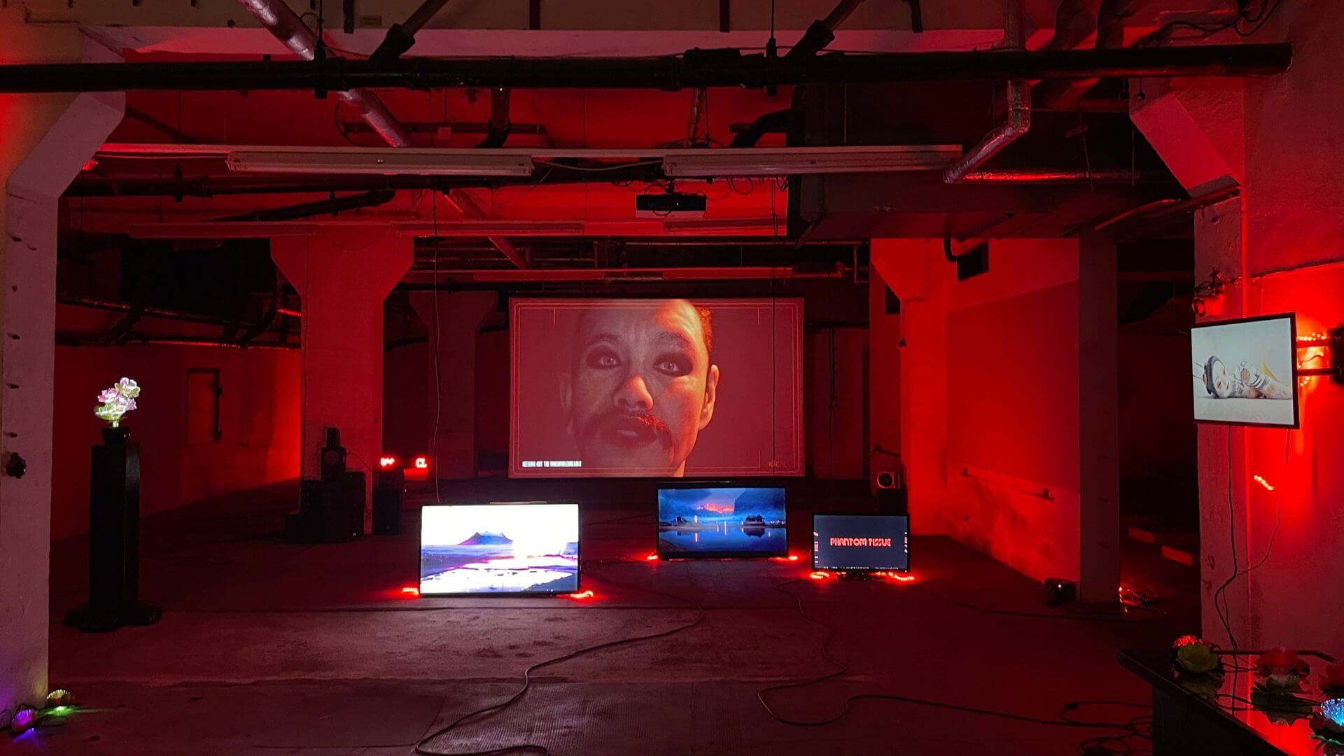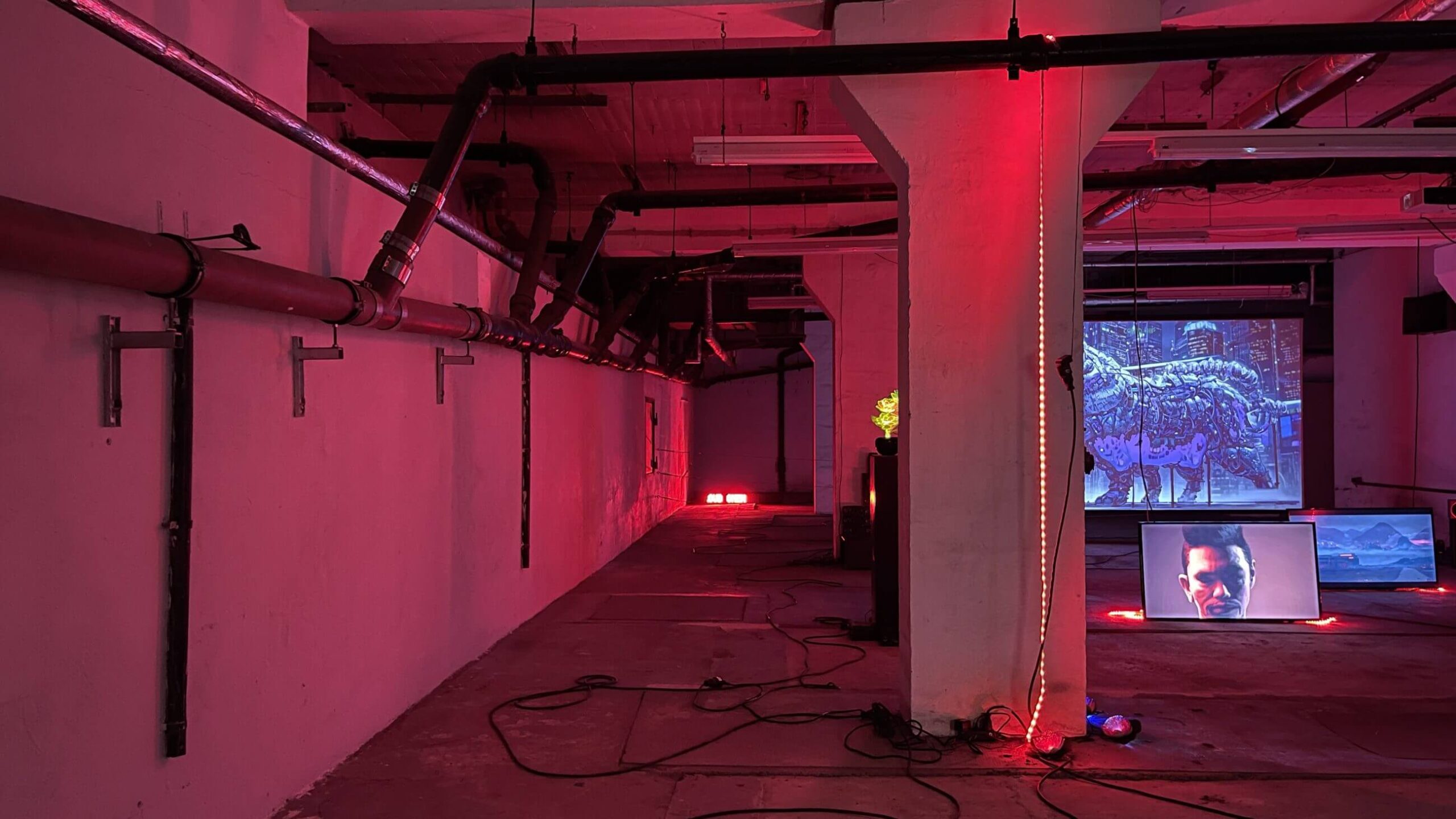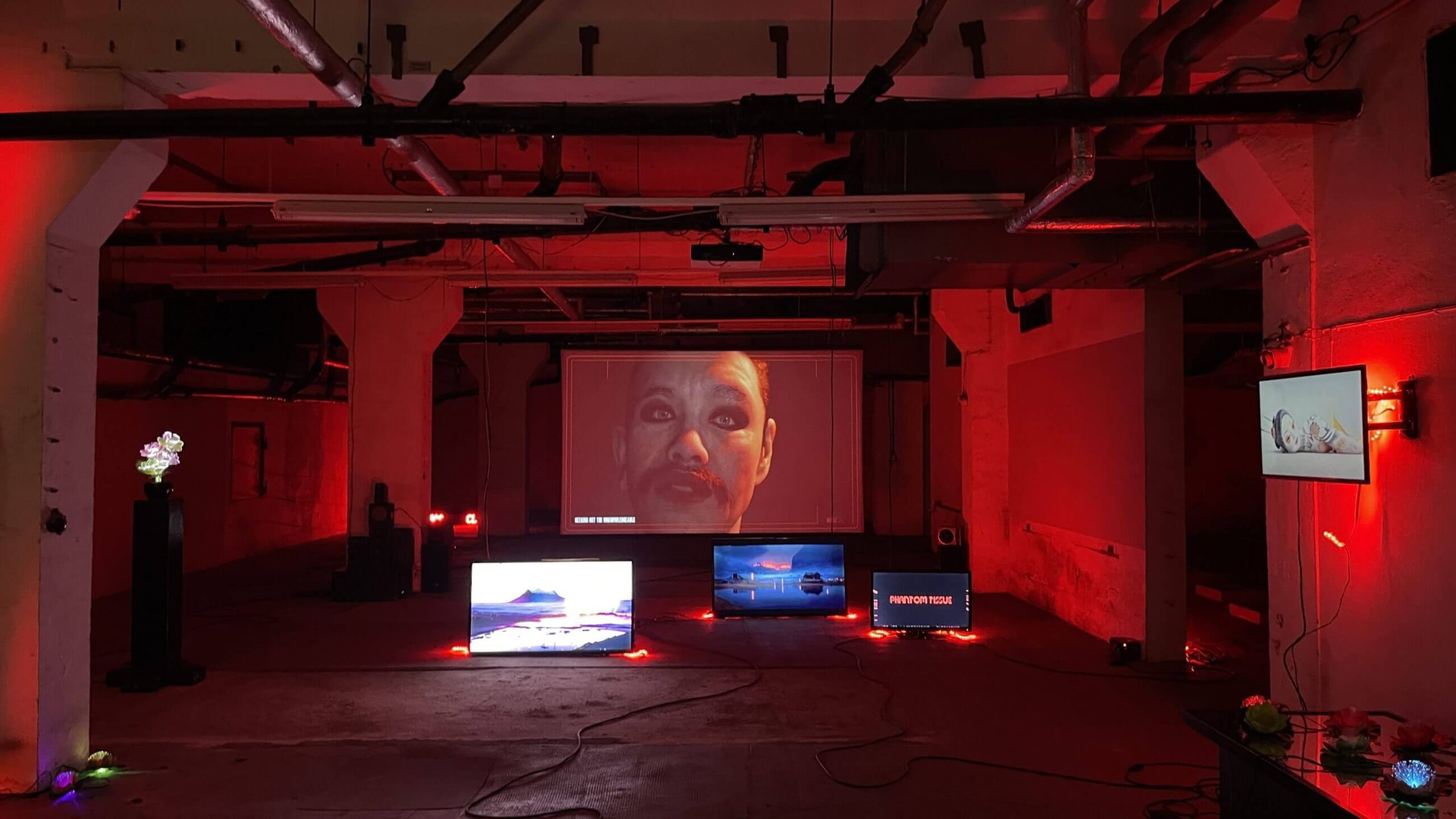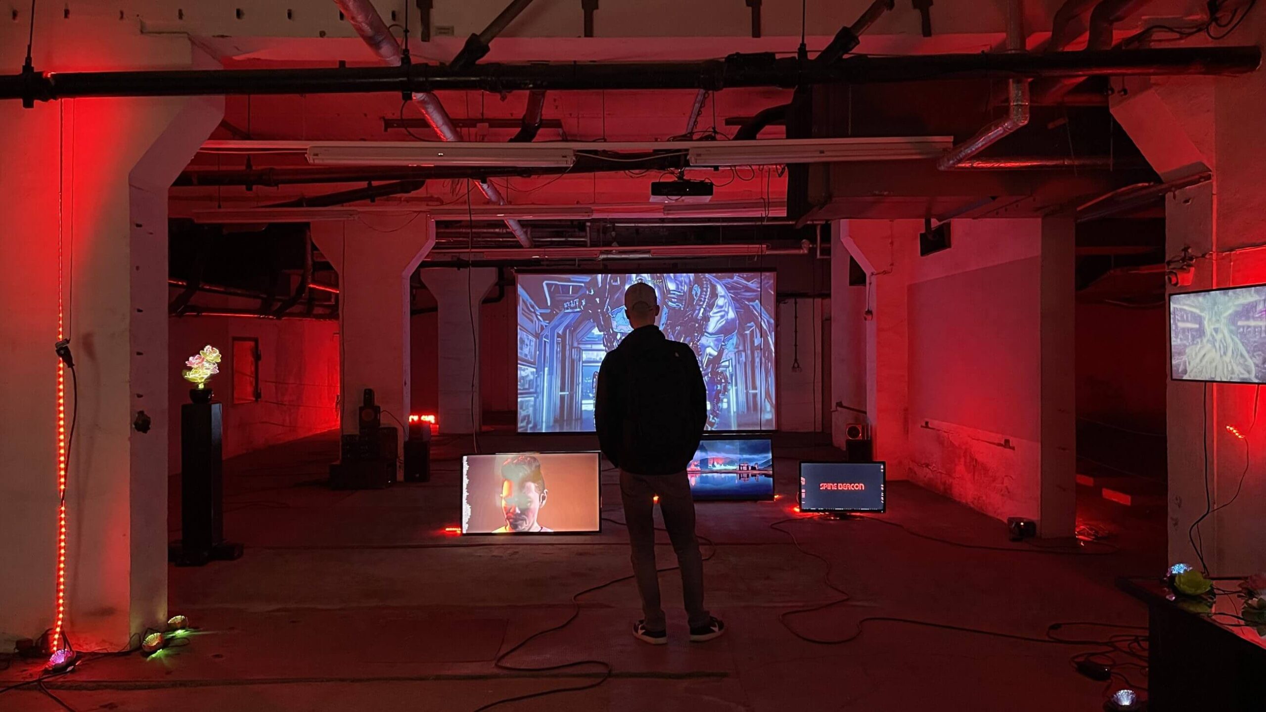 The installation at the Ostrale Biennale (June 7 – October 5, 2025), curated by Drorit Gur Arie, breathes with the fever of neon dreams. Slavin inhabits a subterranean void and transforms it into a techno-mystical altar. Everything vibrates, there is no stillness, only an unceasing stream of images, sounds, presences. We don’t walk, we float, as if immersed in a liquid architecture where every step is an algorithmic decision. The virtual bodies on screen, avatars in decay or transformation, don’t comfort. They question, unsettle, sometimes seduce. At the center stands Radiant, an androgynous, hyper-real figure that embodies ambiguity, both puppet and oracle, mask and emerging consciousness, instrument and prophet.