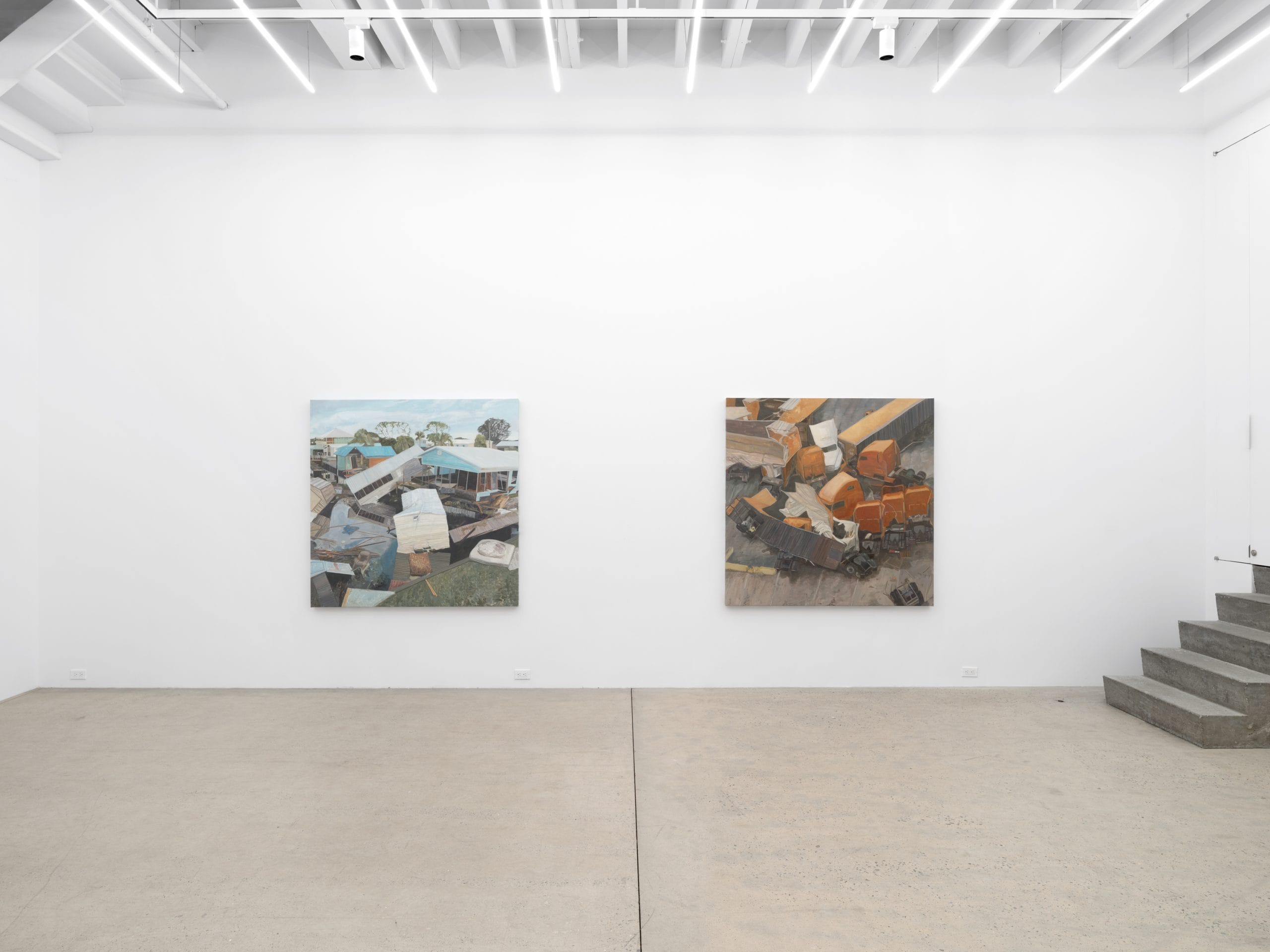 There’s an unsettling energy in how he renders materials, the way a metal roof buckles, the way a wall splinters into jagged shards. This isn’t Hollywood-style destruction, it’s slow, inevitable decay. His painting breathes and accumulates, a process that stands in direct opposition to the instantaneity of AI-generated imagery. These aren’t pixels arranging themselves into a snapshot, these are layers of paint, decisions made and remade over time.