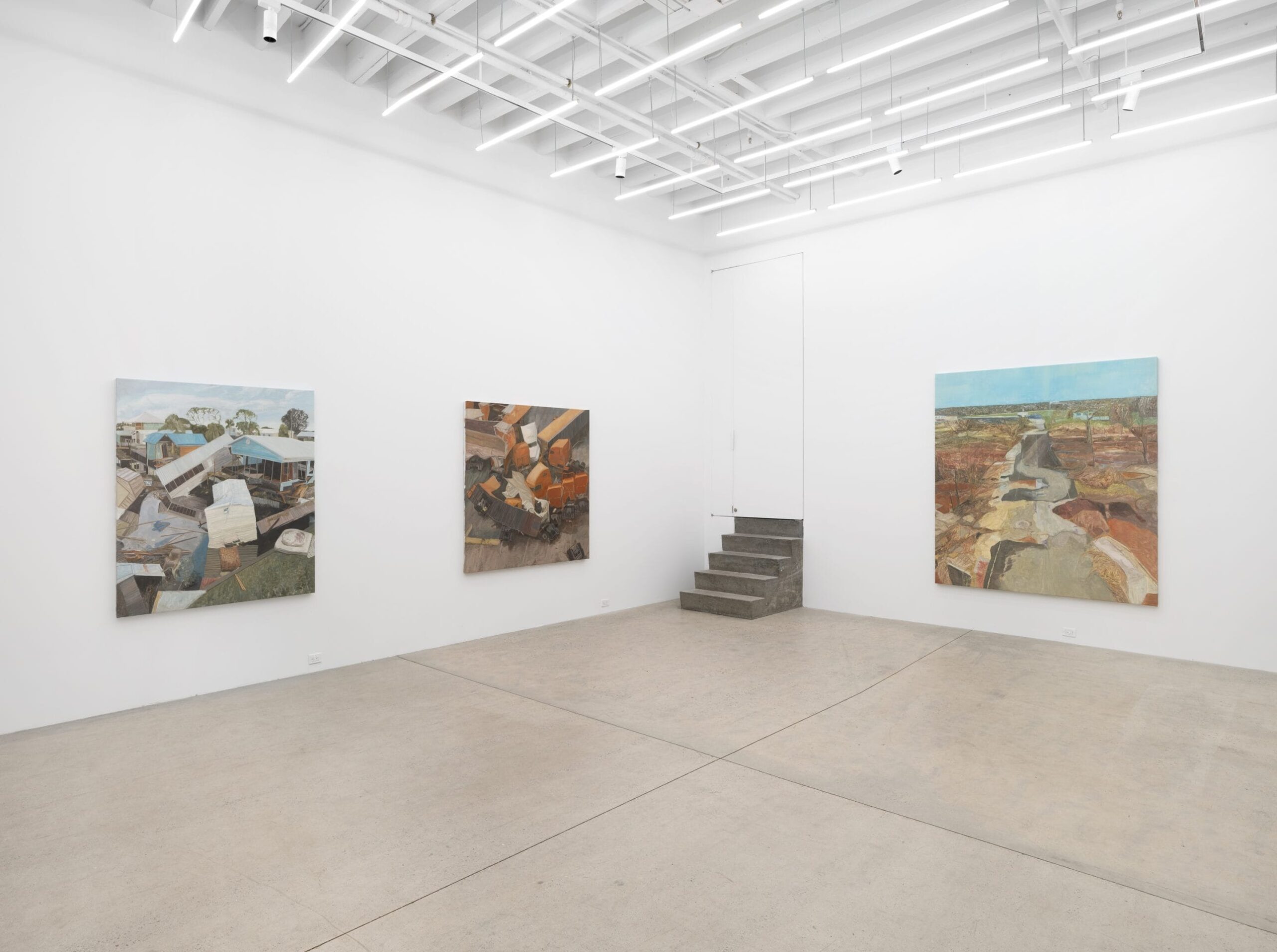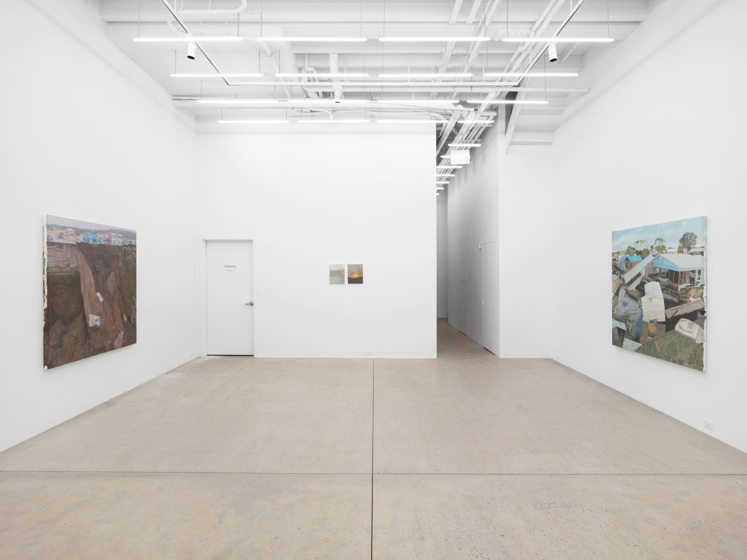 Stepping into the Lower Level of Magenta Plains, we immediately sense a strange familiarity, like walking into a space that should make sense but doesn’t. The perspectives, the colors, the compositions, everything feels slightly off-kilter, teetering between recognition and unease. Rexy Tseng’s exhibition, Mouthful of Dirty Copper, is an ode to unspectacular destruction, to those structural failures that don’t make headlines but speak volumes about a world in perpetual disintegration.