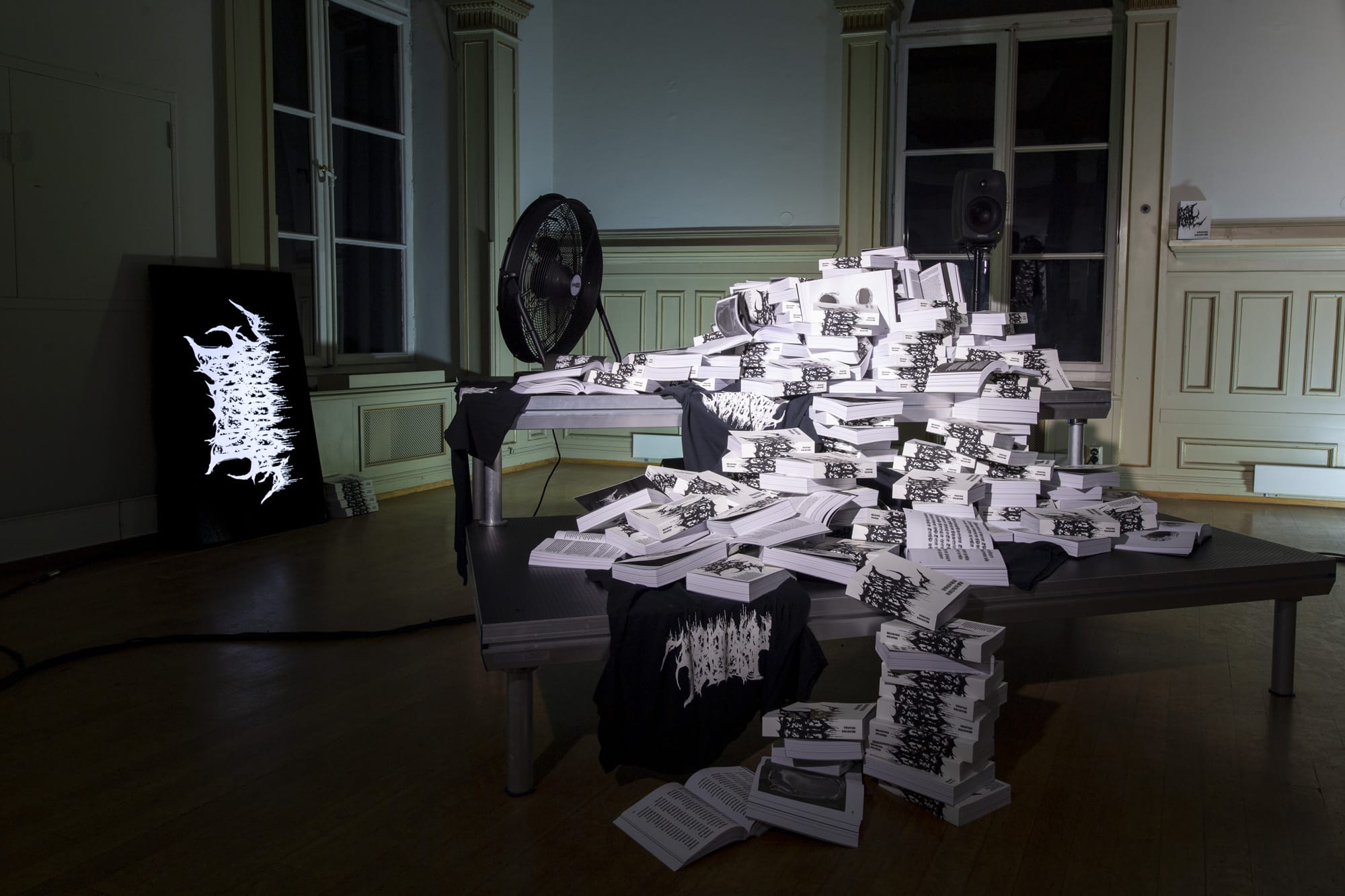 On the screens appears text that has been translated into a completely illegible typeface, specially commissioned for the project. Letters are warped and corrupted, twisted into unreadable scribbles. Their forms are visually inspired by the illegible styles of Black Metal logos. A logo of the exhibition’s title, Infernal Monologue, flies on a flag outside the exhibition, appears on video screens, is printed on band t-shirts strewn around the exhibition space, and appears on the cover of the 666 copies of the Infernal Monologue Exhibition reader. The book, which is 666 pages long—the number of the beast—contains theoretical and conceptual material on which the project is based, translated into the illegible forms. These incomprehensible signs cannot be explained with simple words or rationalised with reason but felt as an irritating itch in the throat, a flicker on the screen, or a rattle in the stereo. While it is deeply human to follow what one already knows—common sense without reflection and the glossy language of the comfortable—the discrepant undertones that were always there might eventually bite back.
